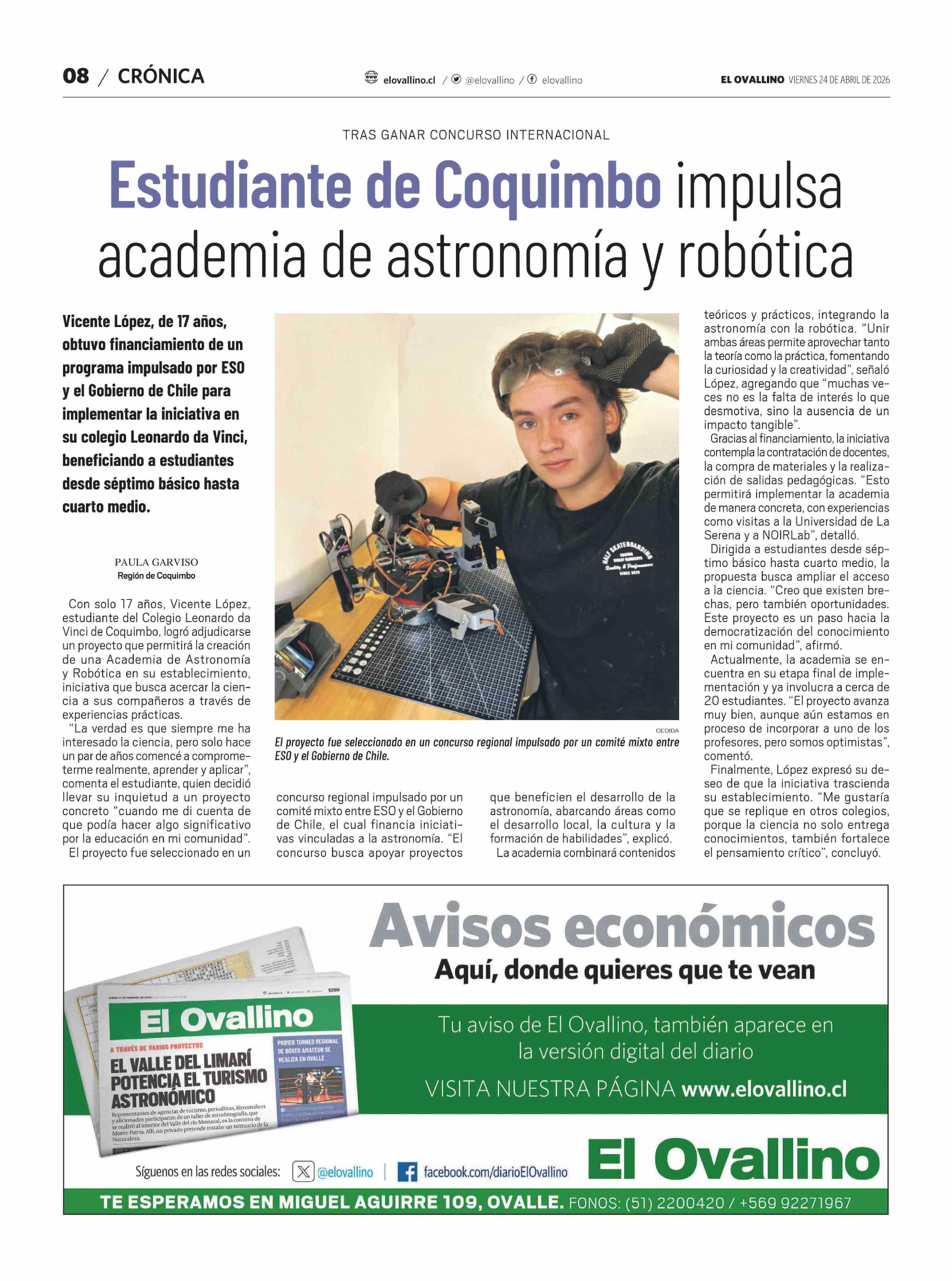 Estudiante de Coquimbo impulsa academia de astronomía y robótica 24-04-2026 El Ovallino |