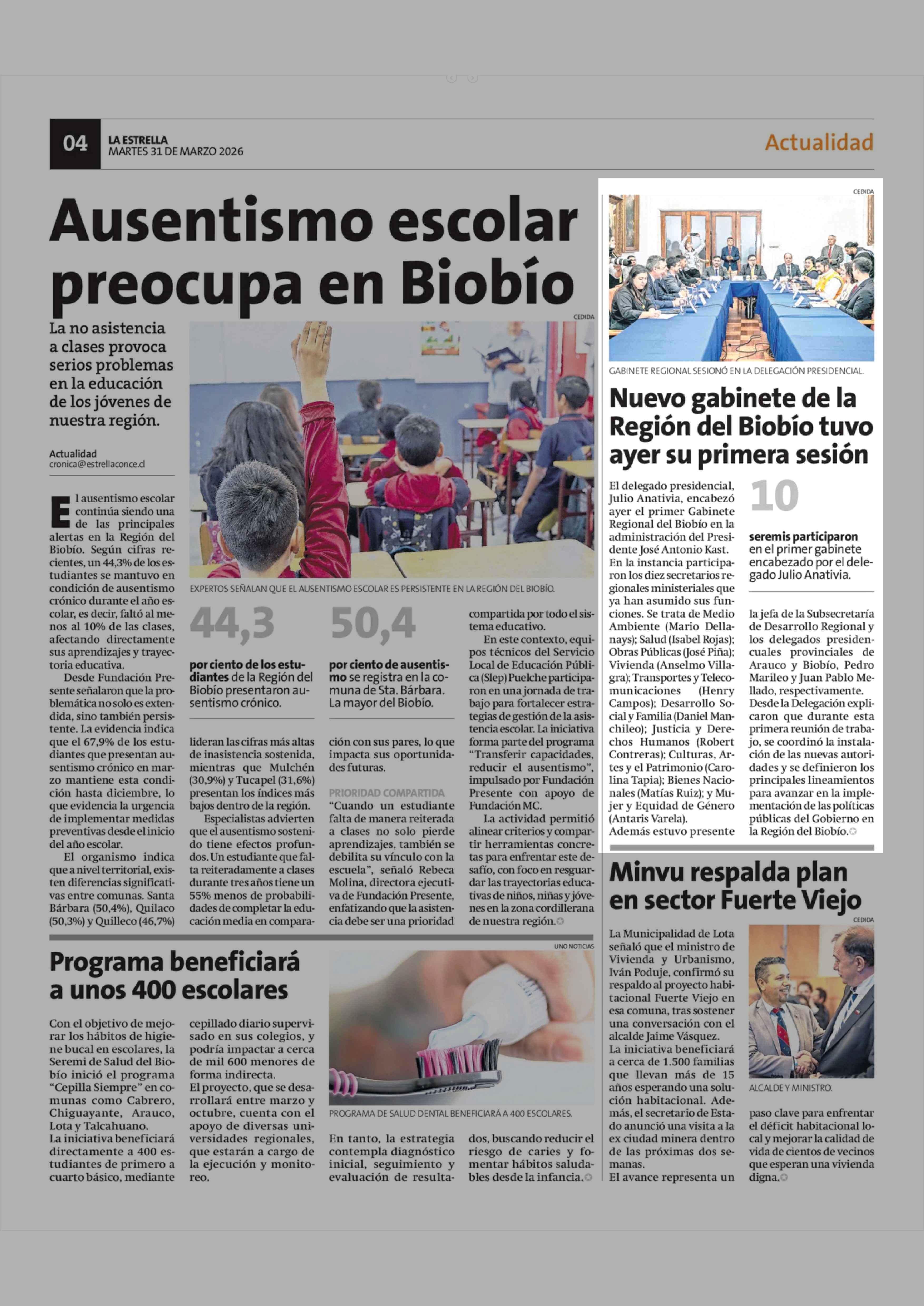 Nuevo gabinete de la Región del Biobio tuvo ayer su primera sesión 31-03-2026 La Estrella de Concepción |