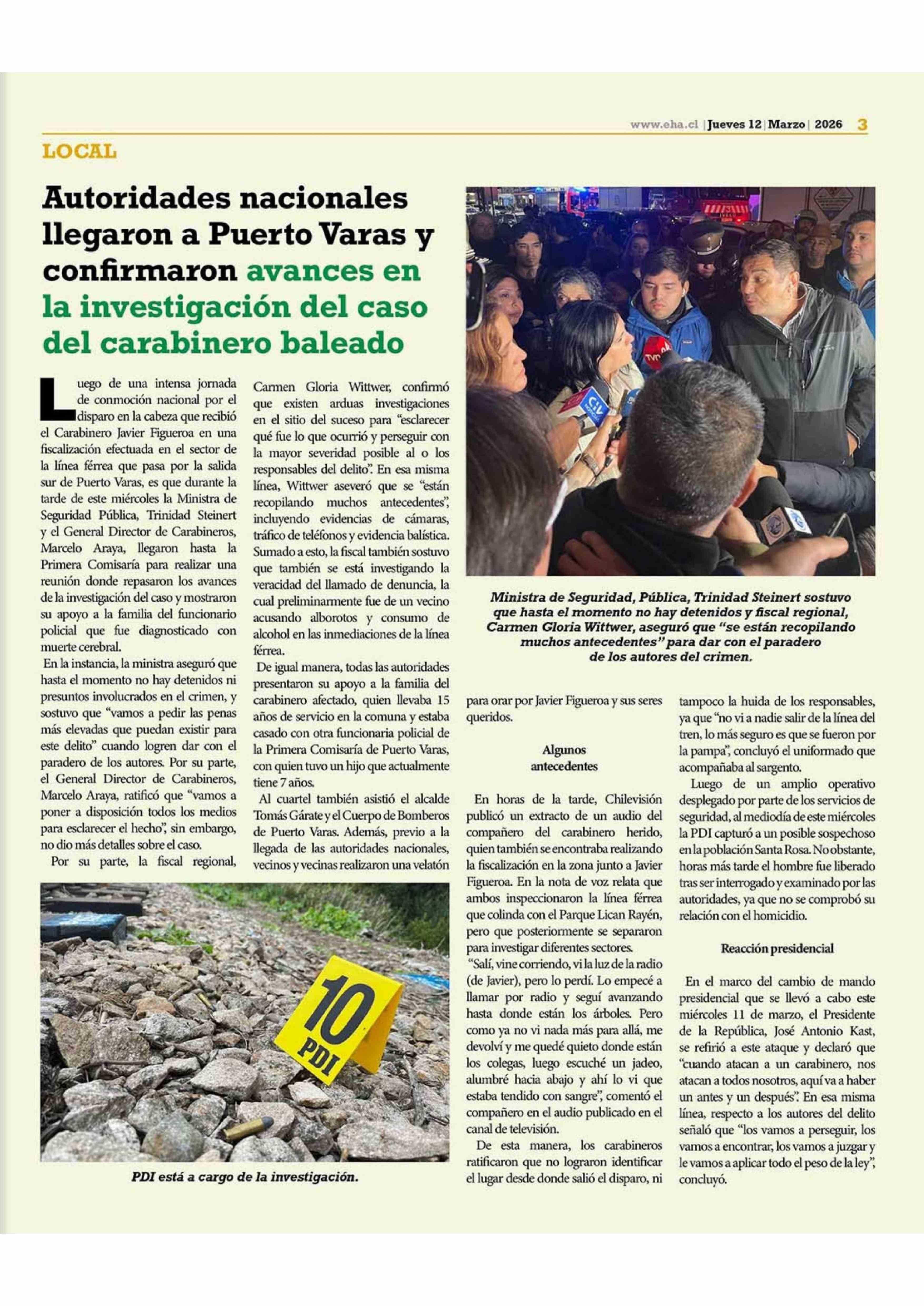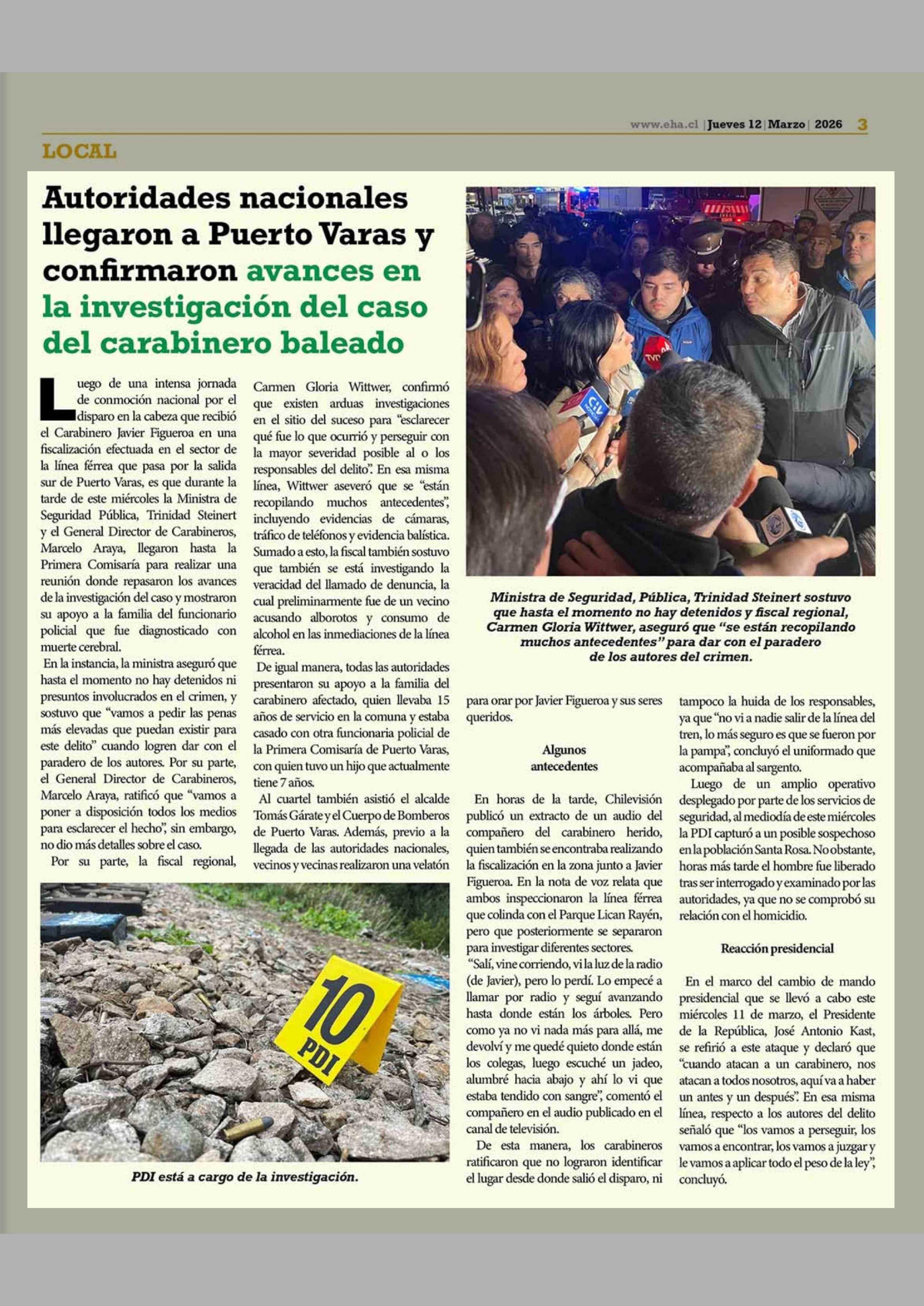 Autoridades nacionales llegaron a Puerto Varas y confirmaron avances en la investigación del caso del carabinero baleado 12-03-2026 El Heraldo Austral |