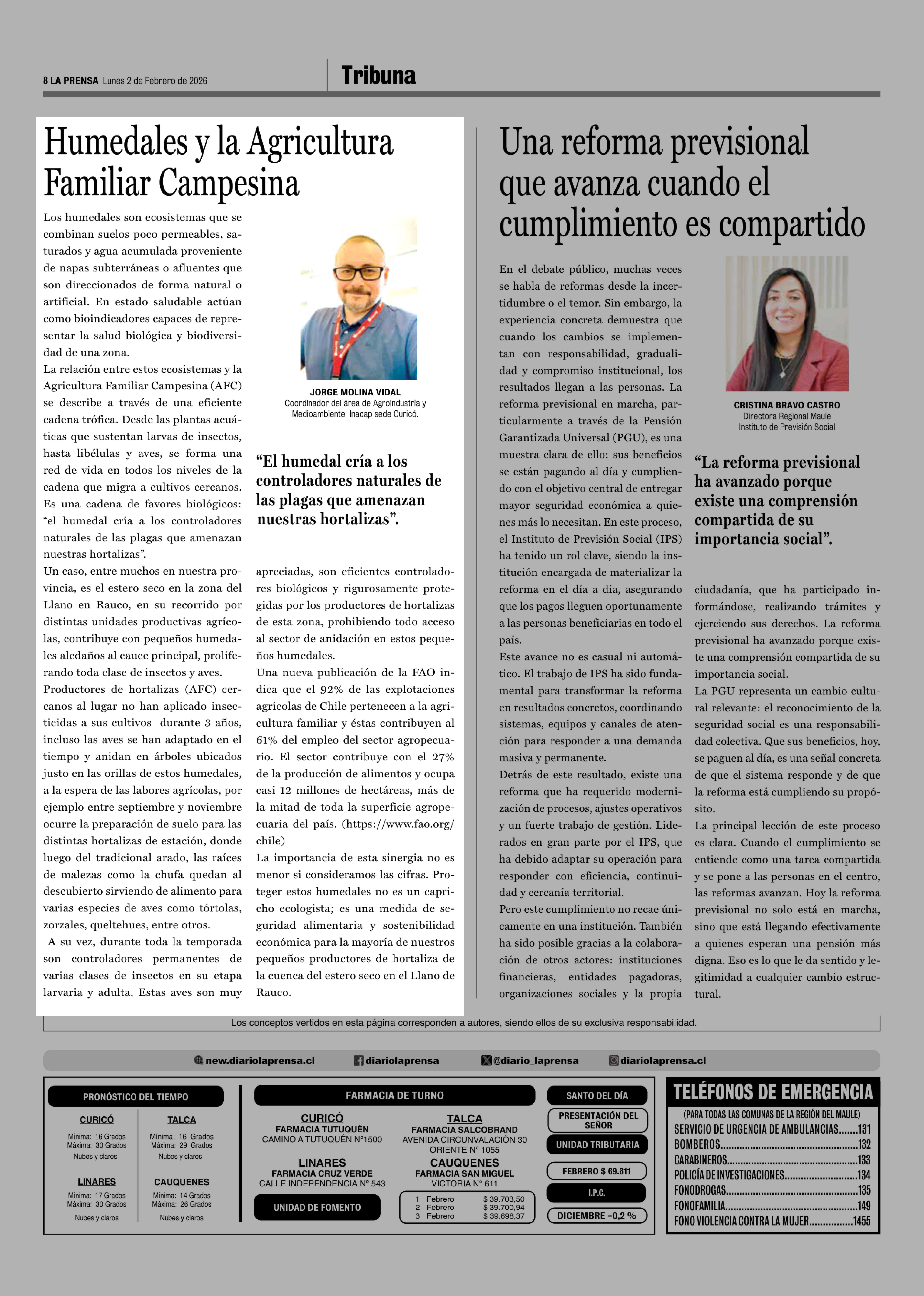 Columnas de Opinión: Humedales y la Agricultura Familiar Campesina 02-02-2026 La Prensa de Curicó |