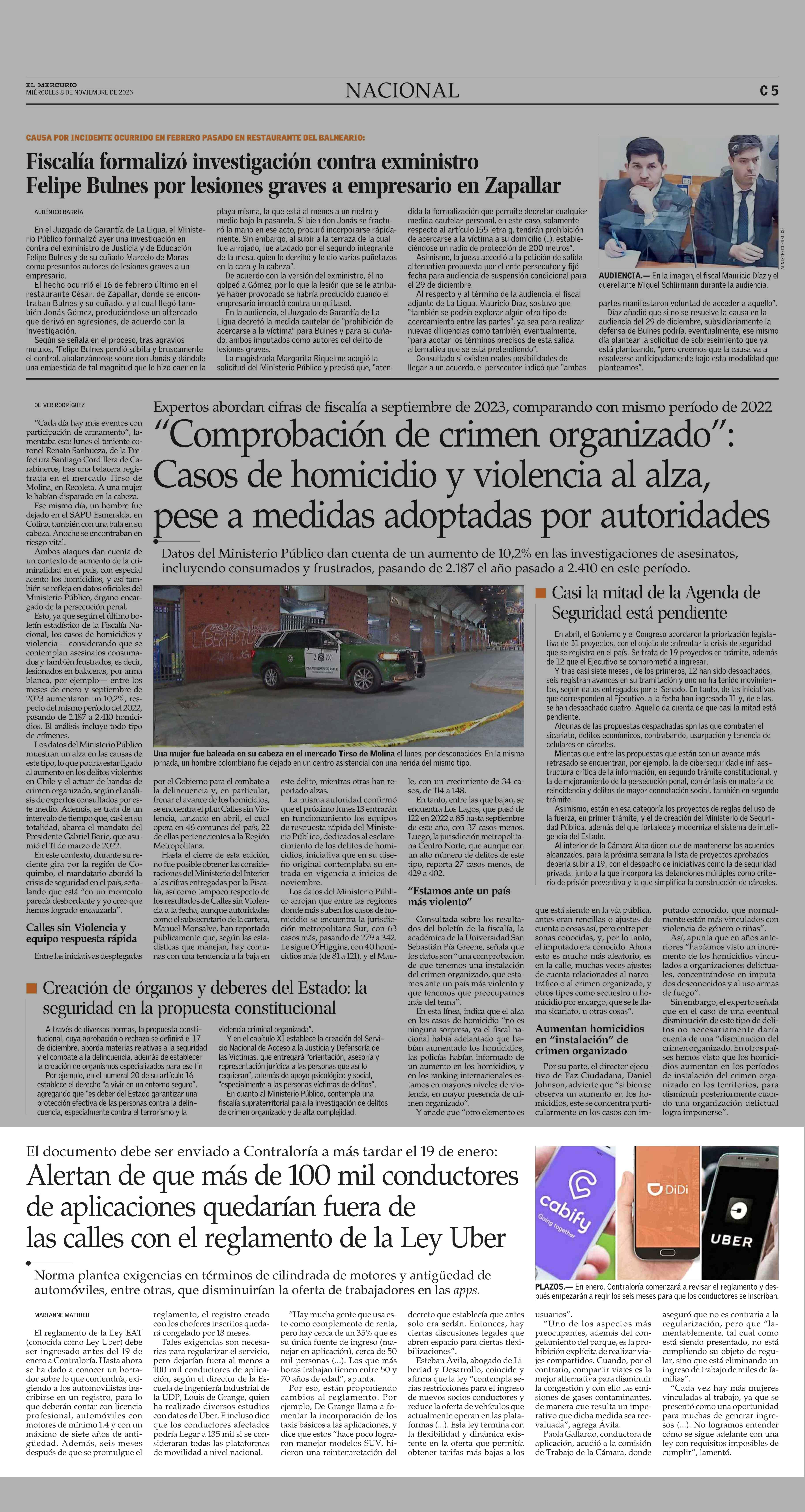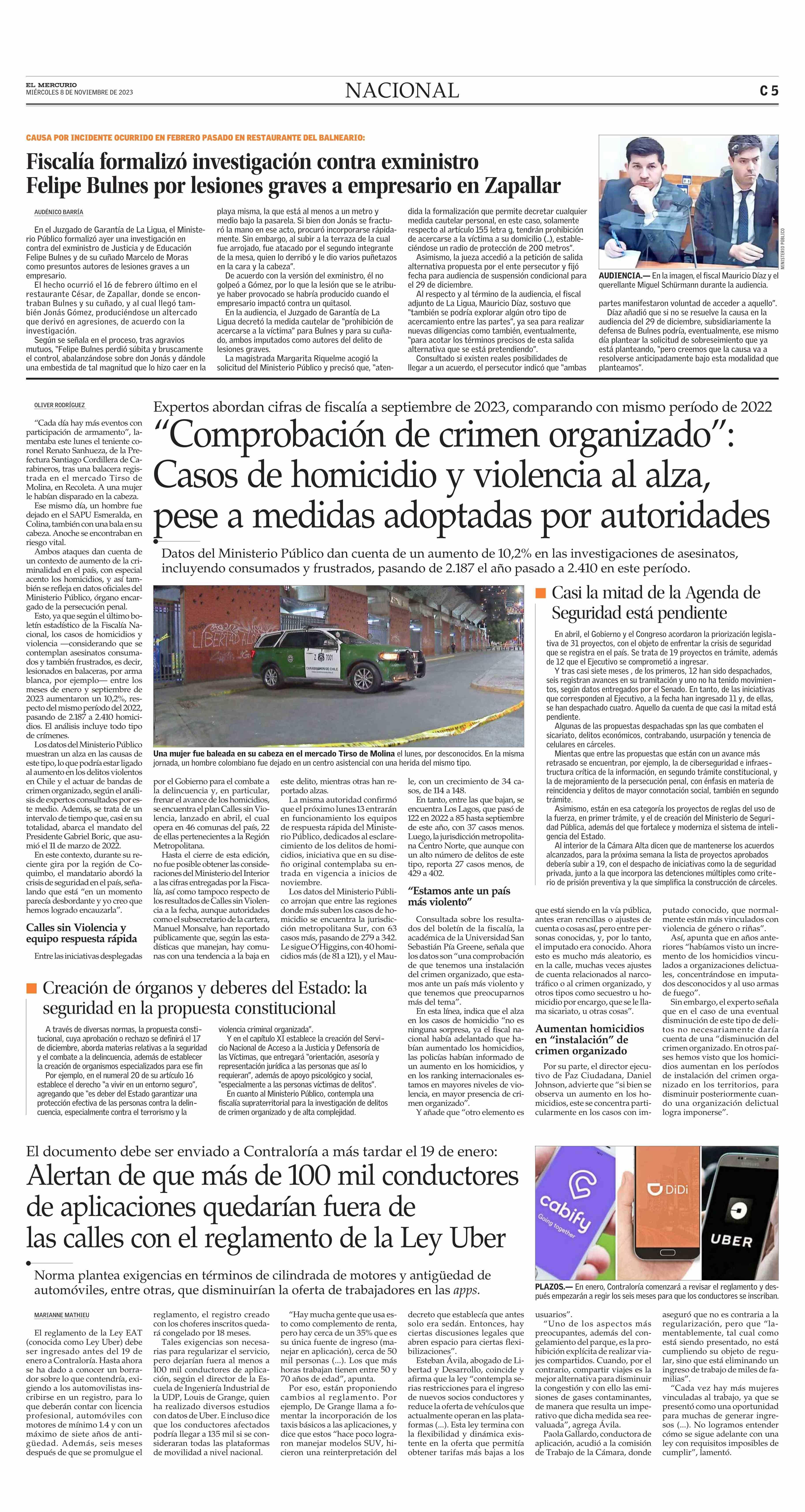 Alertan de que más de 100 mil conductores de aplicaciones quedarían fuera de las calles con el reglamento de la Ley Uber 08-11-2023 El Mercurio |