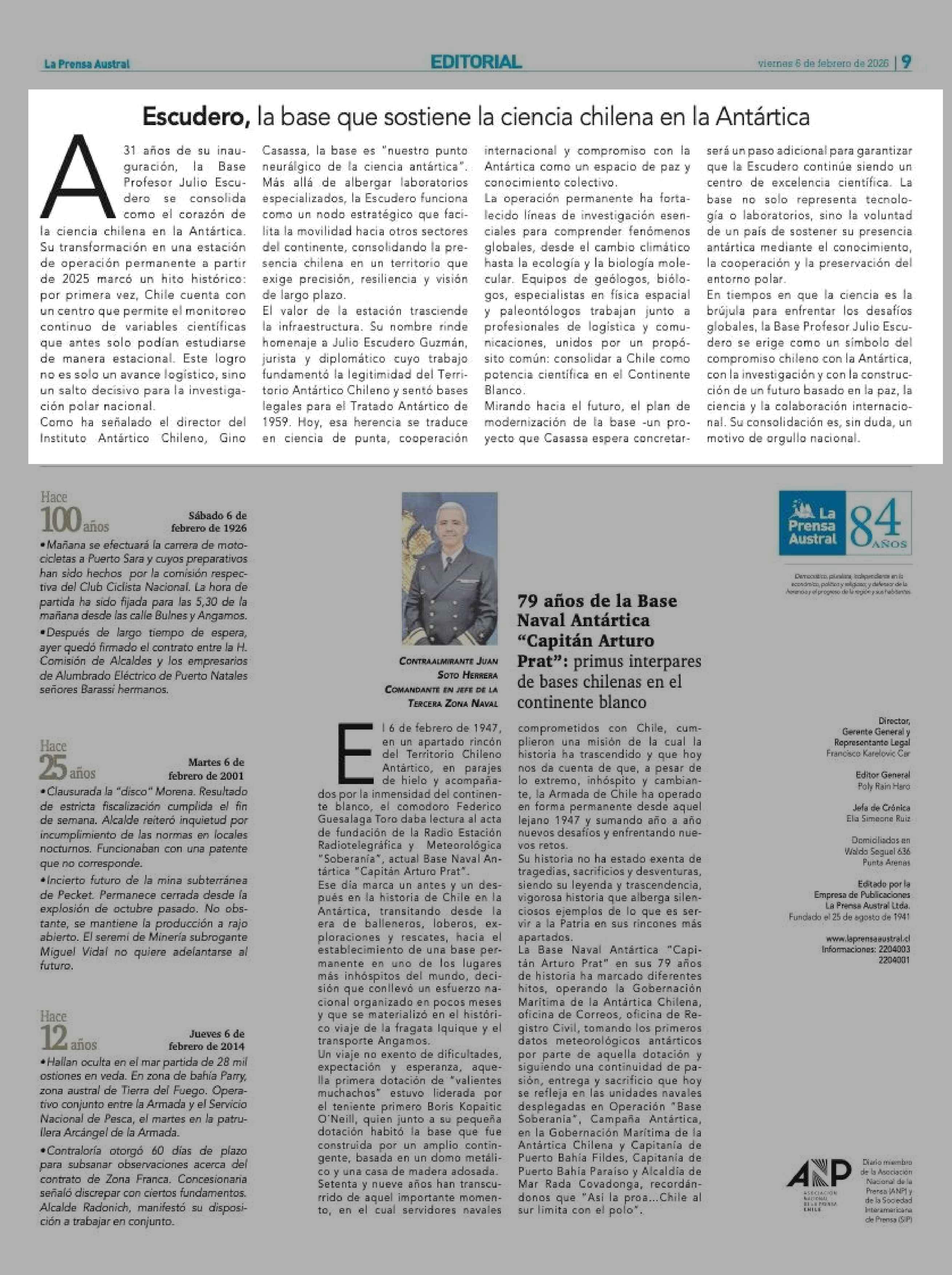 Escudero, la base que sostiene la ciencia chilena en la Antártica 06-02-2026 La Prensa Austral |