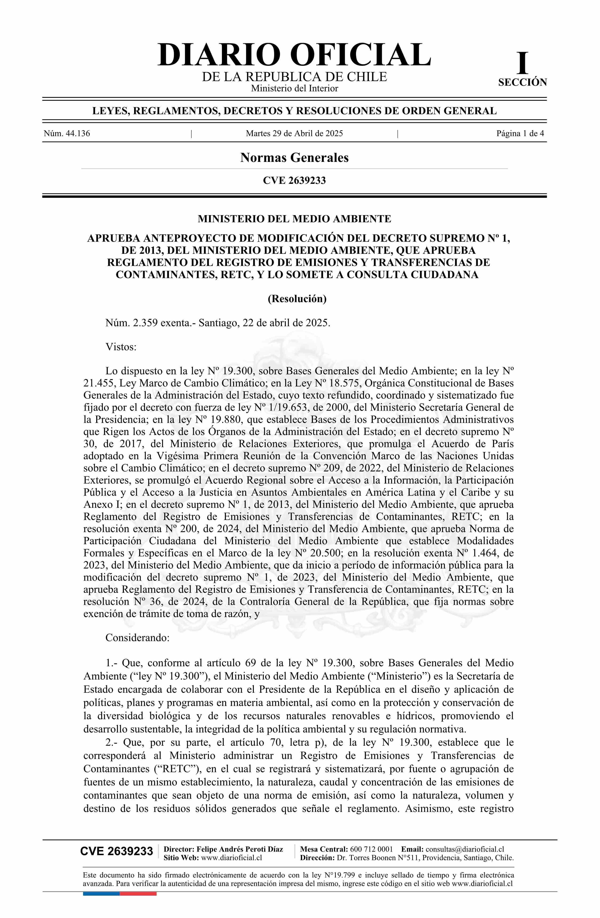 | Título: | Resolución exenta número 2.359, de 2025.- Aprueba anteproyecto de modificación del decreto Nº 1, de 2013, que aprueba Reglamento del Registro de Emisiones y Transferencias de Contaminantes, y lo somete a consulta ciudadana |