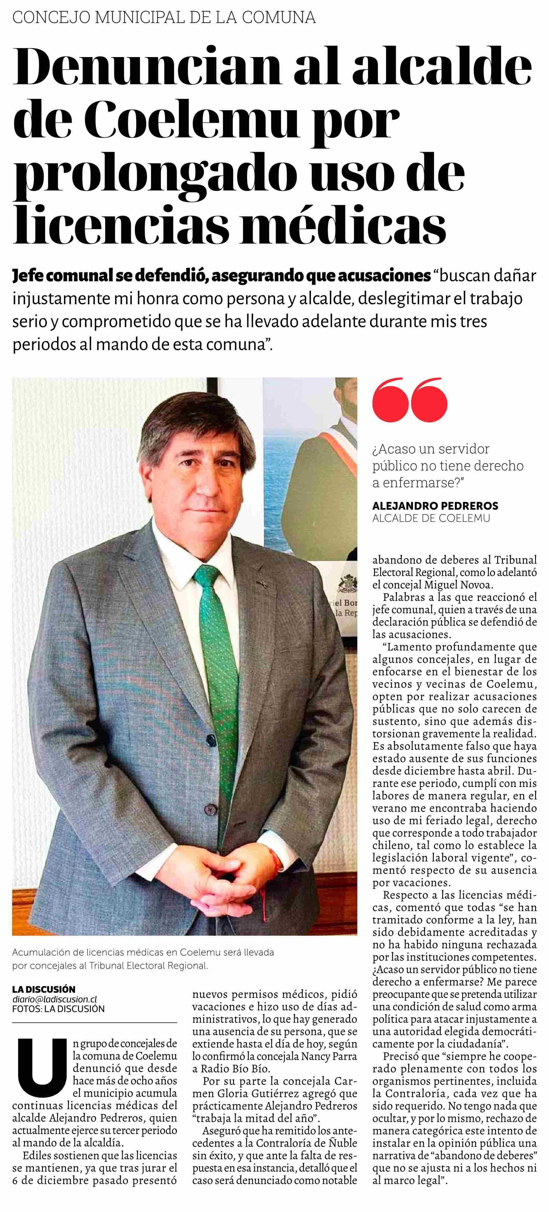 Denuncian al alcalde de Coelemu por prolongado uso de licencias médicas 11-06-2025 La Discusión |
