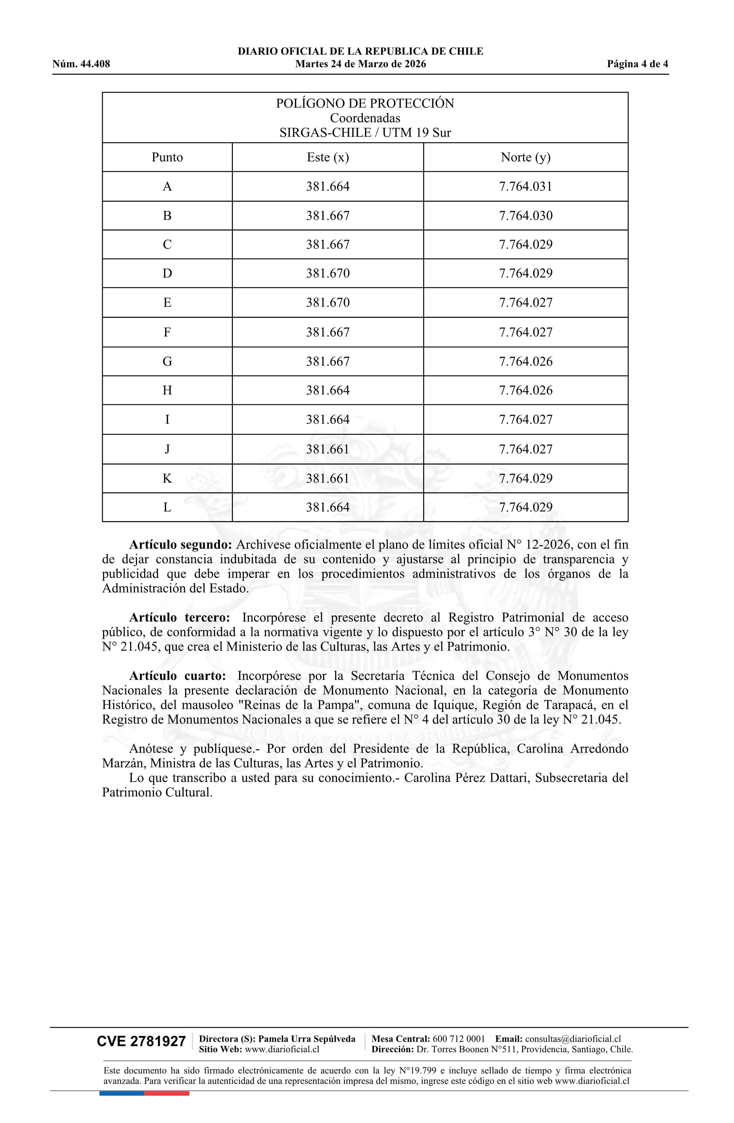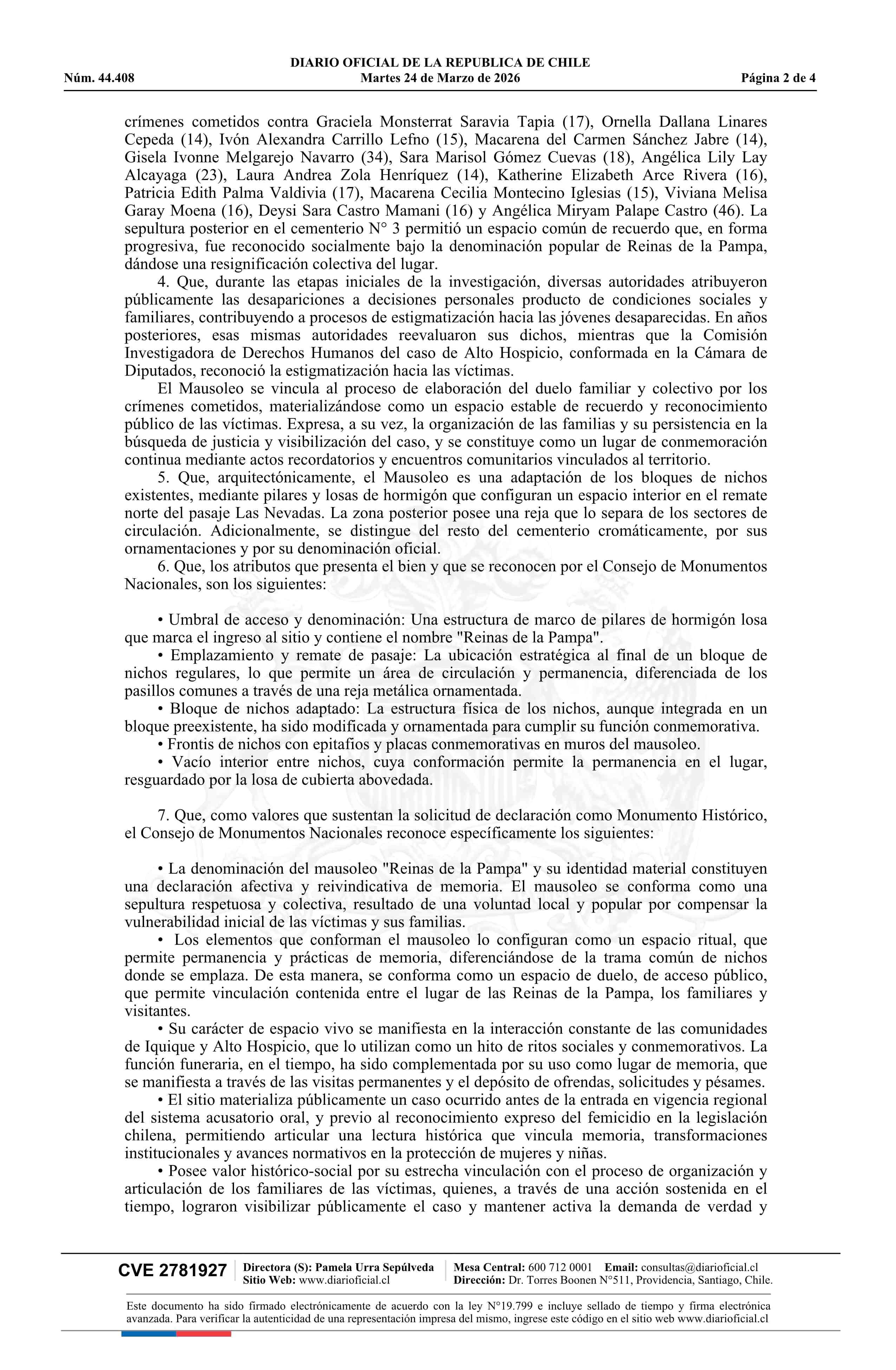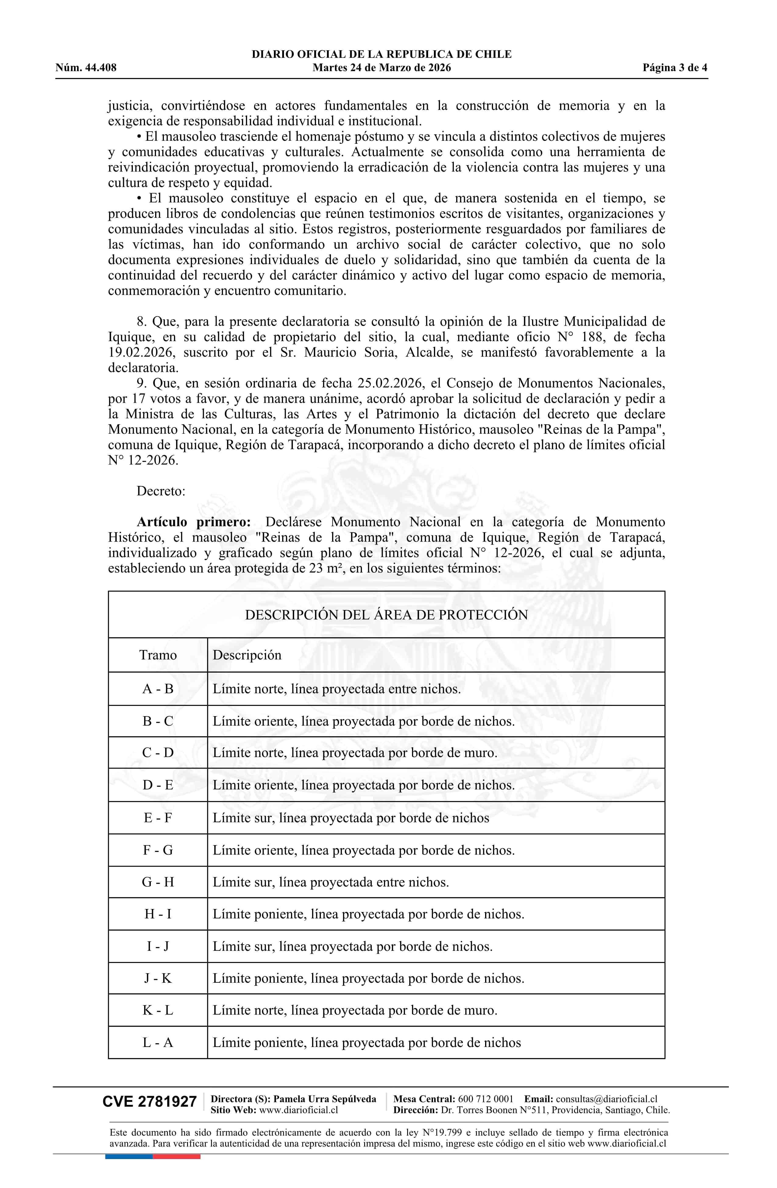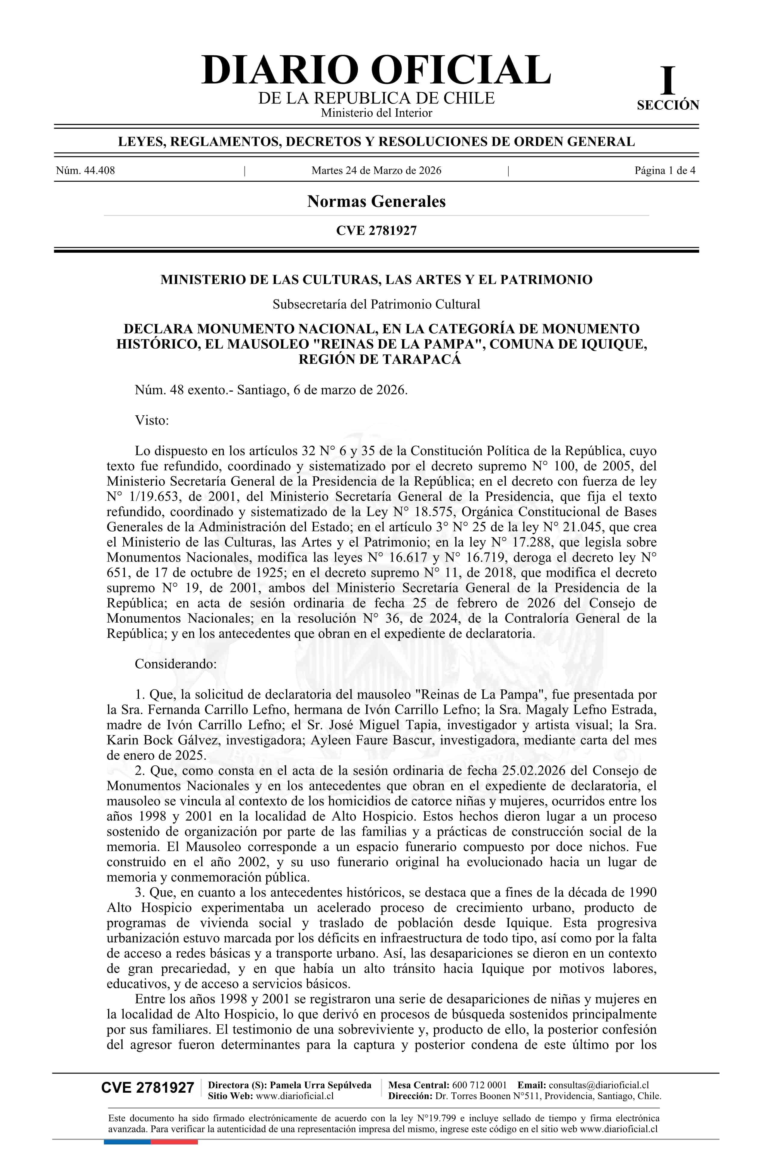 Decreto exento número 48, de 2026.- Declara Monumento Nacional, en la categoría de Monumento Histórico, el mausoleo Reinas de la Pampa, comuna de Iquique, Región de Tarapacá 24-03-2026 Diario Oficial Edición Electrónica |