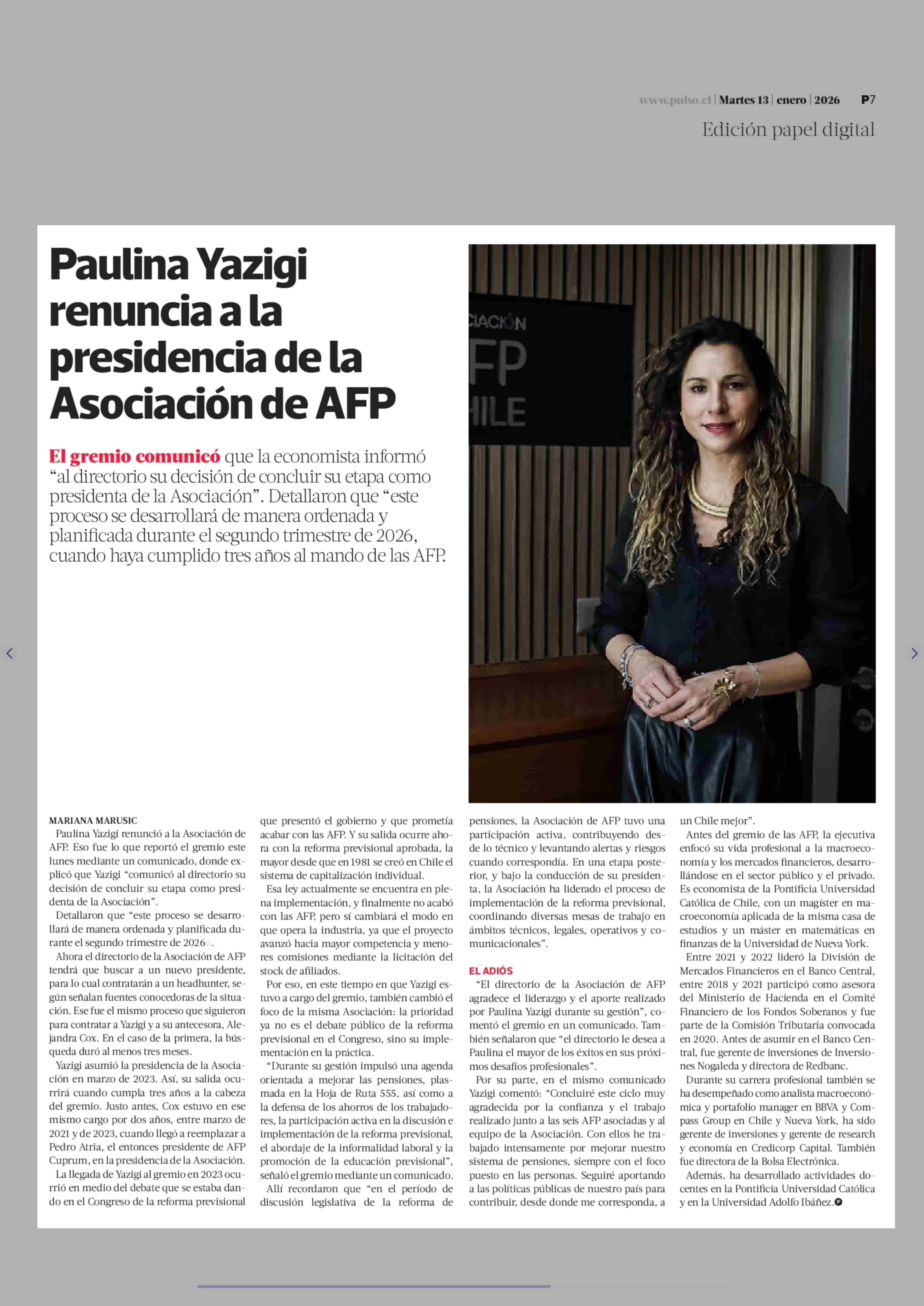 Paulina Yazigi renuncia a la presidencia de la Asociación de AFP 13-01-2026 La Tercera |
