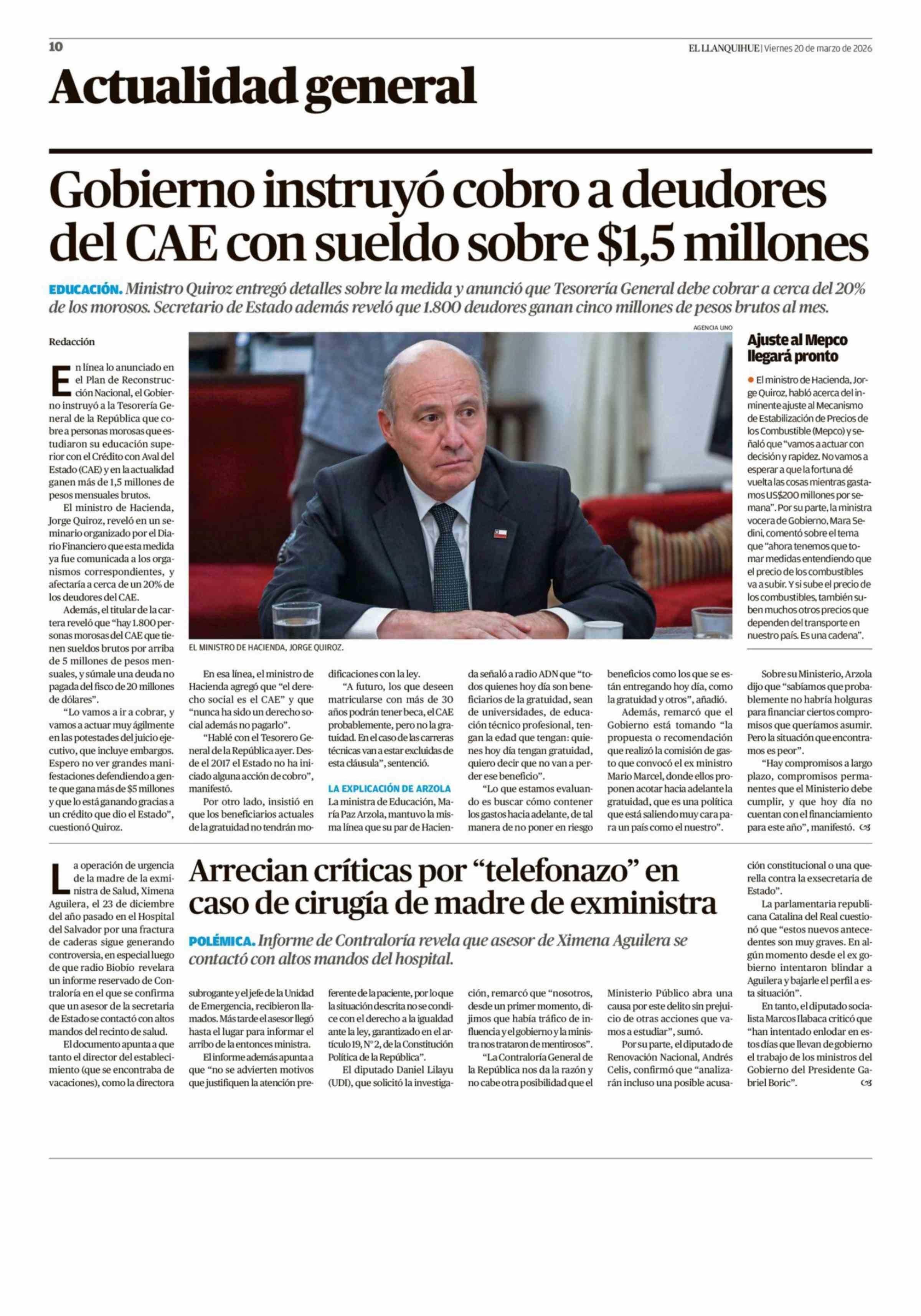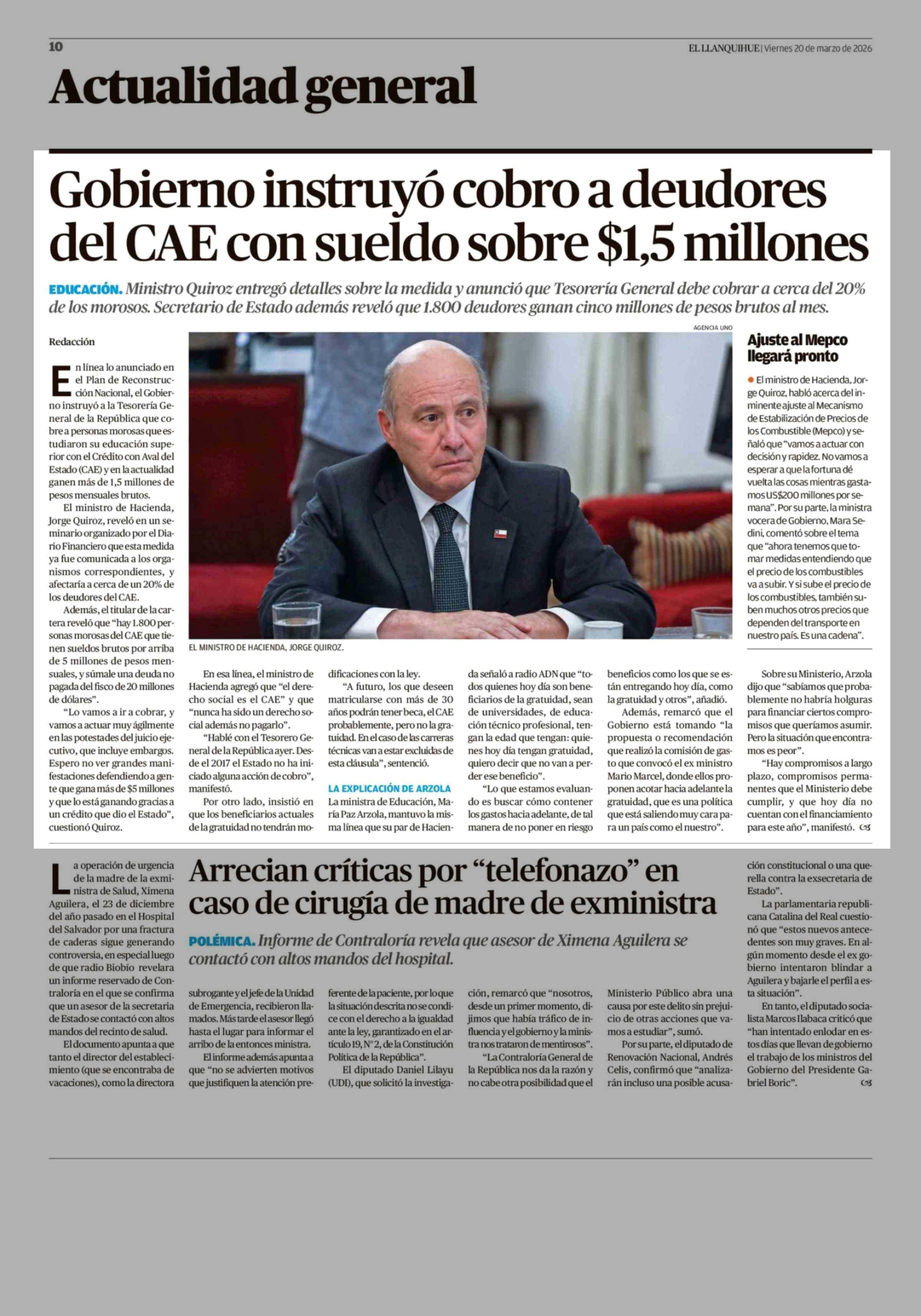Gobierno instruyó cobro a deudores del CAE con sueldo sobre $1,5 millones 20-03-2026 El Llanquihue |