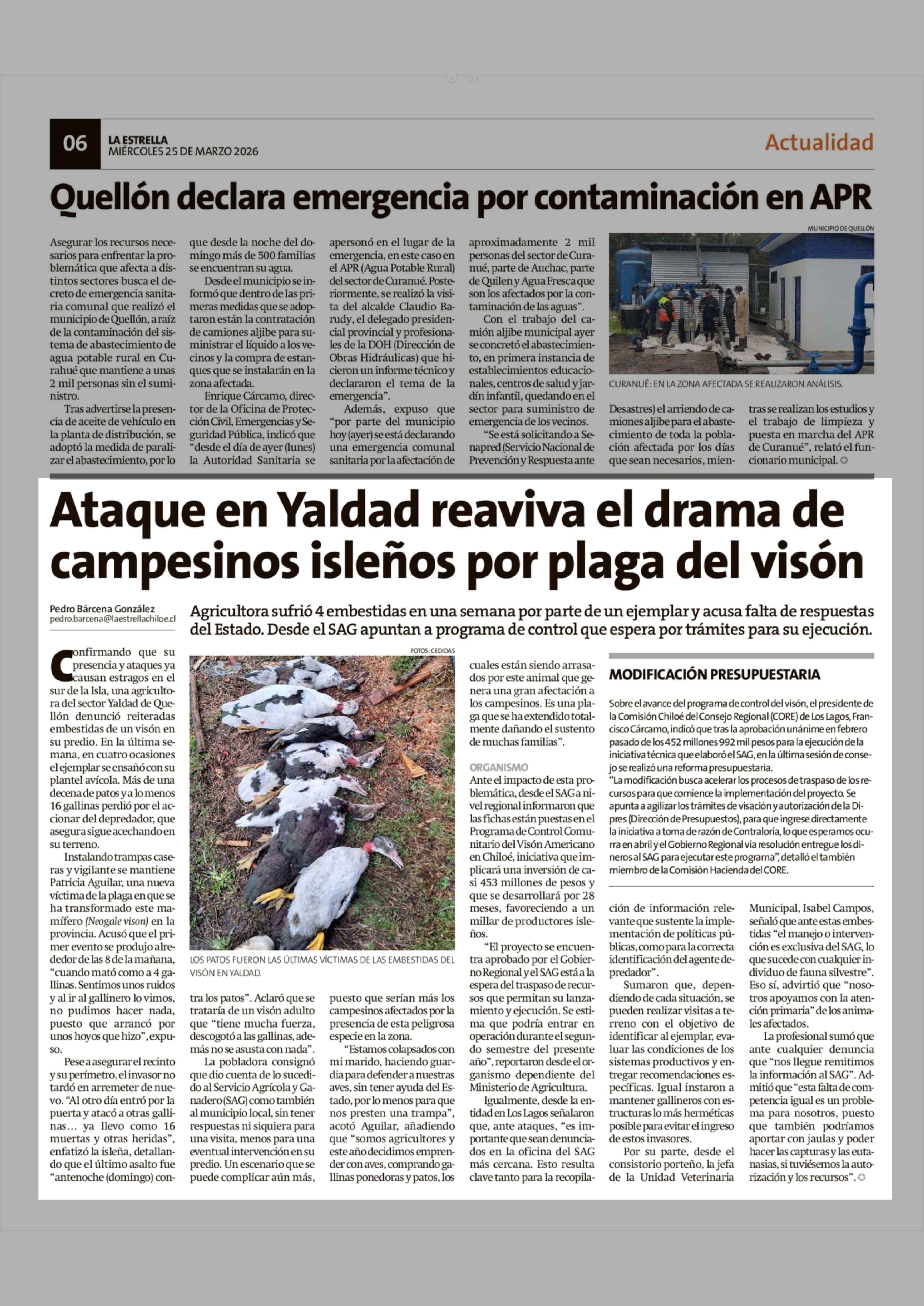 Ataque en Yaldad reaviva el drama de campesinos isleños por plaga del visón 25-03-2026 La Estrella de Chiloé |
