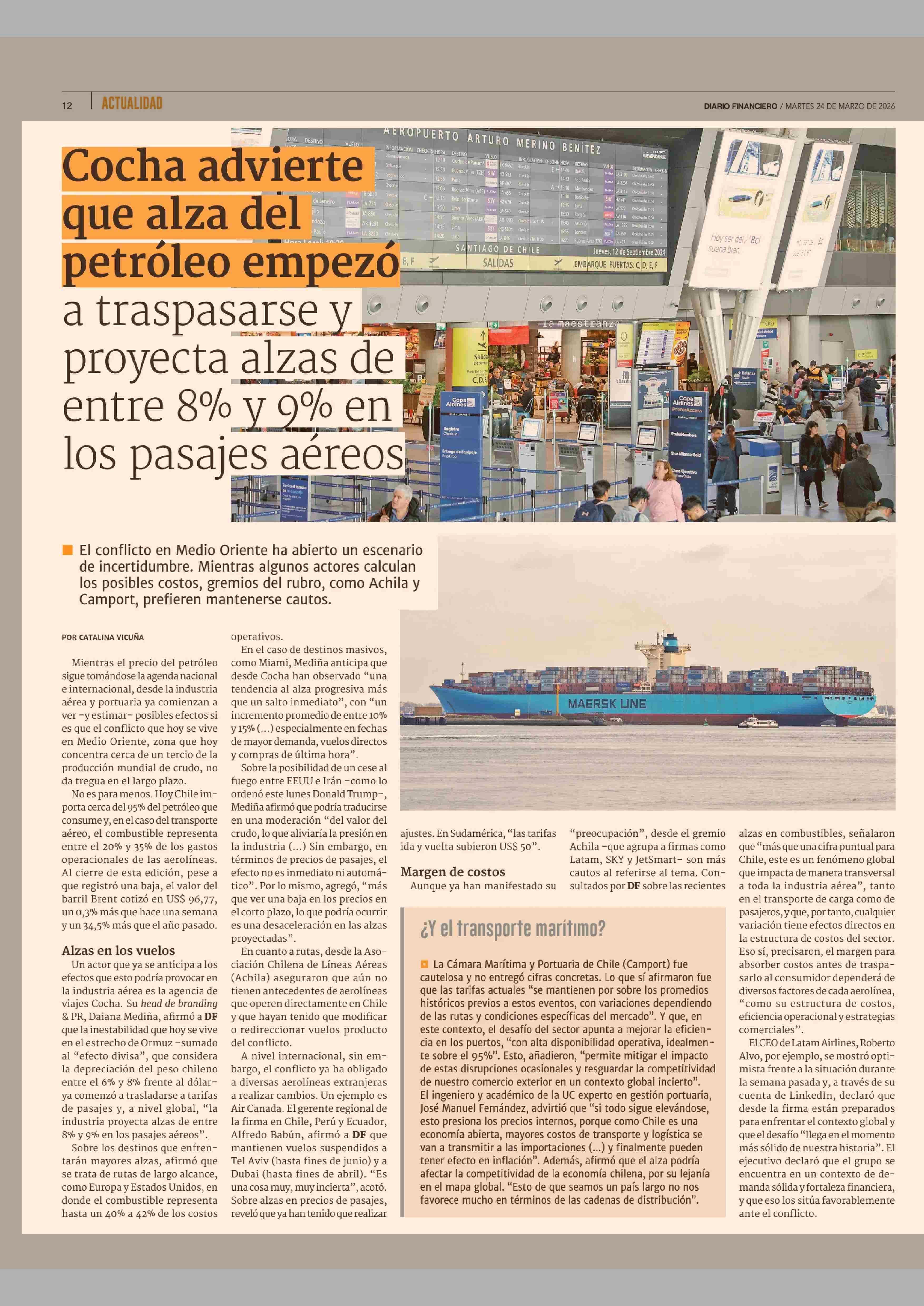 Cocha advierte que alza de petróleo empézó a traspasarse y proyecta alzas de entre 8% y 9% en los pasajes aéreos 24-03-2026 Diario Financiero |