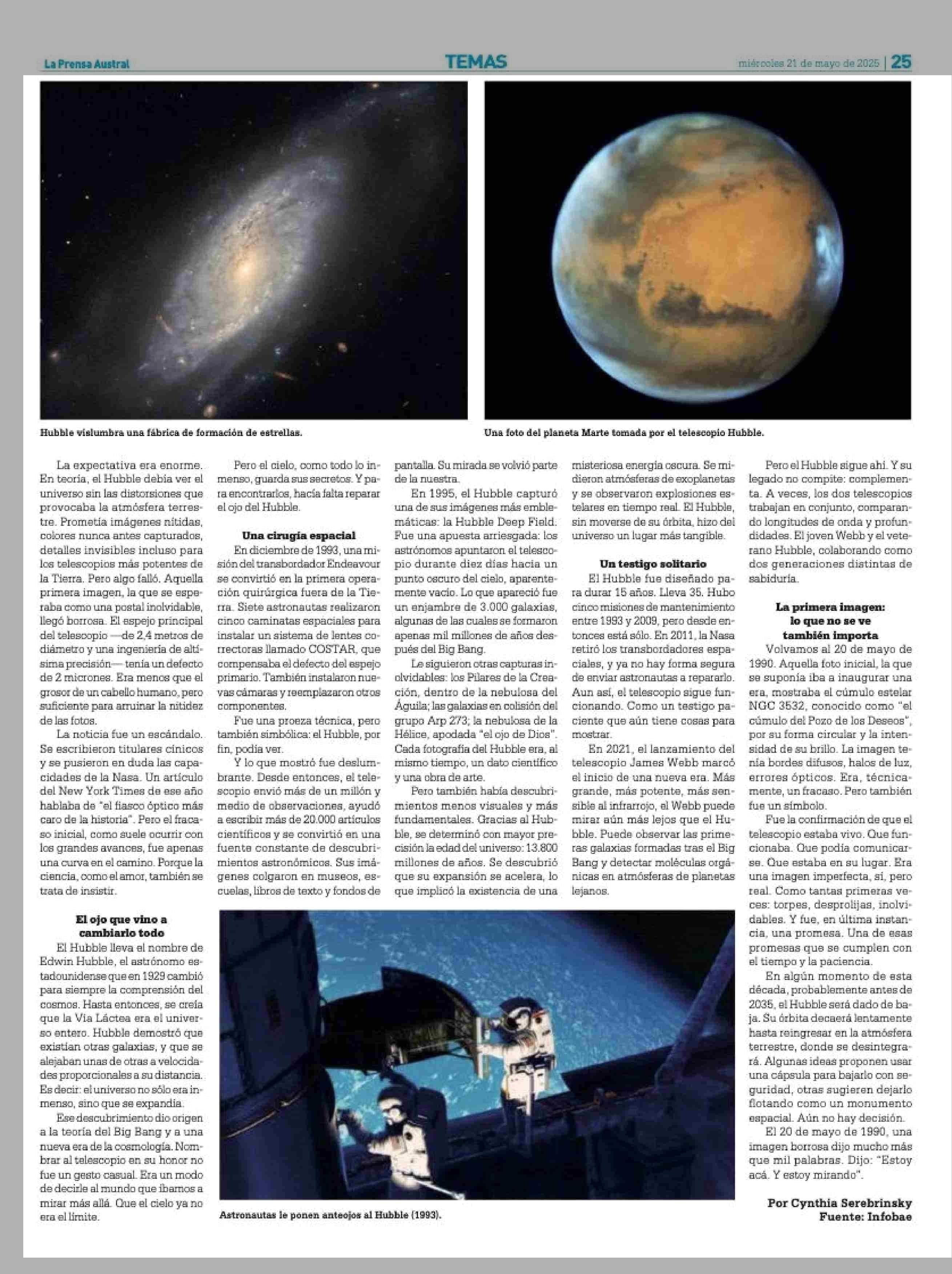 El día que el telescopio Hubble abrió los ojos por primera vez y la humanidad empezó a mirar más lejos en el espacio 21-05-2025 La Prensa Austral |