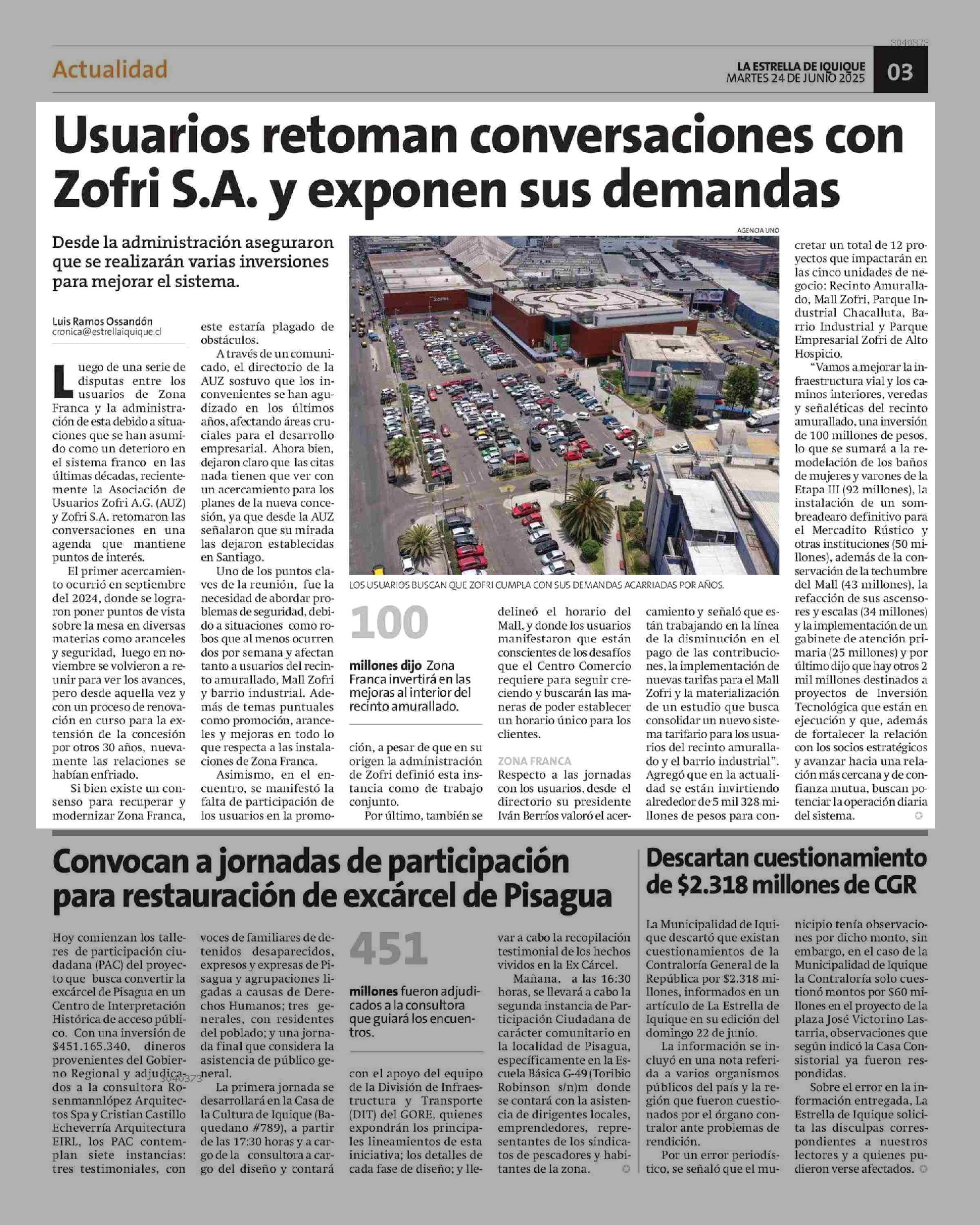 Usuarios retoman conversaciones con Zofri S.A. y exponen sus demandas 24-06-2025 La Estrella de Iquique |