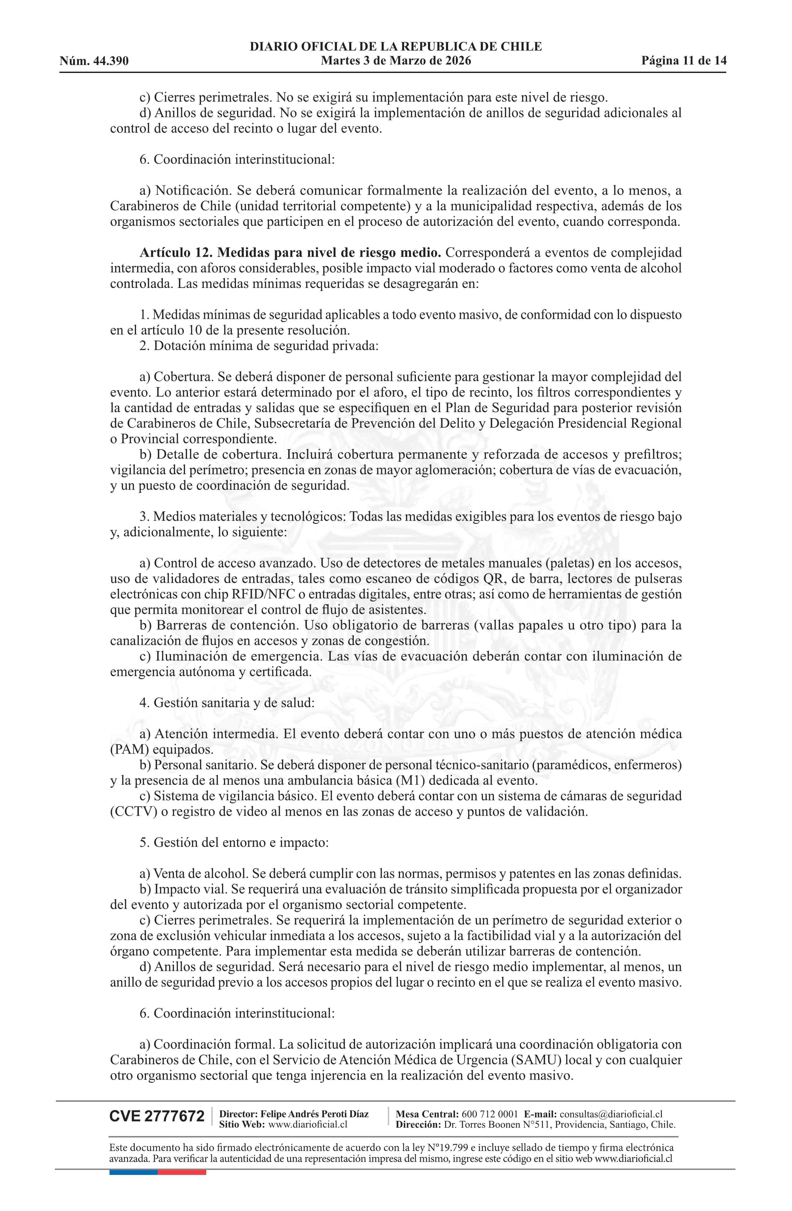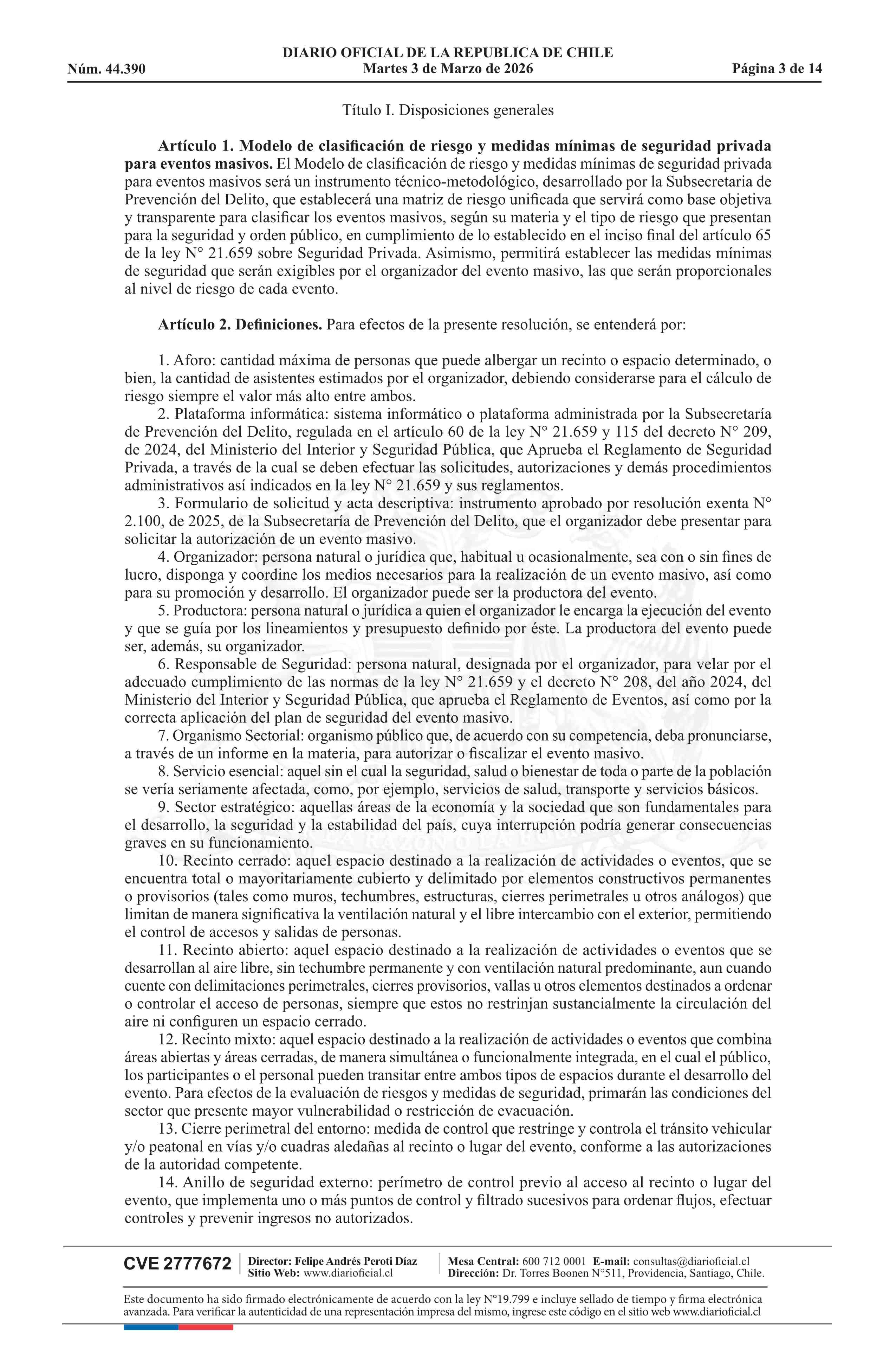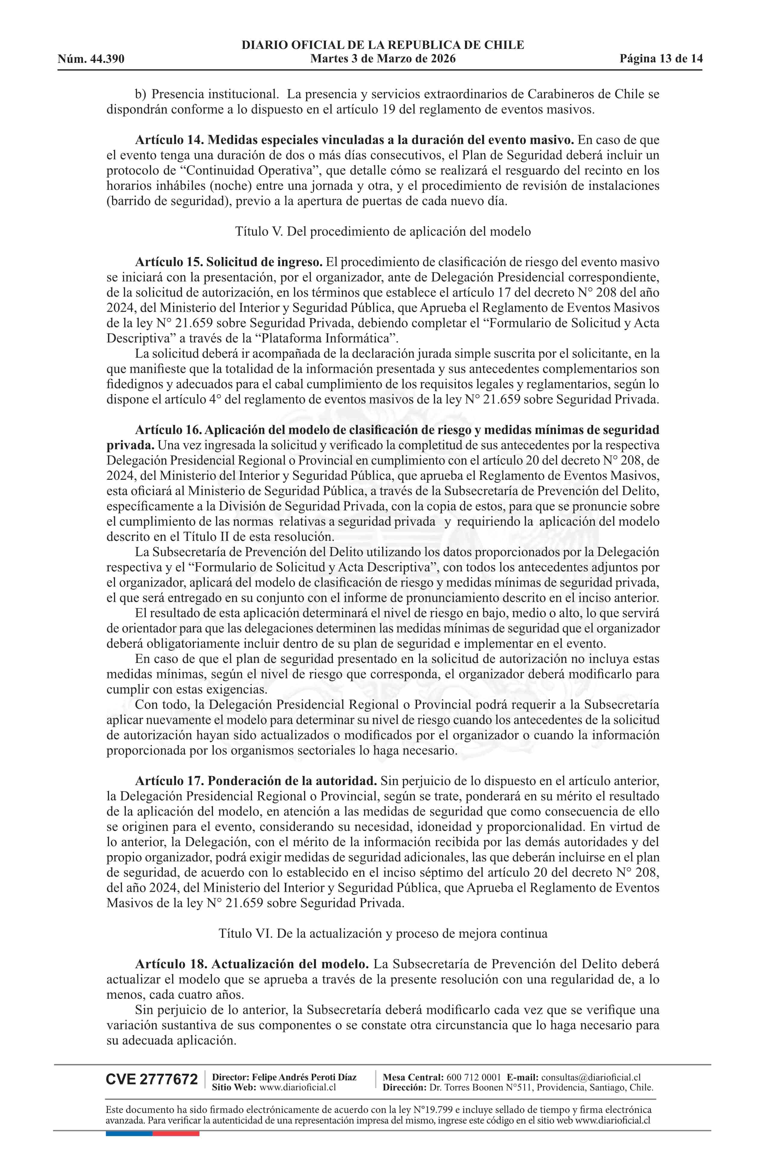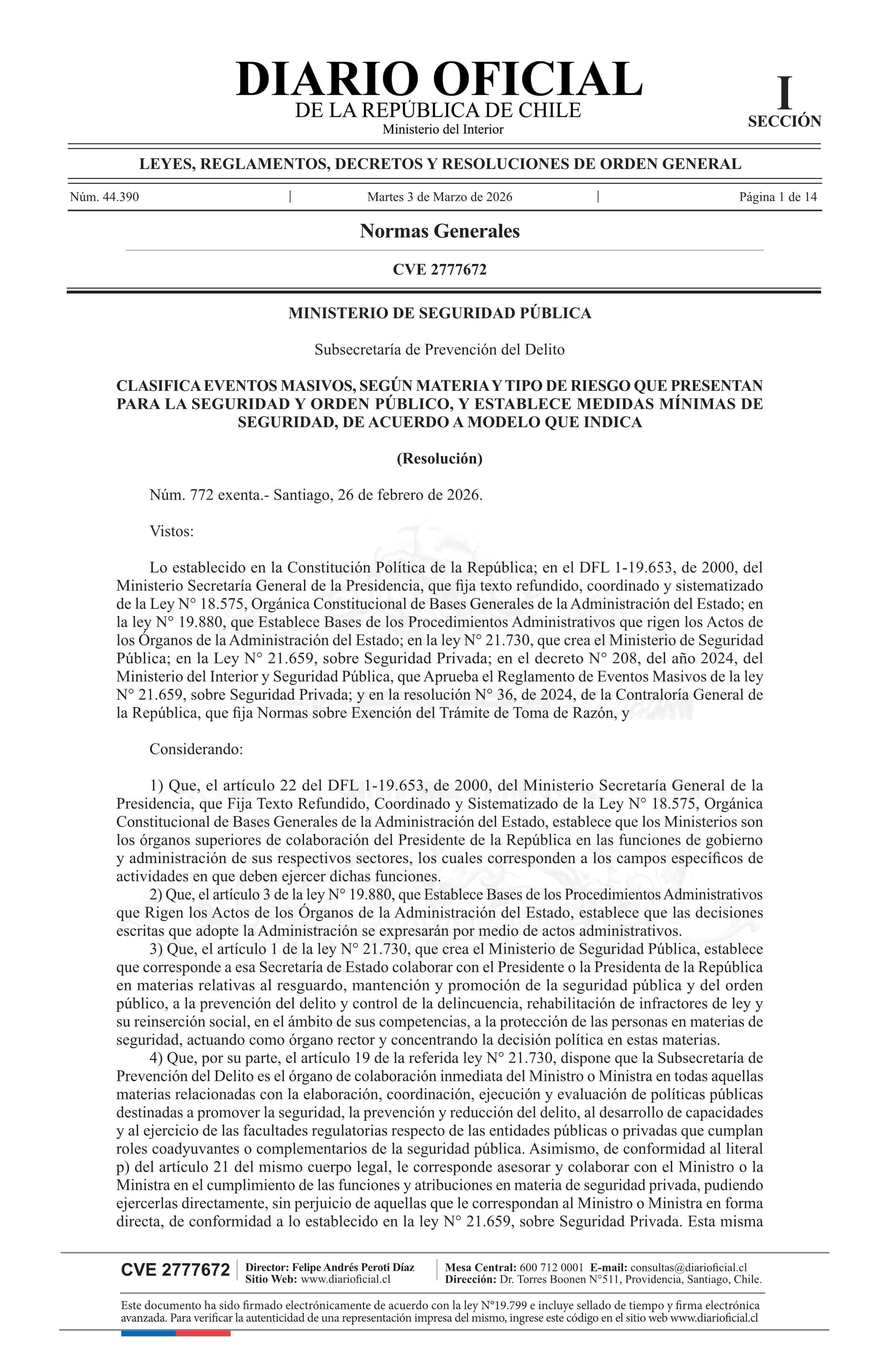| Título: | Resolución exenta número 772, de 2026.- Clasifica eventos masivos, según materia y tipo de riesgo que presentan para la seguridad y orden público, y establece medidas mínimas de seguridad, de acuerdo a modelo que indica |