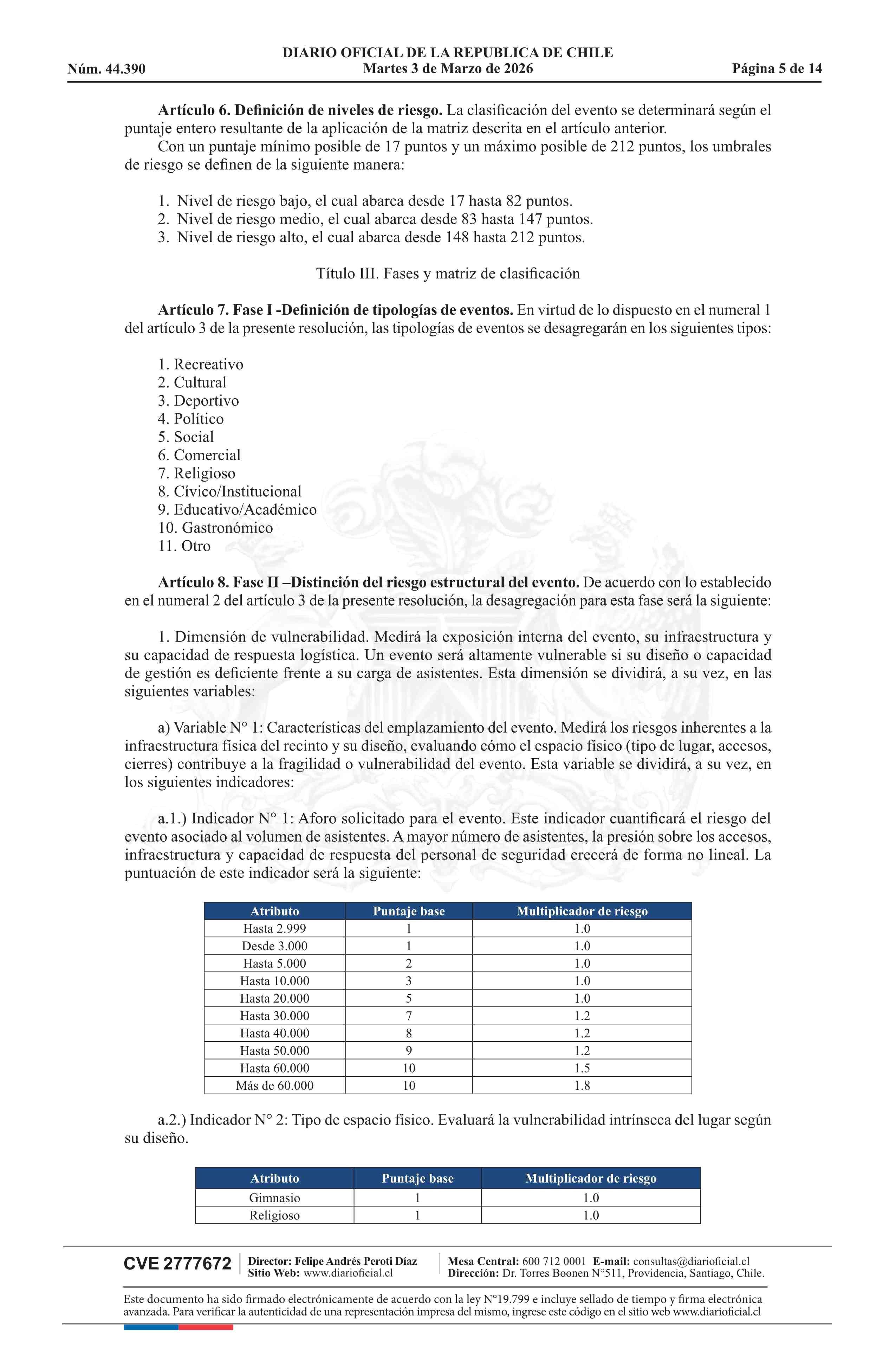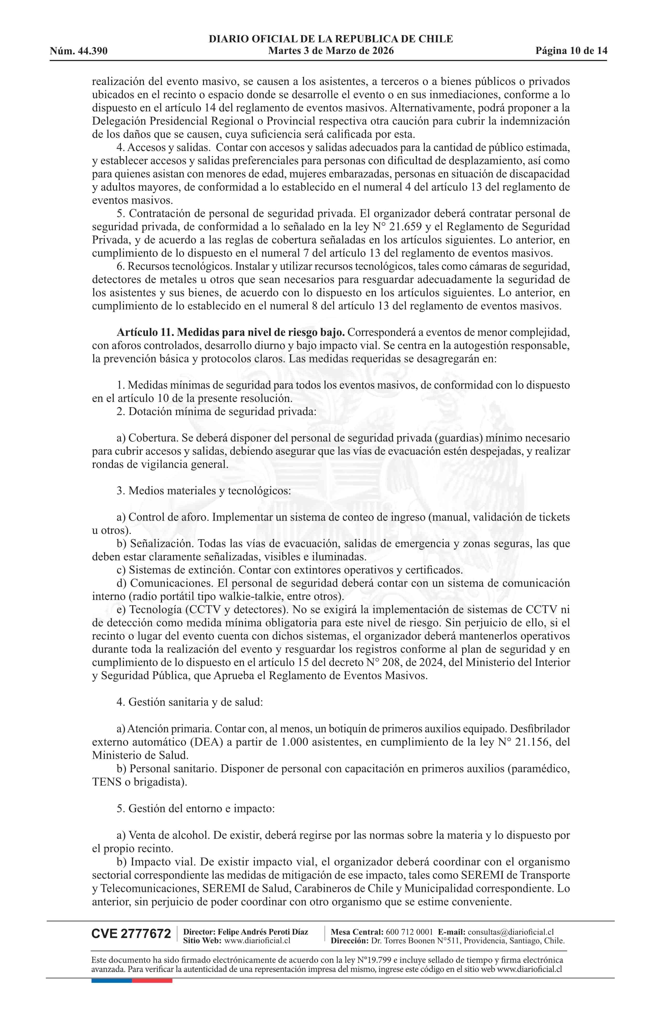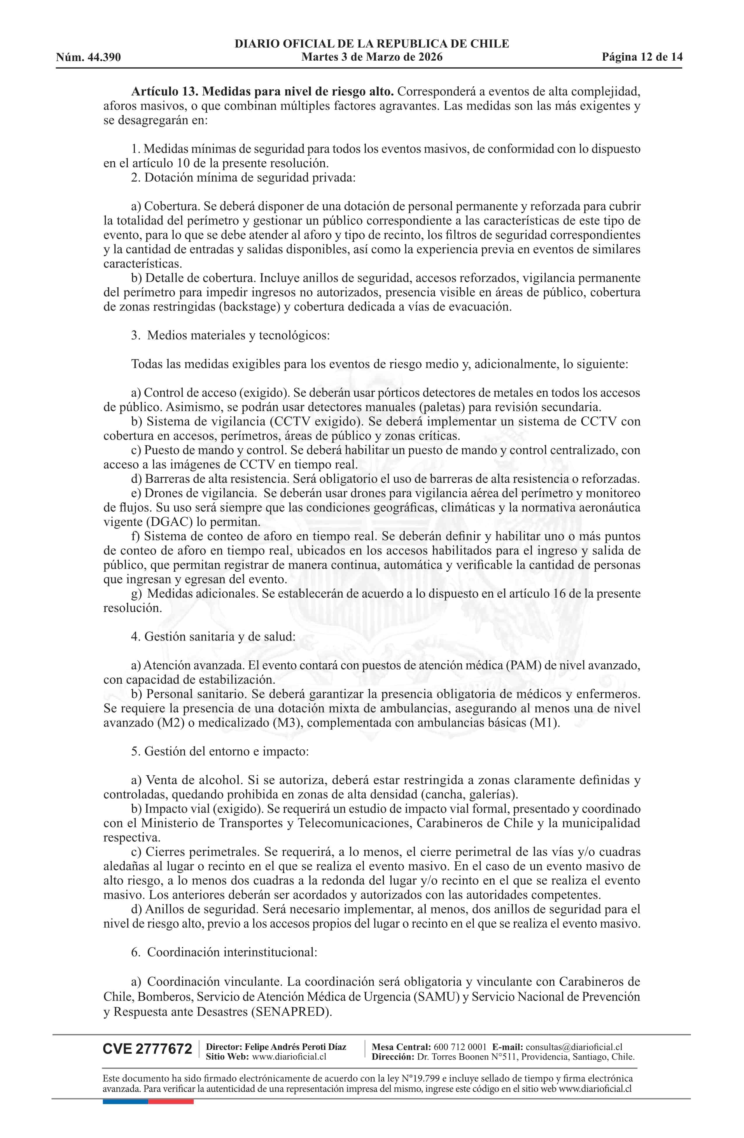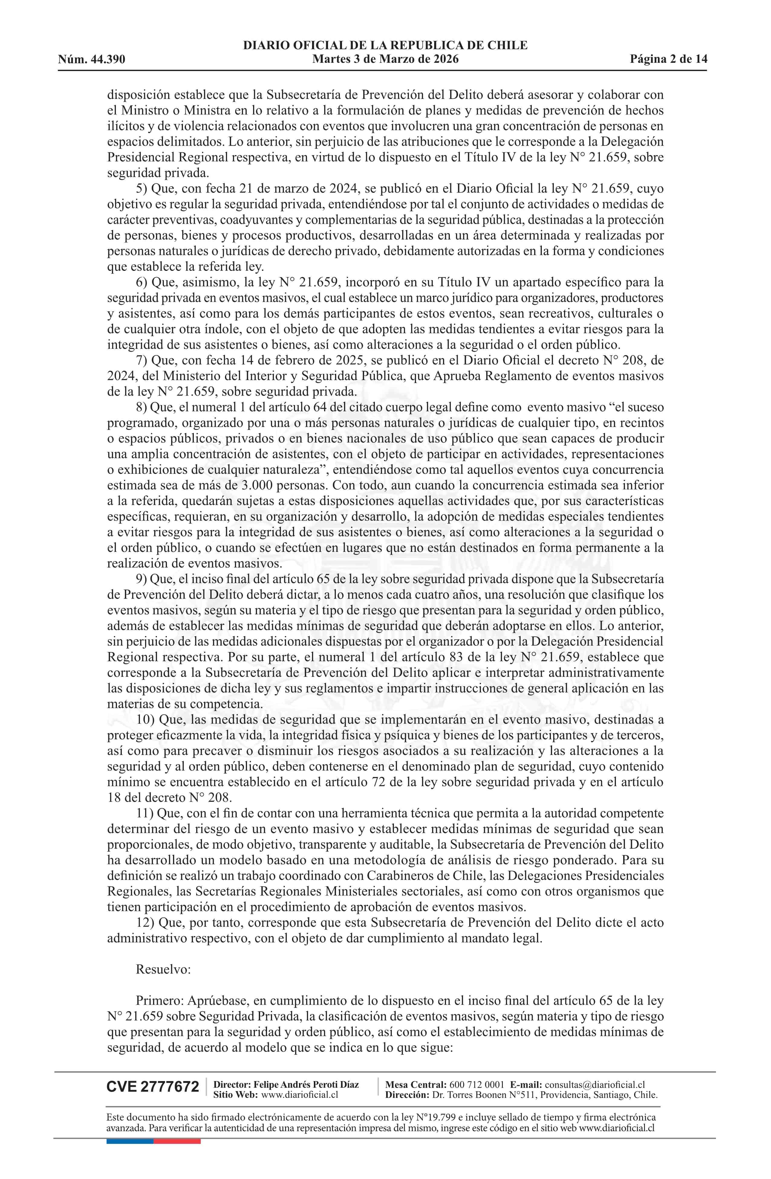 | Título: | Resolución exenta número 772, de 2026.- Clasifica eventos masivos, según materia y tipo de riesgo que presentan para la seguridad y orden público, y establece medidas mínimas de seguridad, de acuerdo a modelo que indica |