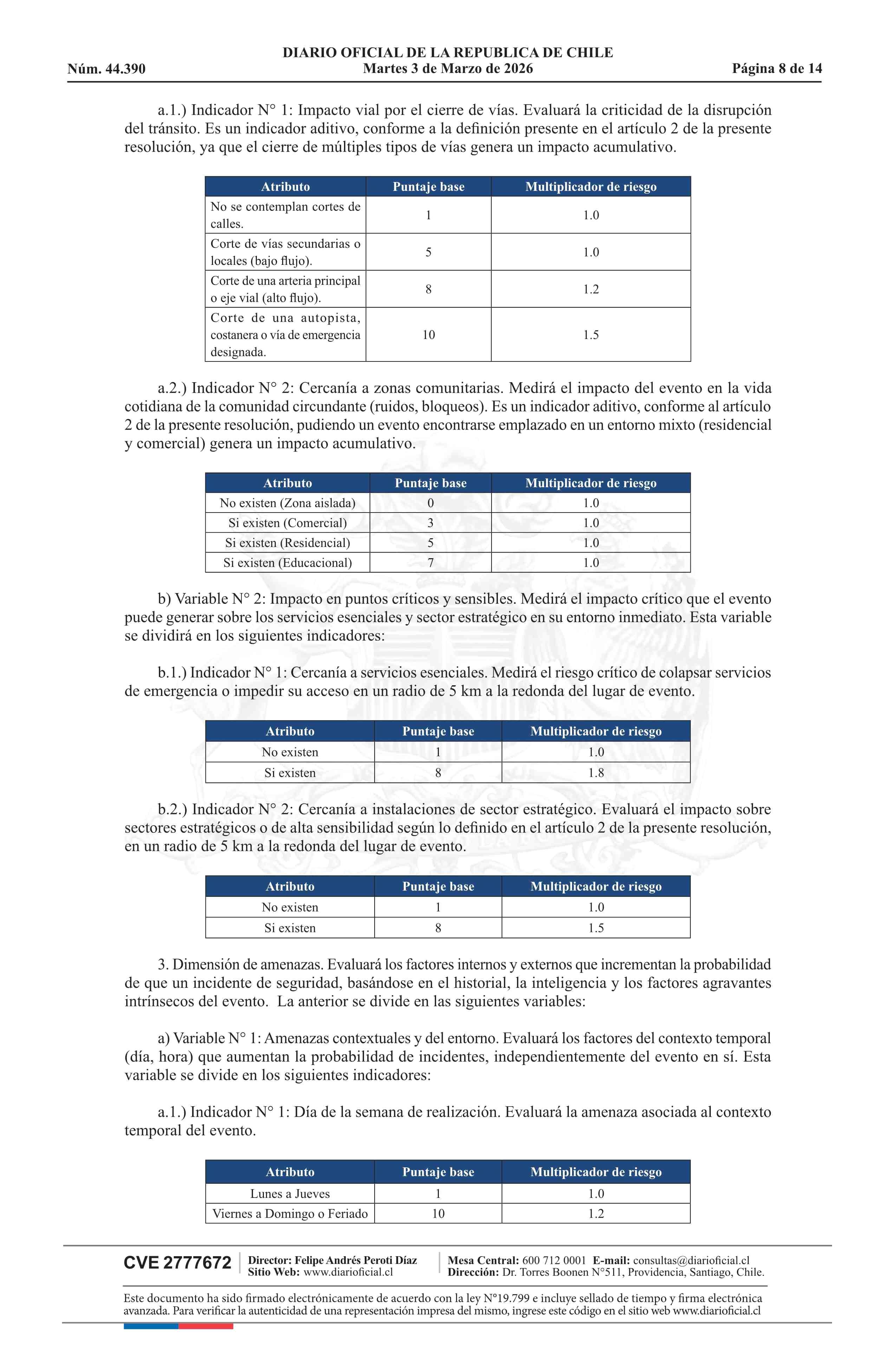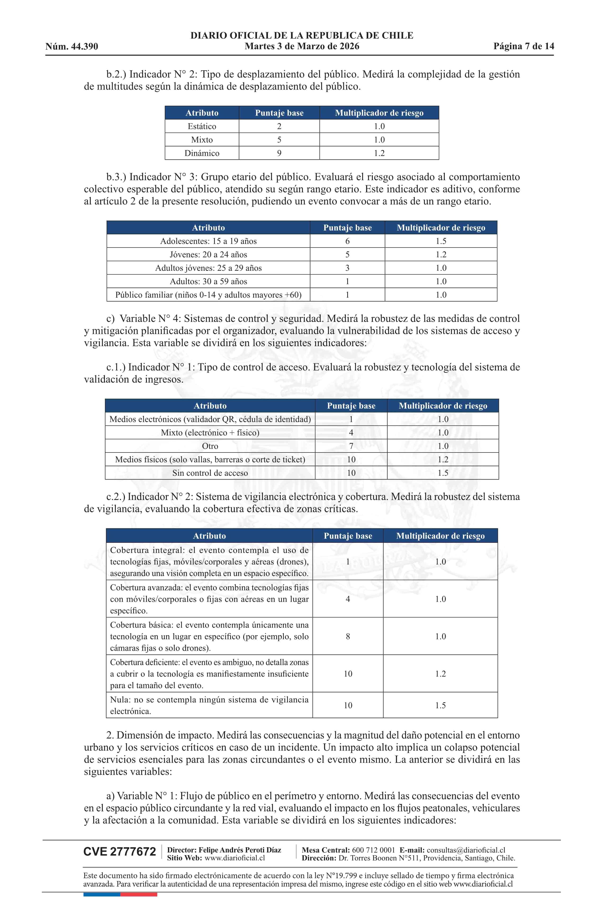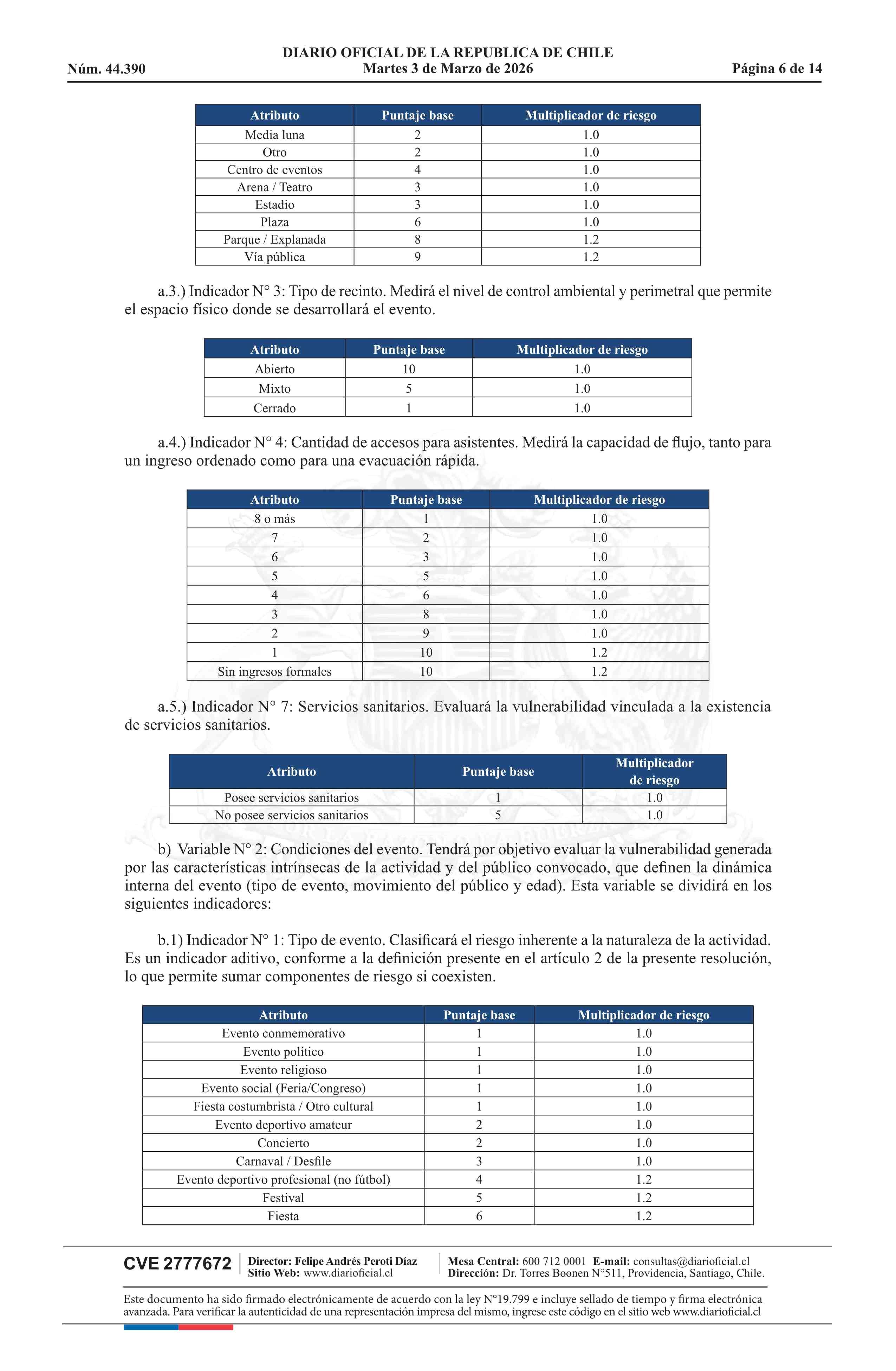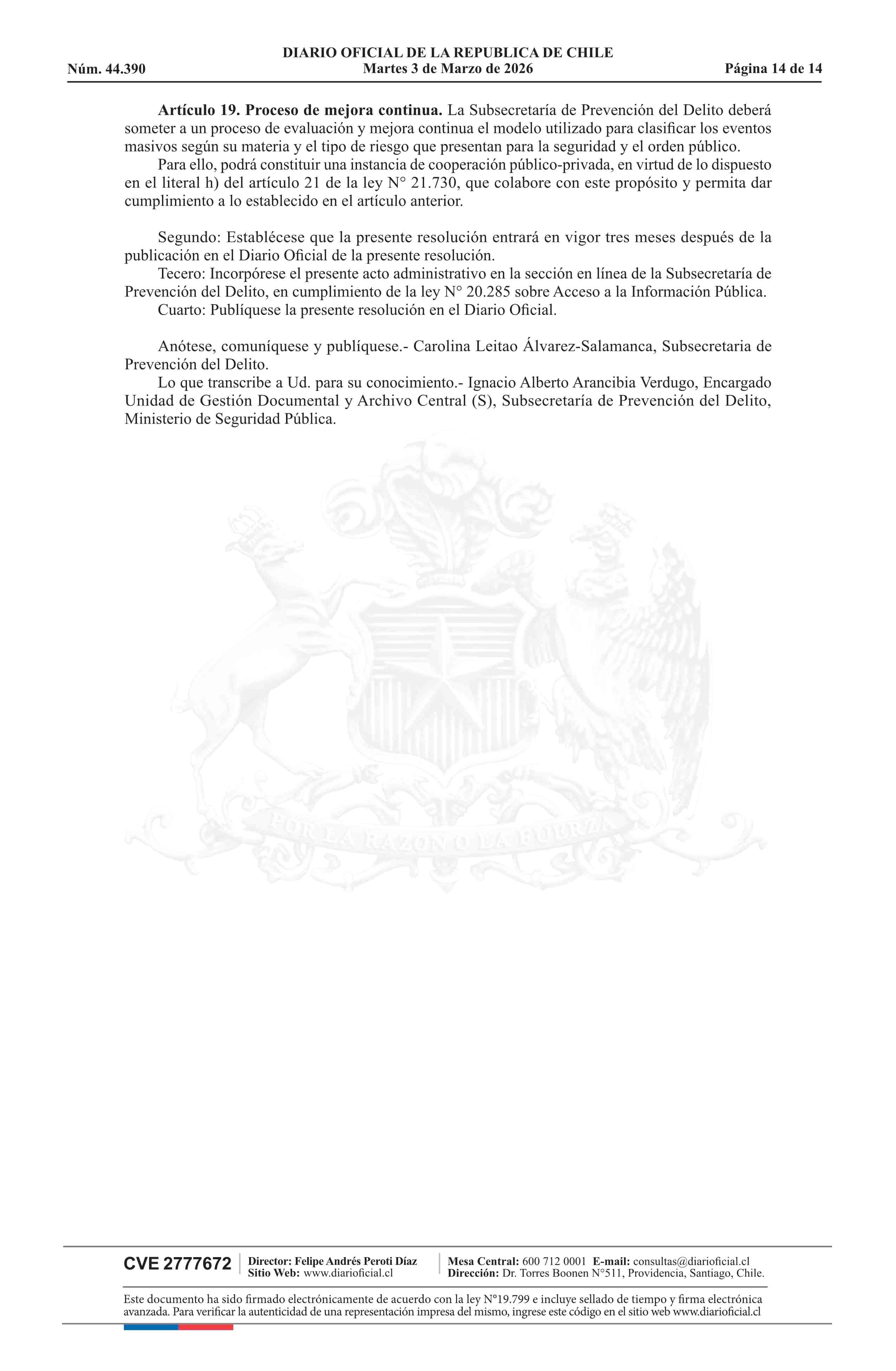 | Título: | Resolución exenta número 772, de 2026.- Clasifica eventos masivos, según materia y tipo de riesgo que presentan para la seguridad y orden público, y establece medidas mínimas de seguridad, de acuerdo a modelo que indica |