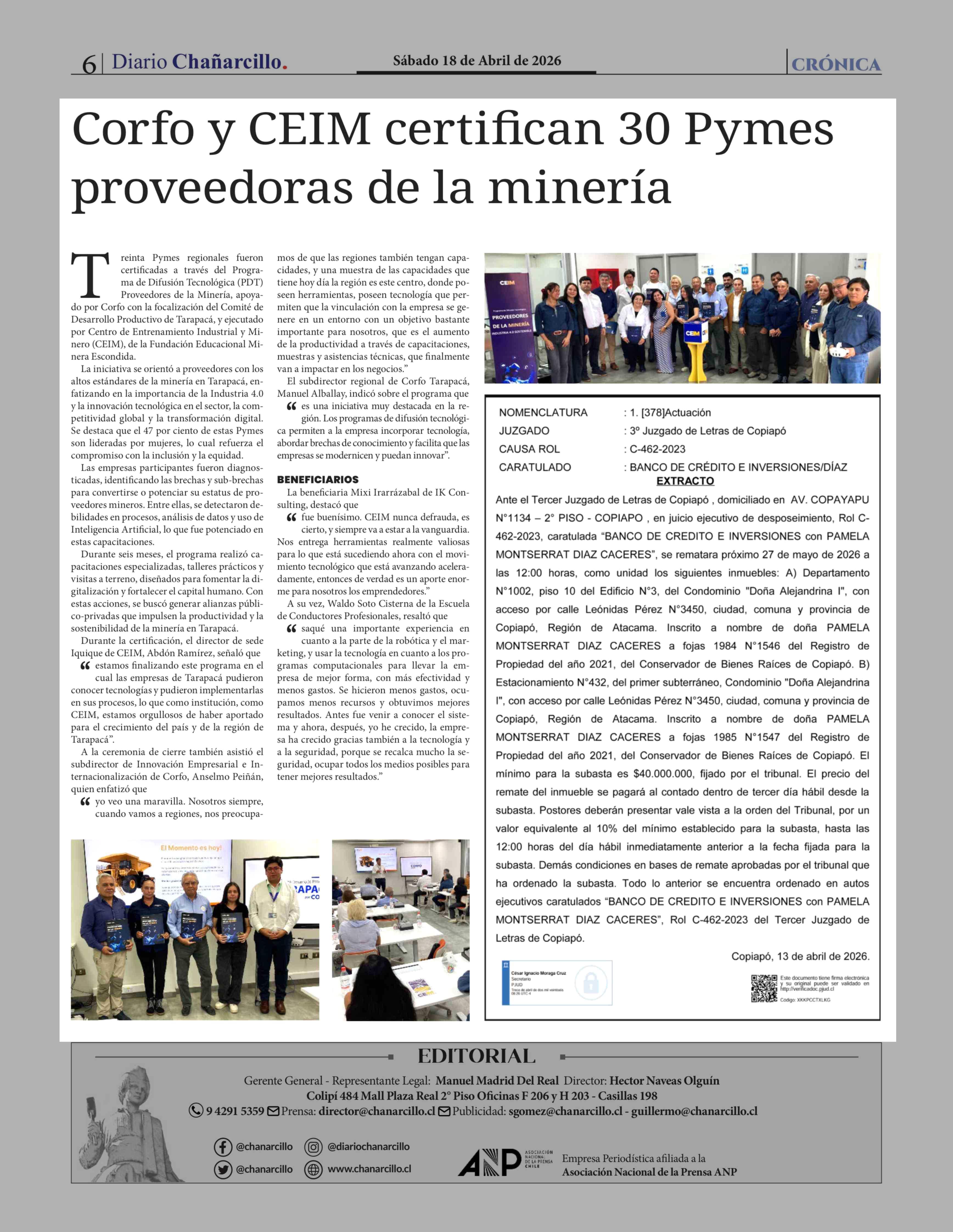 Corfo y CEIM certifican 30 Pymes proveedoras de la minería 18-04-2026 Diario Chañarcillo |