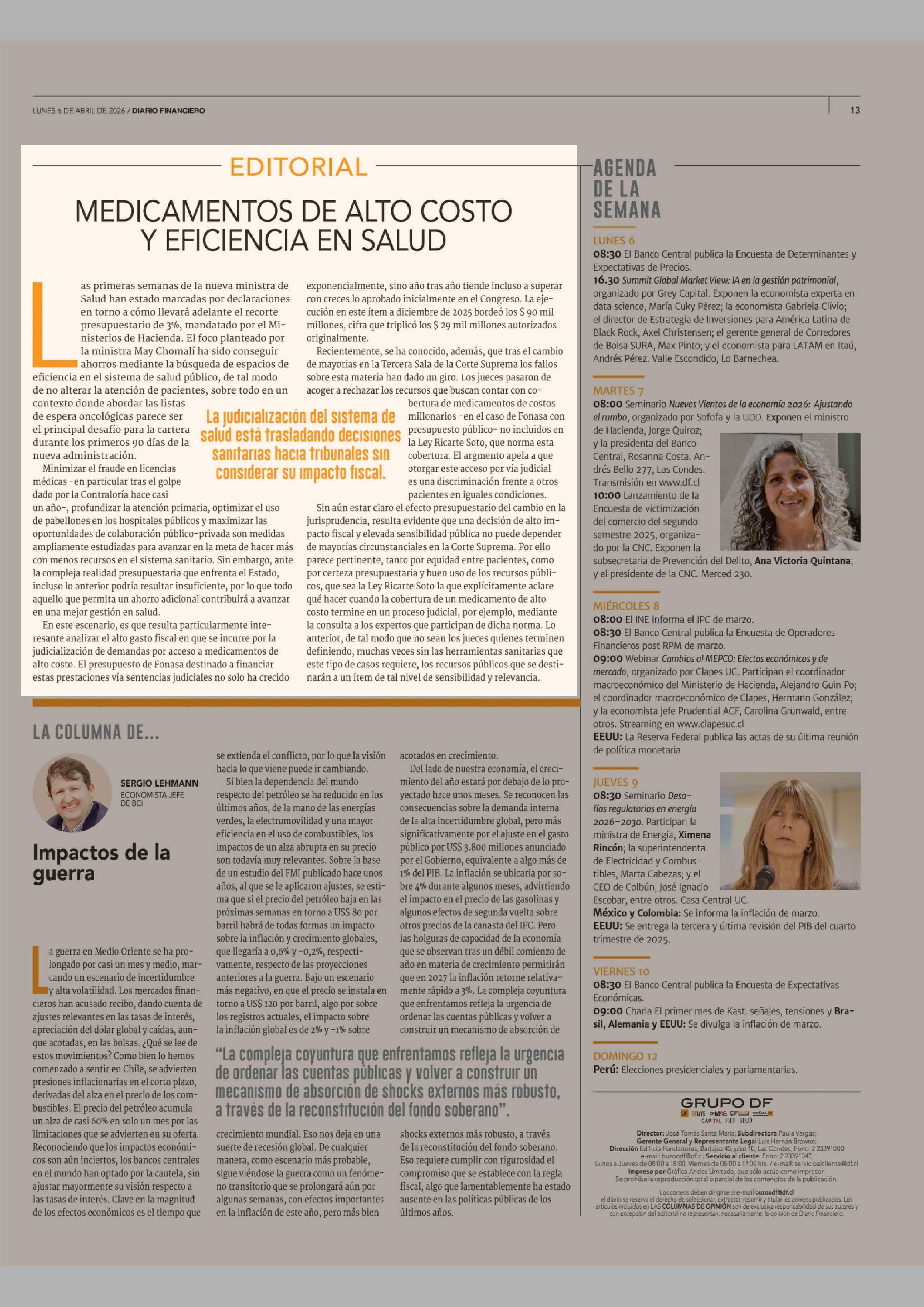 Editorial: MEDICAMENTOS DE ALTO COSTO Y EFICIENCIA EN SALUD 06-04-2026 Diario Financiero |