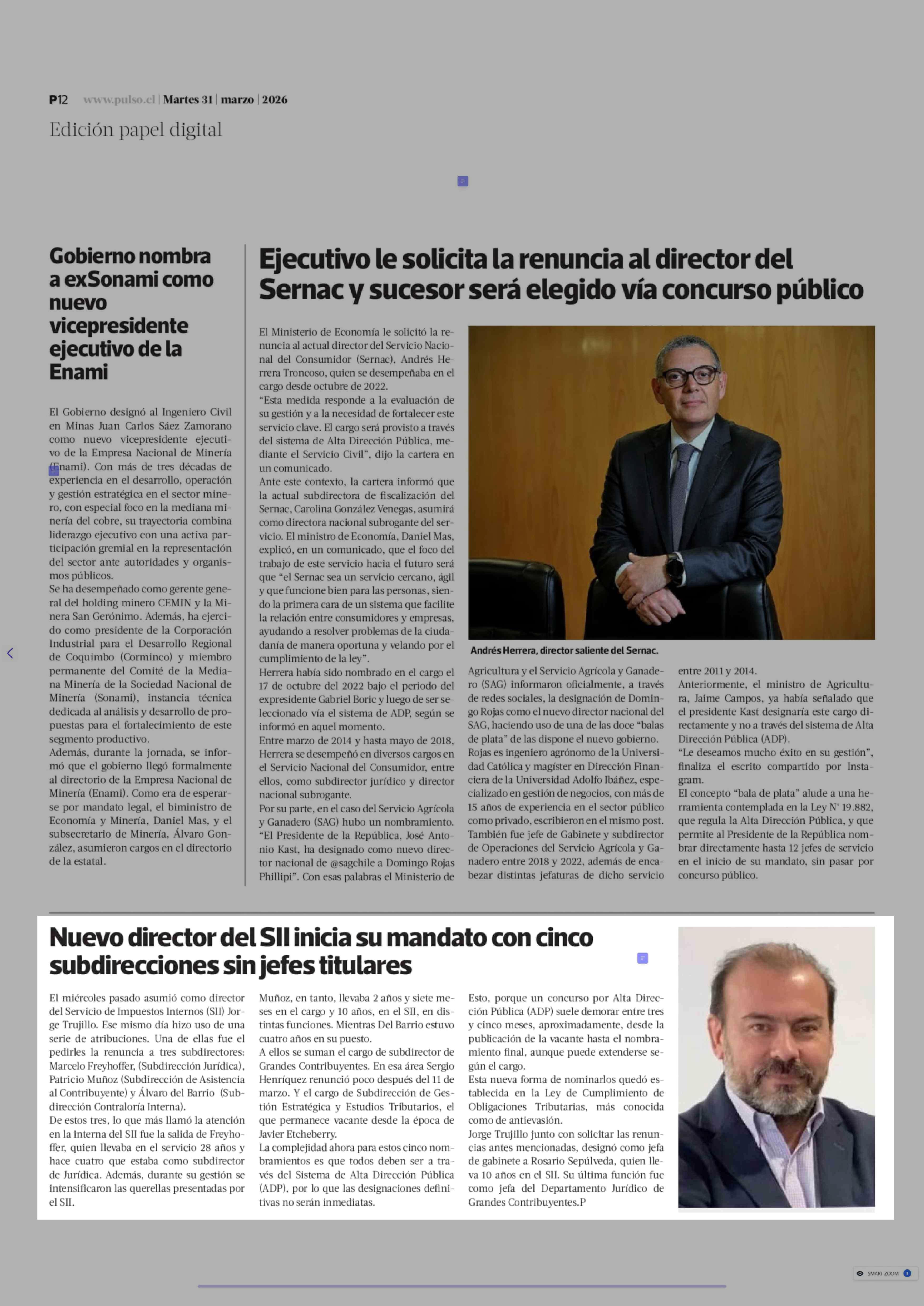 Nuevo director del SII inicia su mandato con cinco subdirecciones sin jefes titulares 31-03-2026 La Tercera |