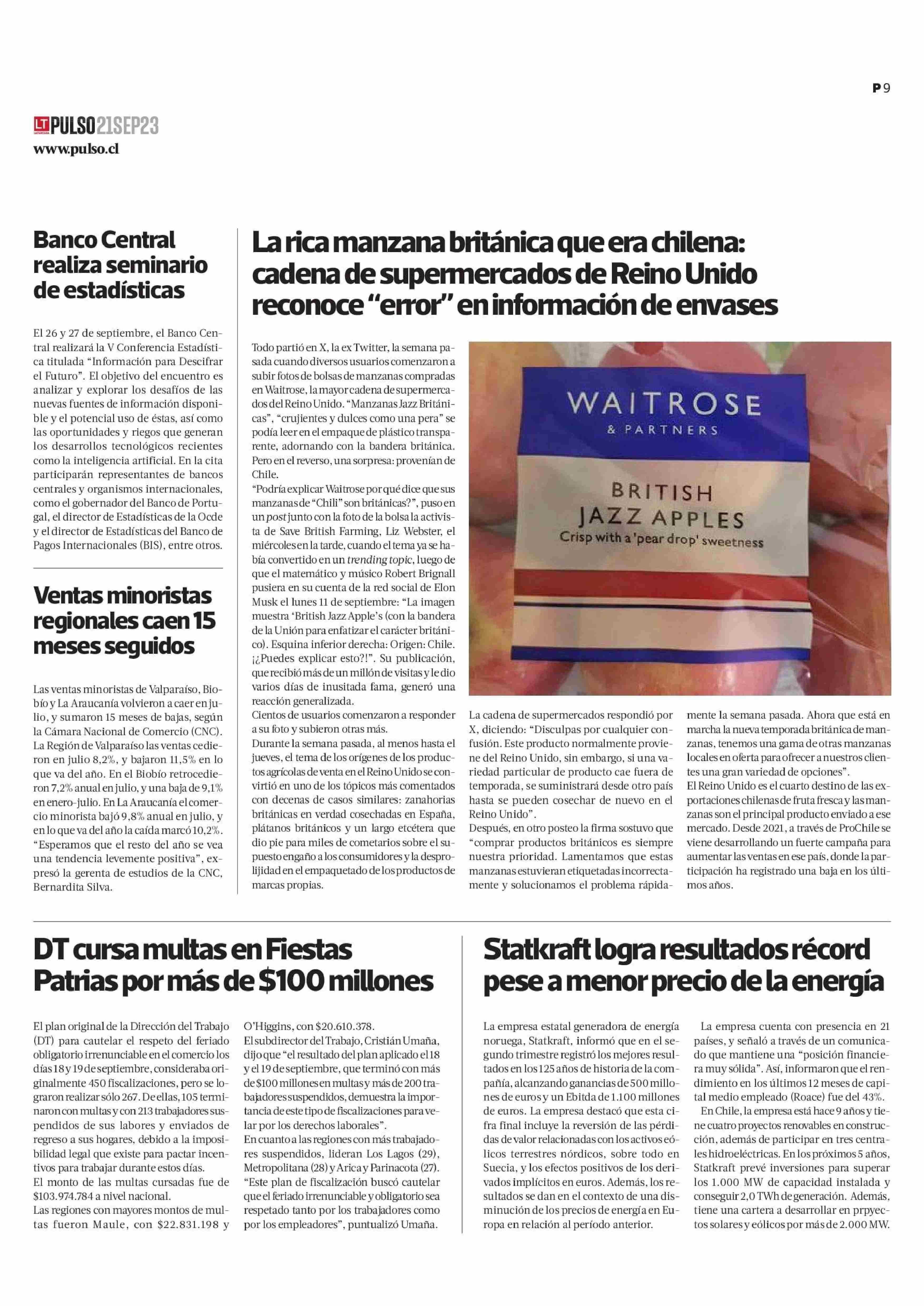 La rica manzana británica que era chilena: cadena de supermercados de Reino Unido reconoce “error” en información de envases 21-09-2023 La Tercera |