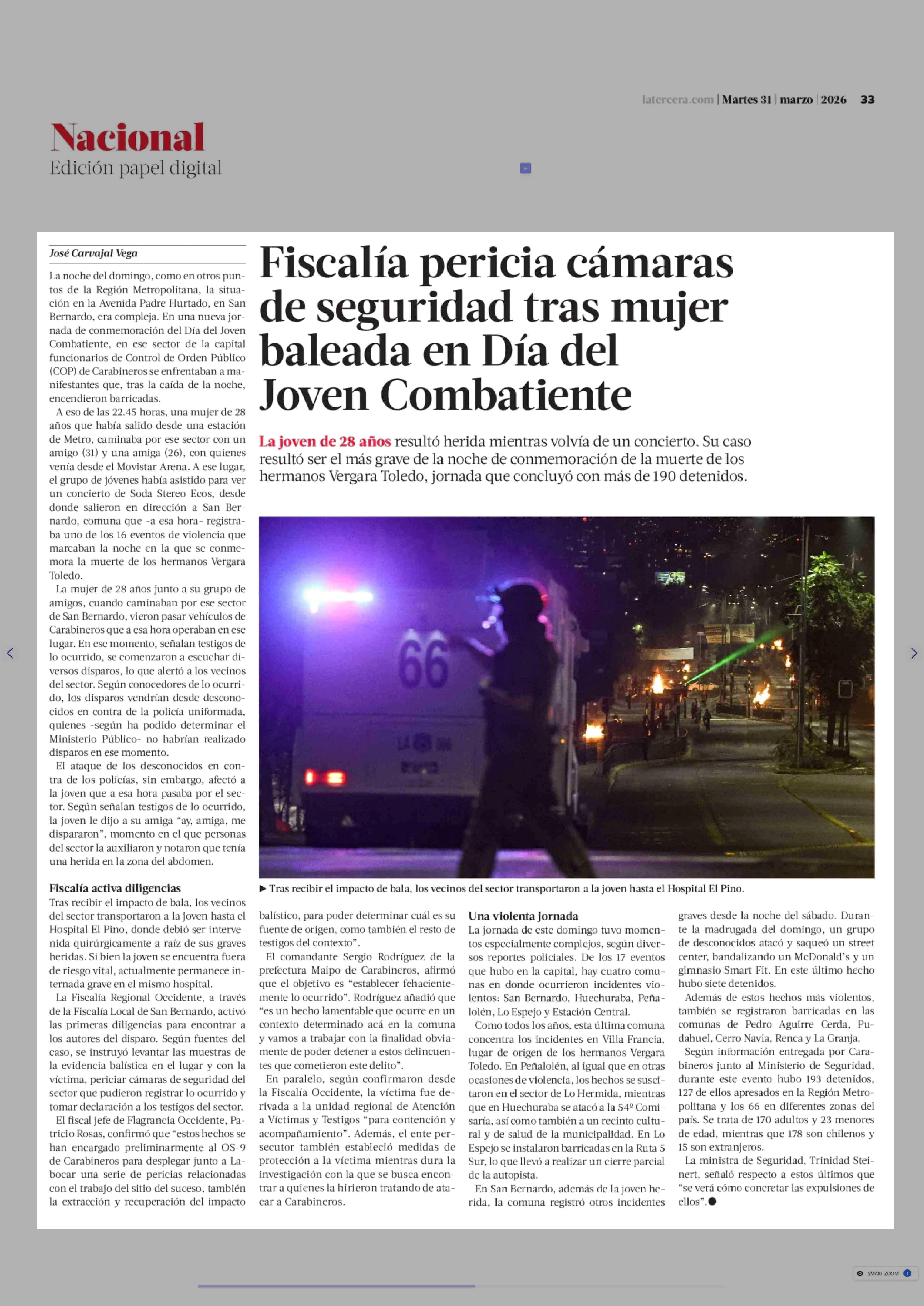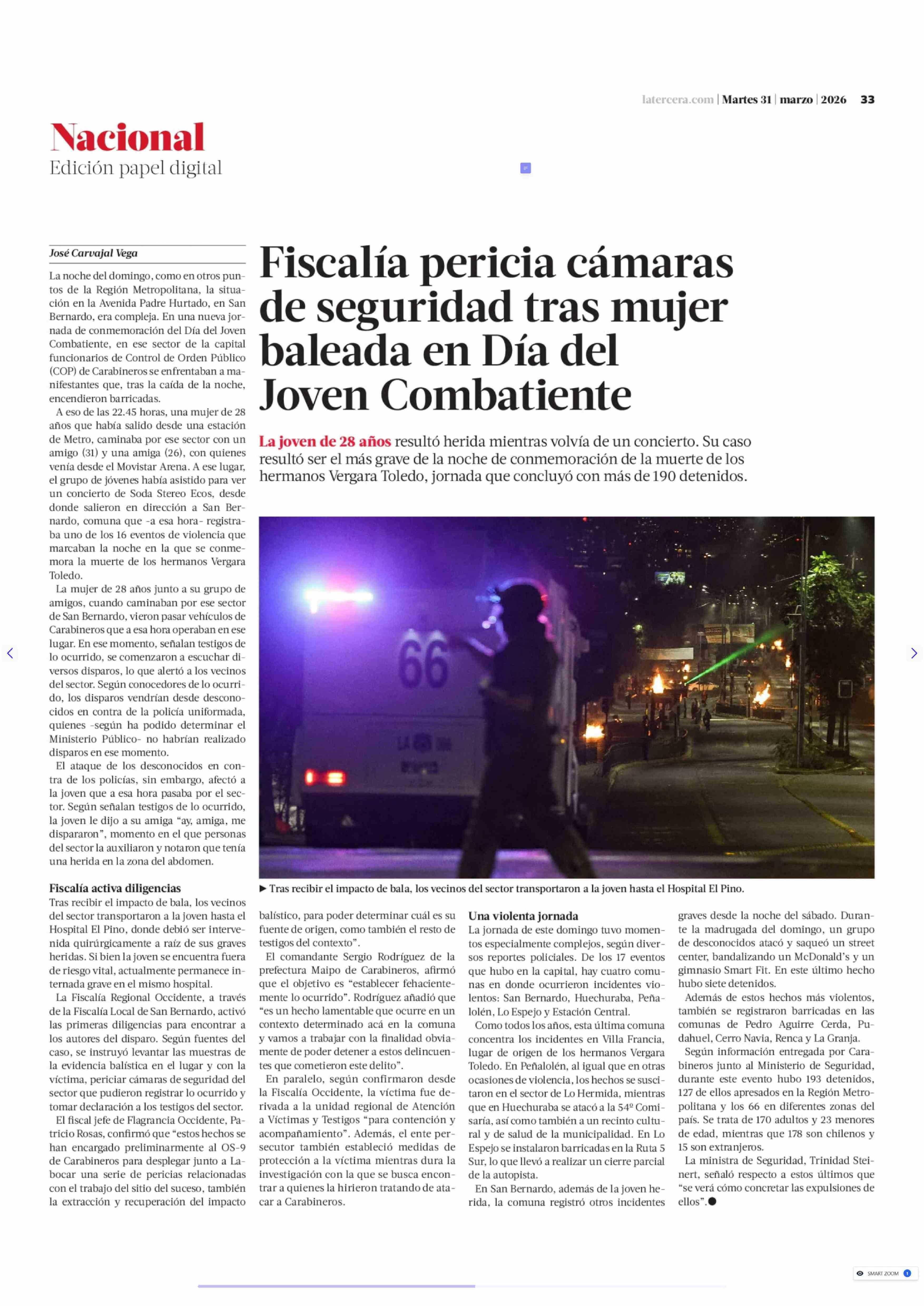 Fiscalía pericia cámaras de seguridad tras mujer baleada en Día del Joven Combatiente 31-03-2026 La Tercera |