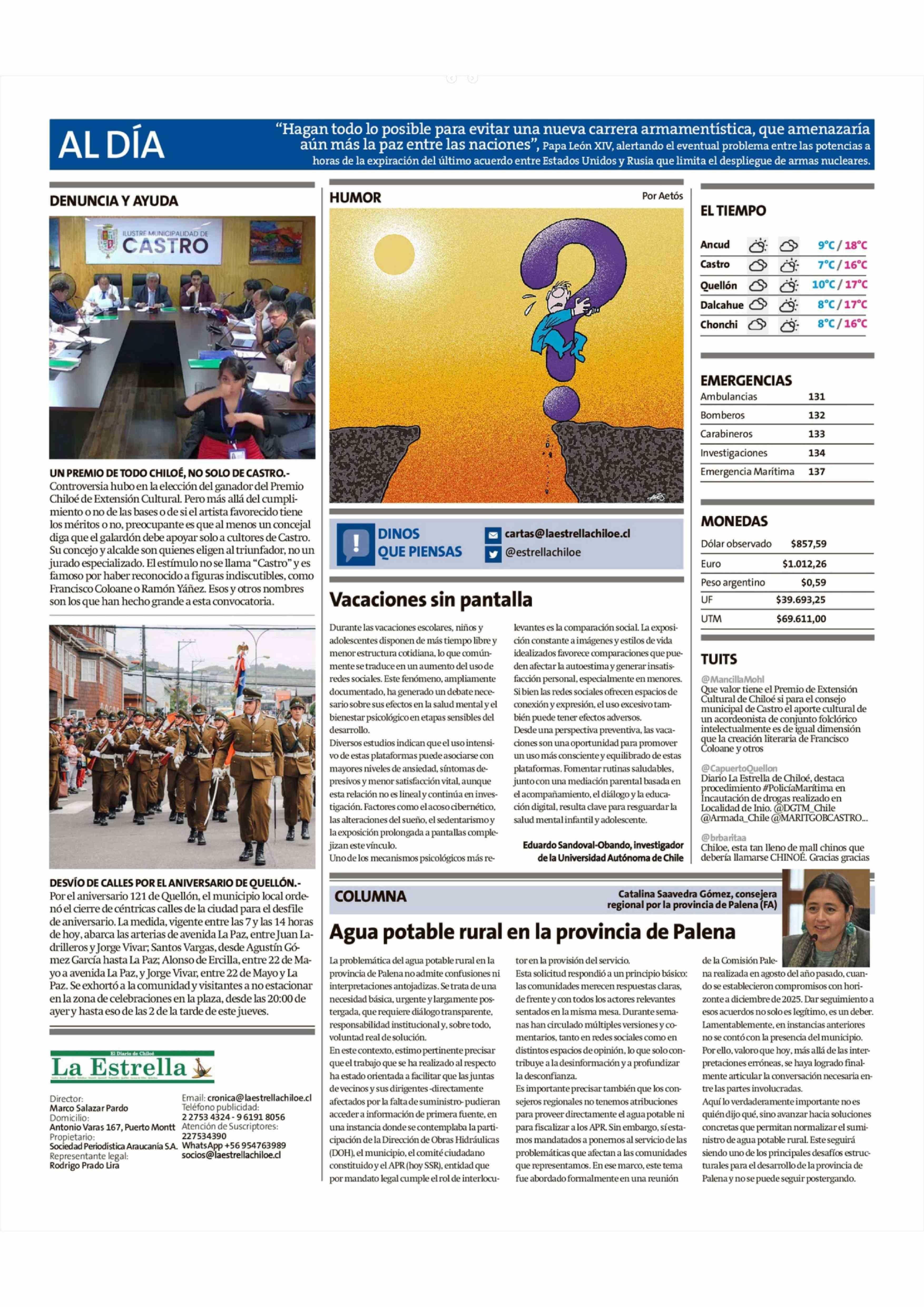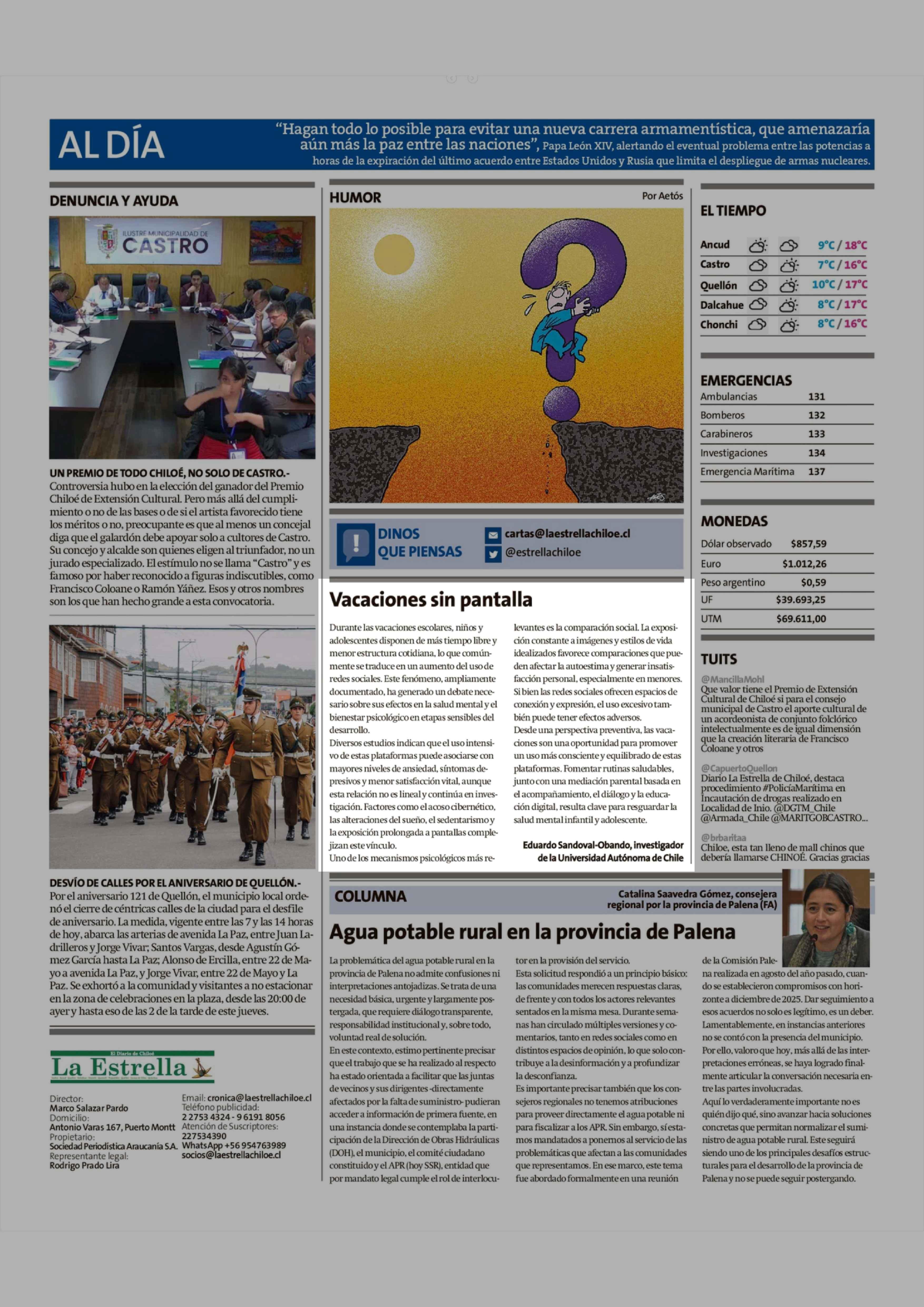 Cartas: Vacaciones sin pantalla 05-02-2026 La Estrella de Chiloé |