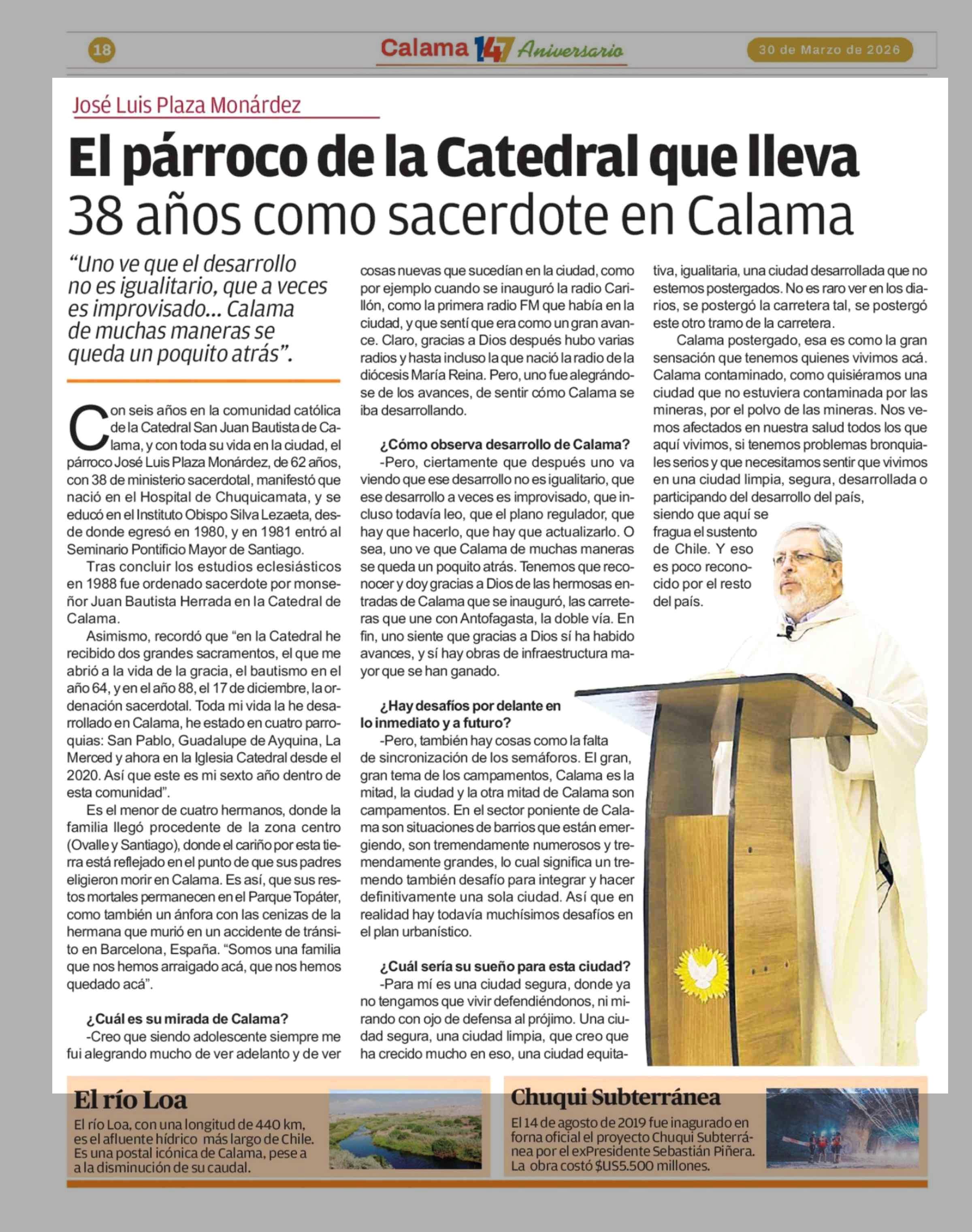 El párroco de la Catedral que lleva 38 años como sacerdote en Calama 30-03-2026 El Mercurio de Calama |