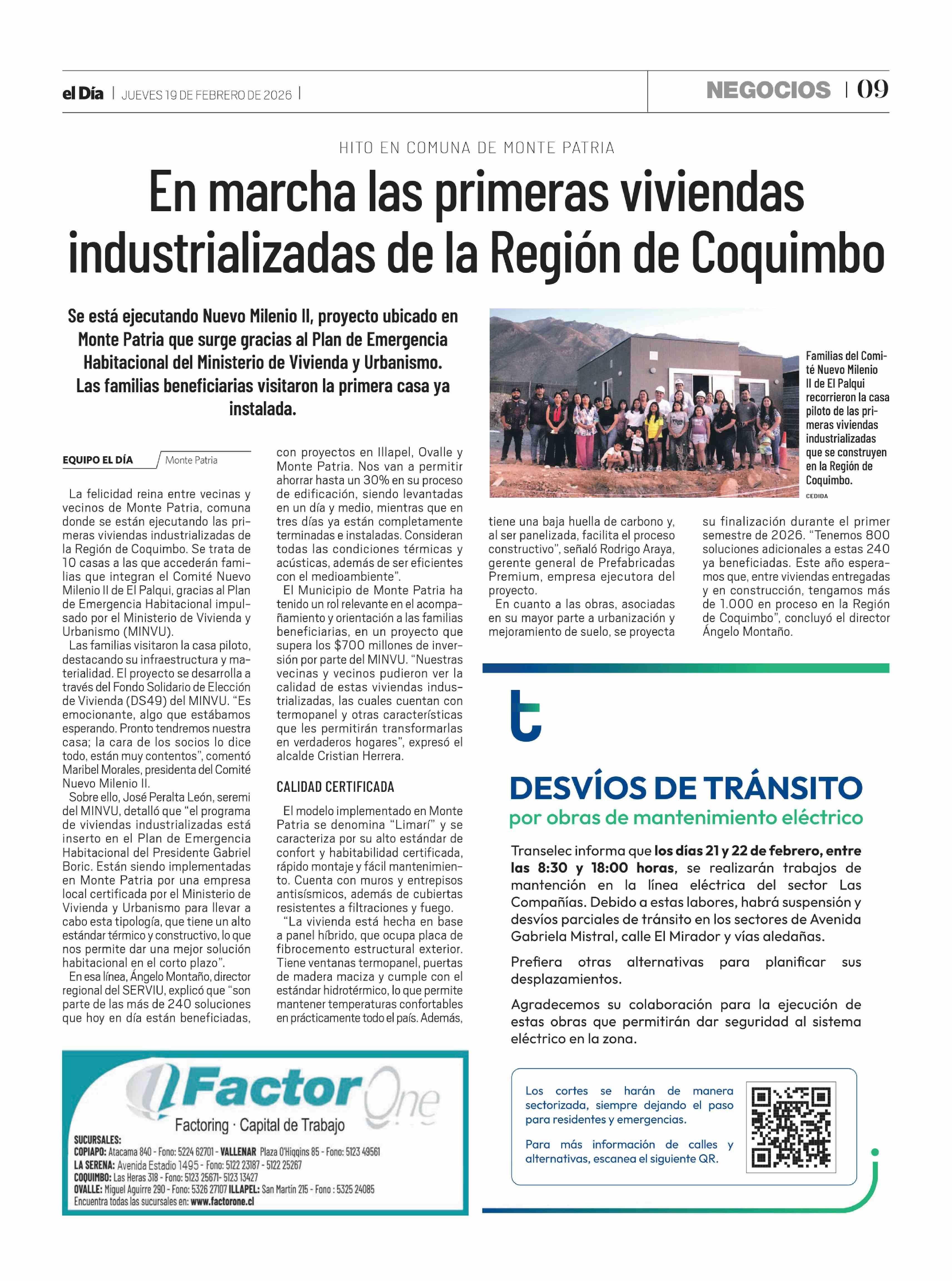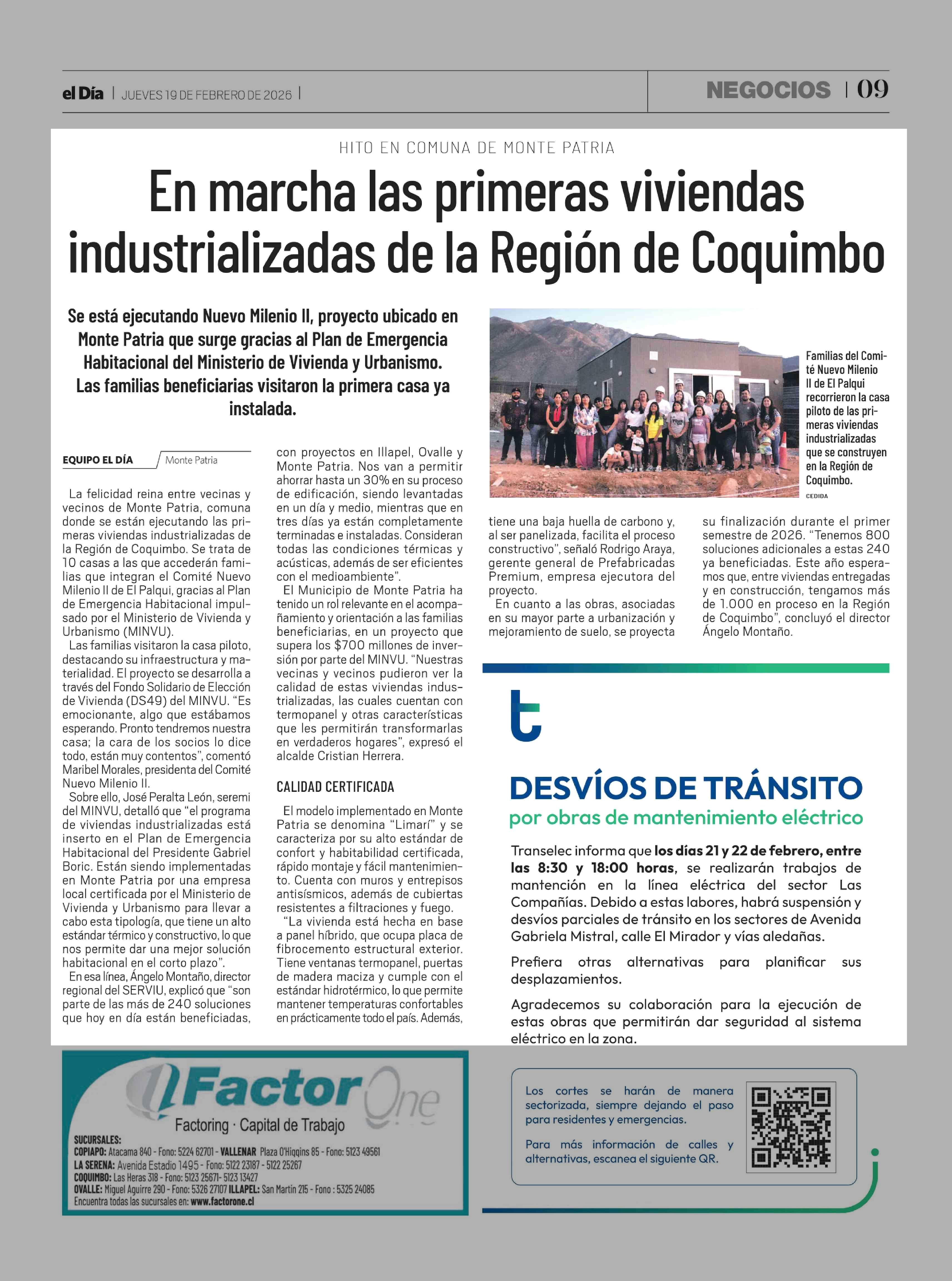 En marcha las primeras viviendas industrializadas de la Región de Coquimbo 19-02-2026 El Día |