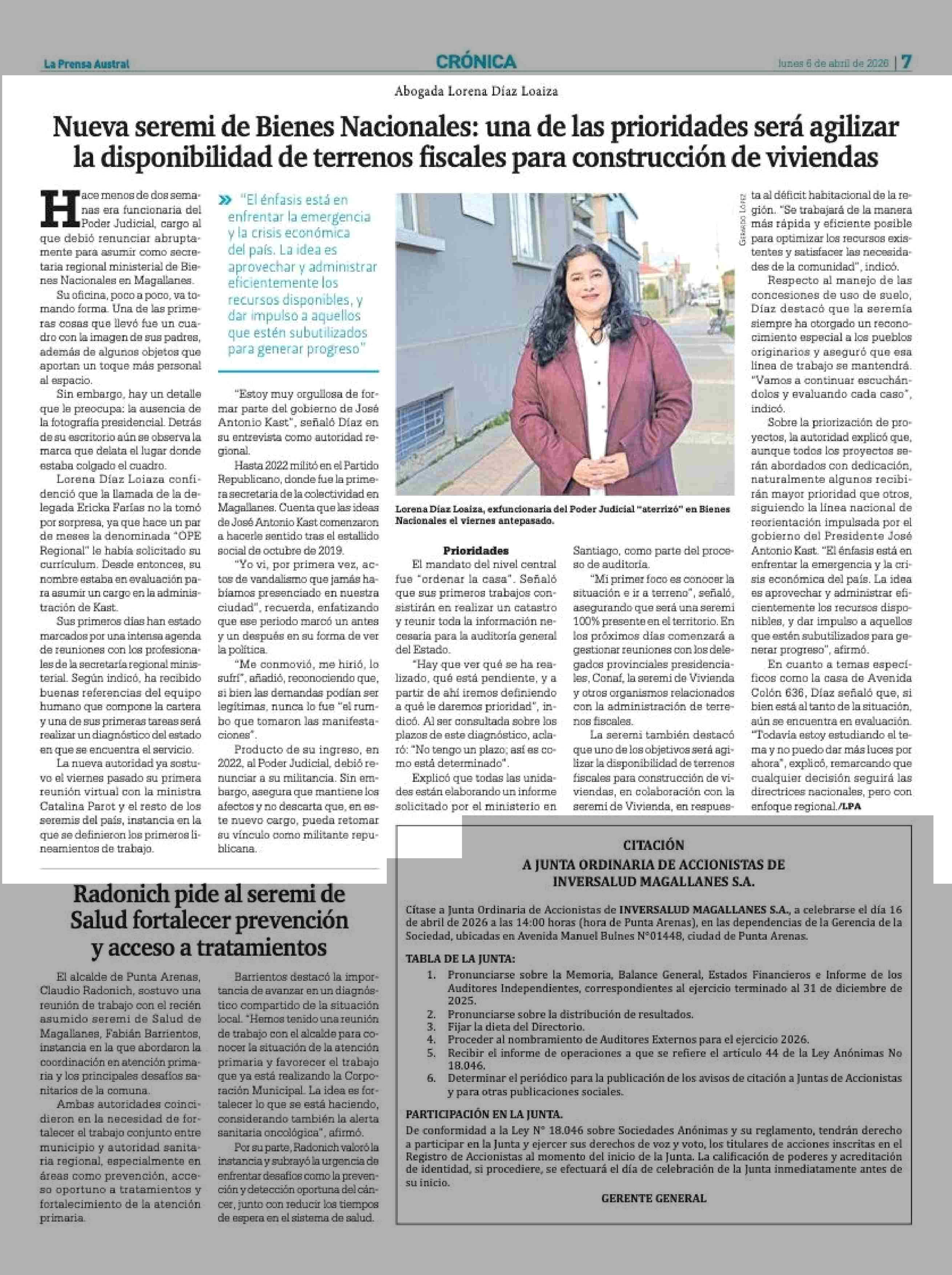 Fecha: 06-04-2026 Sector: Noticia general Región: Región de Magallanes y de la Antártica Chilena