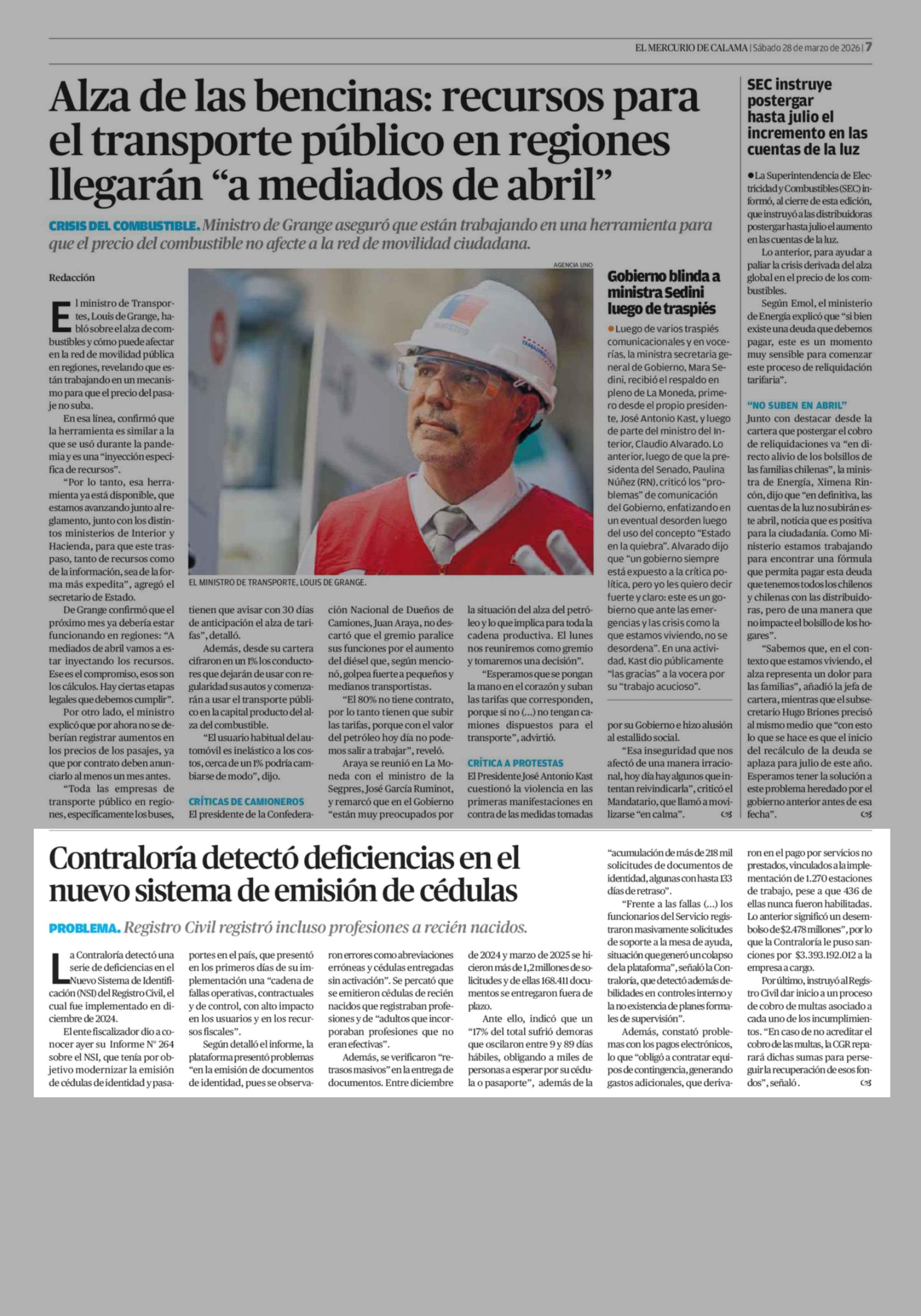 Contraloría detectó deficiencias en el nuevo sistema de emisión de cédulas 28-03-2026 El Mercurio de Calama |