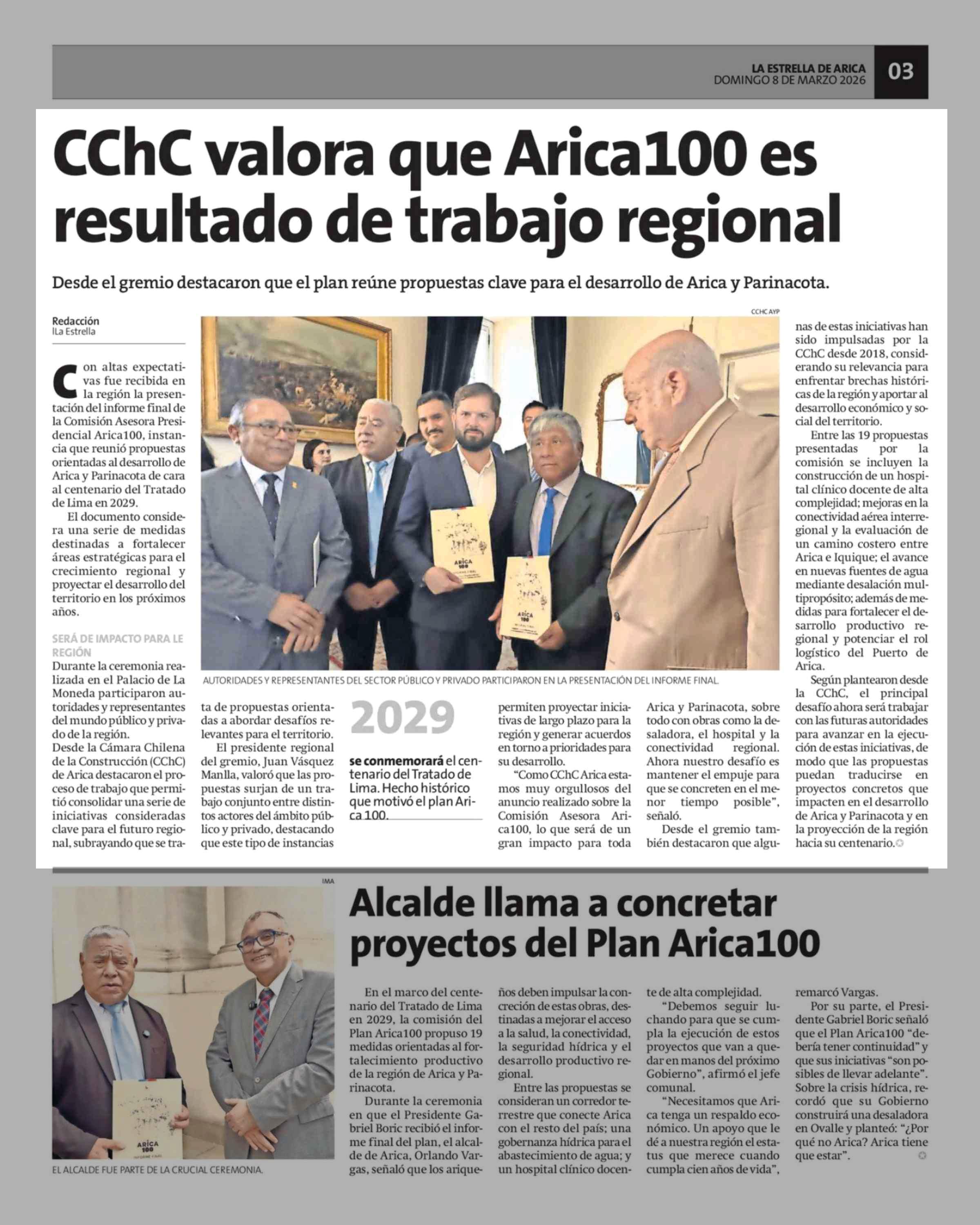 CChC valora que Arica100 es resultado de trabajo regional 08-03-2026 La Estrella de Arica |