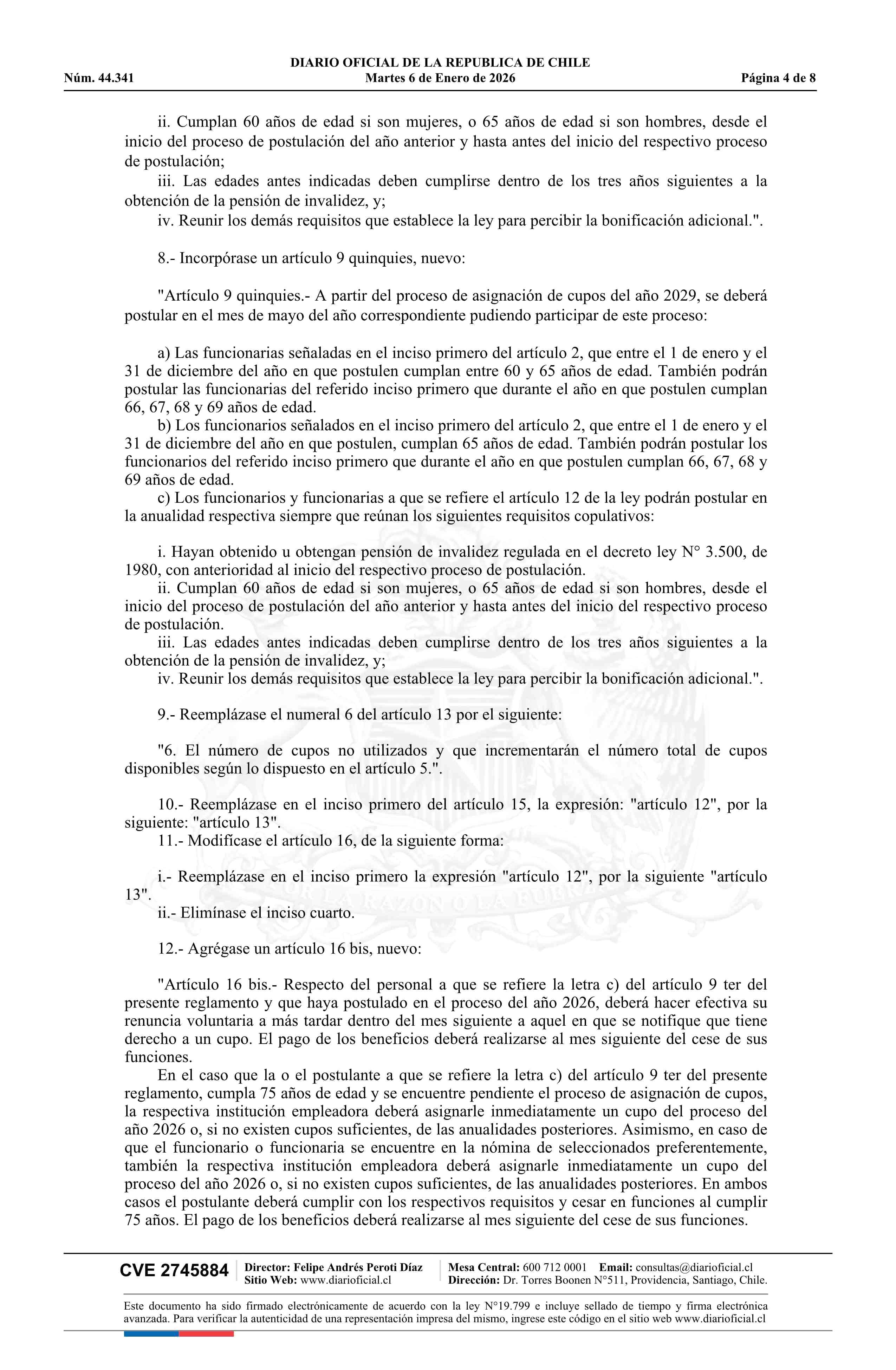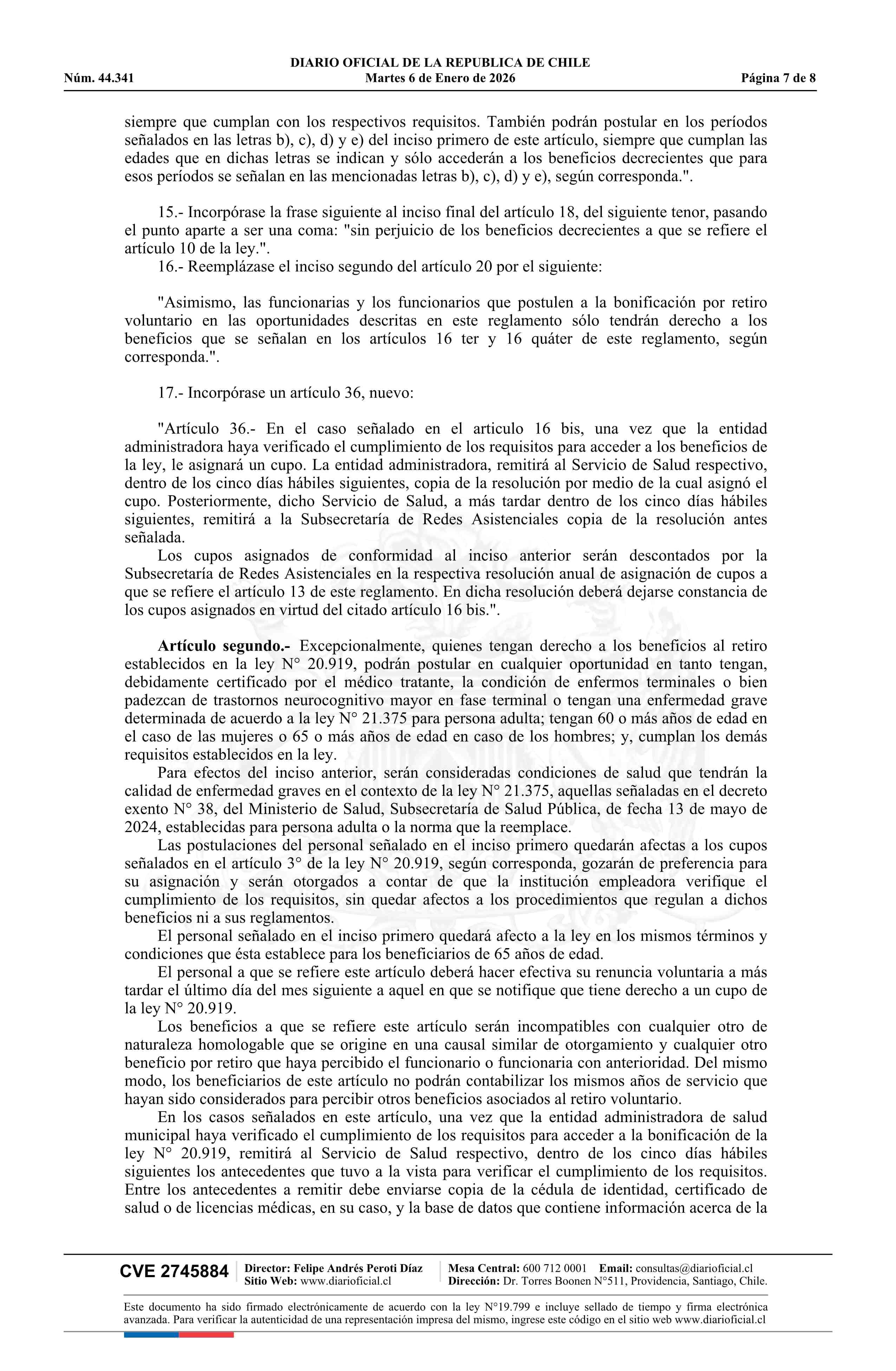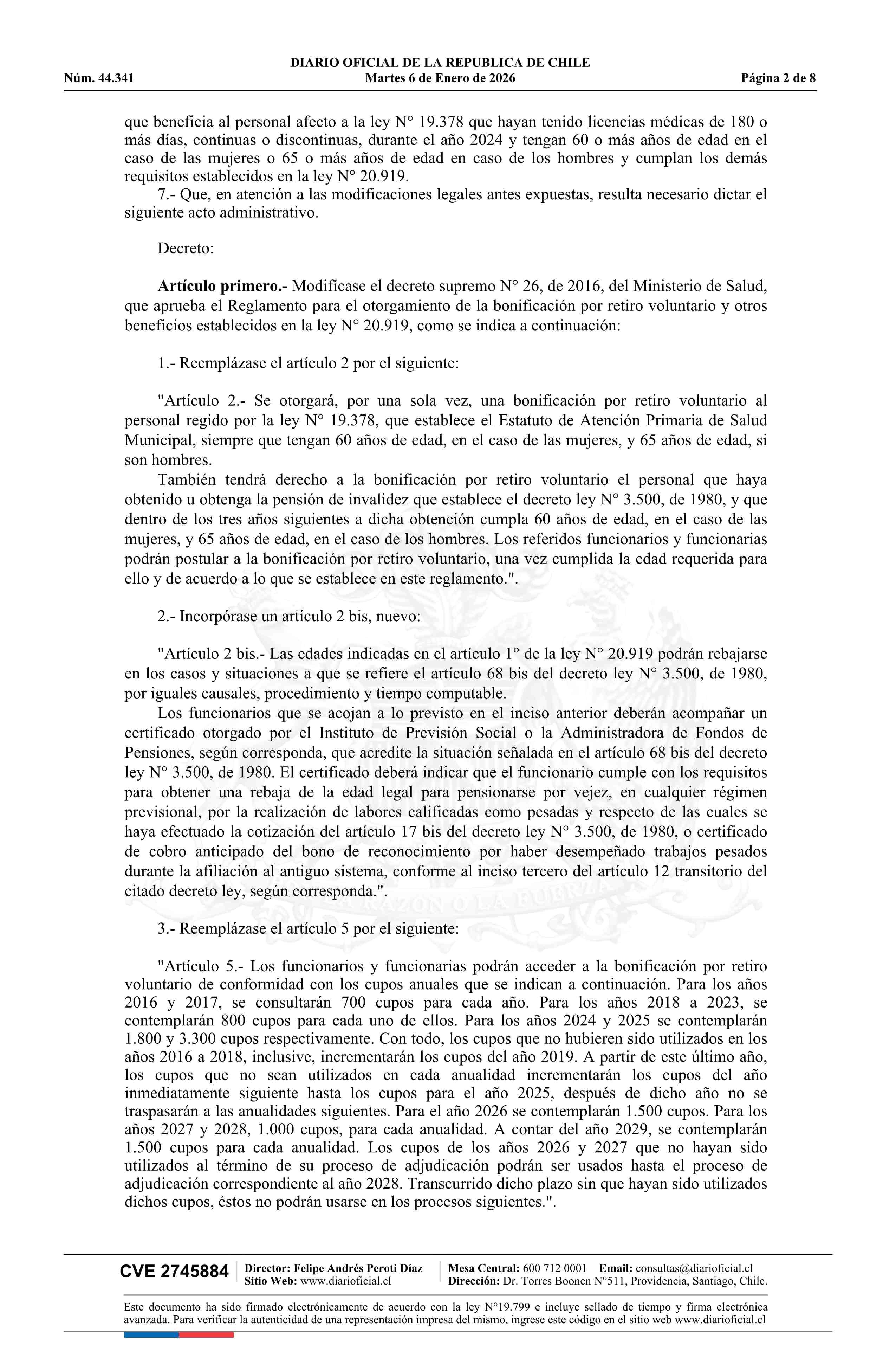 Decreto número 13, de 2025.- Modifica decreto N° 26, de 2016, Reglamento para el otorgamiento de la bonificación por retiro voluntario y otros beneficios establecidos en la ley N° 20.919 06-01-2026 DIARIO OFICIAL CHILE - BOLETÍN OFICIAL DE MINERÍA |
