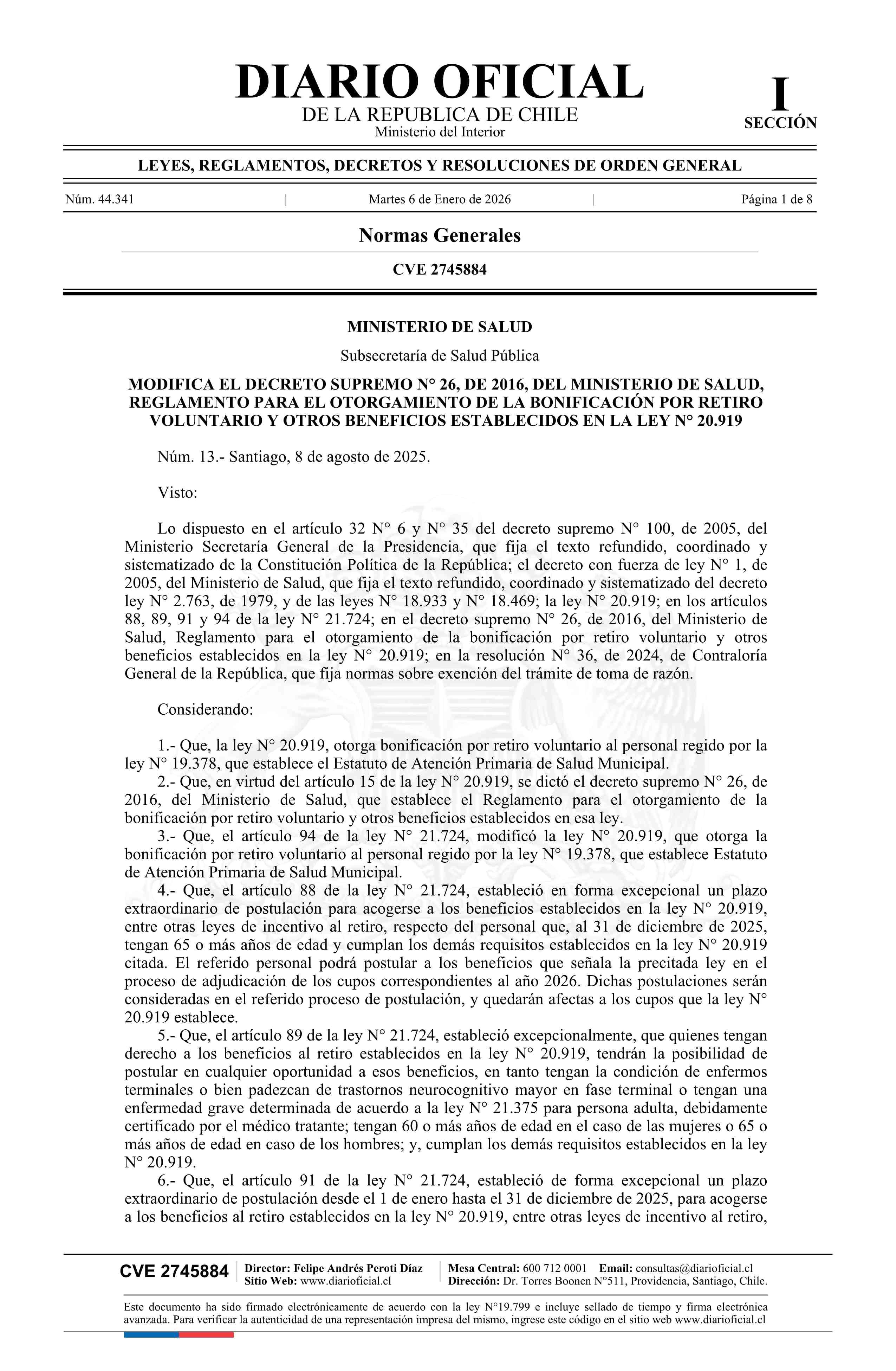 | Título: | Decreto número 13, de 2025.- Modifica decreto N° 26, de 2016, Reglamento para el otorgamiento de la bonificación por retiro voluntario y otros beneficios establecidos en la ley N° 20.919 |