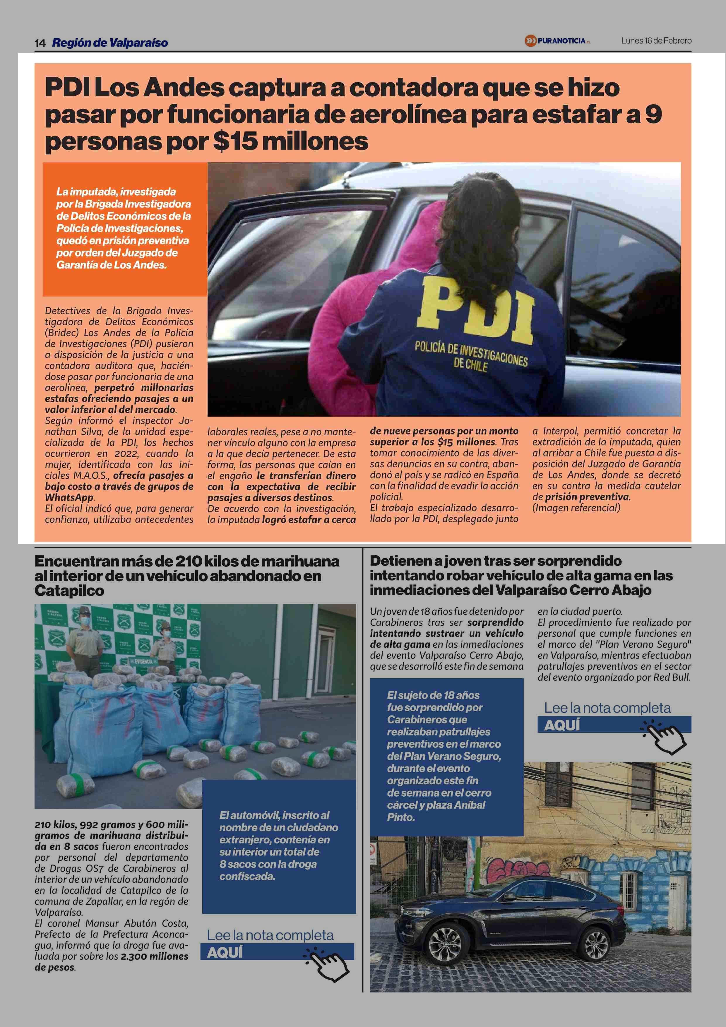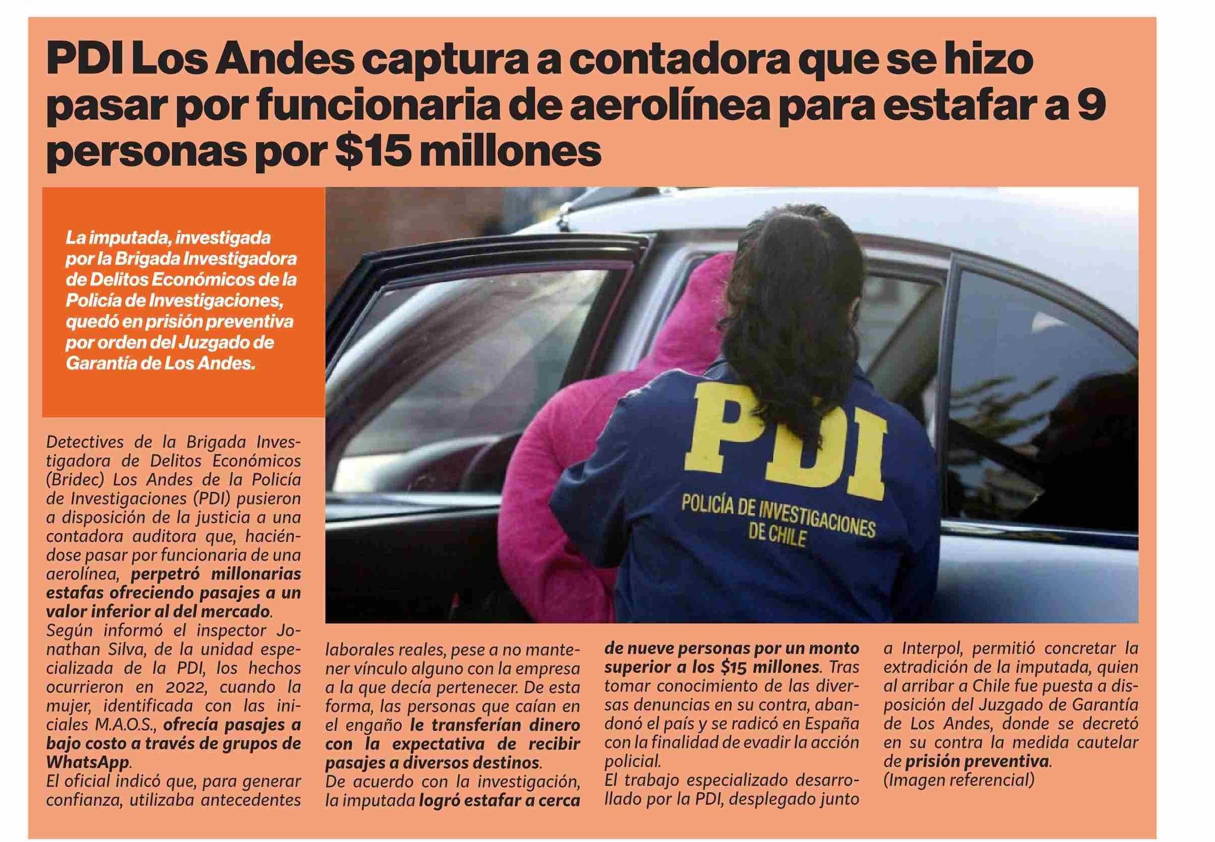 PDI Los Andes captura a contadora que se hizo pasar por funcionaria de aerolínea para estafar a 9 personas por $15 millones 16-02-2026 Puranoticia.cl |