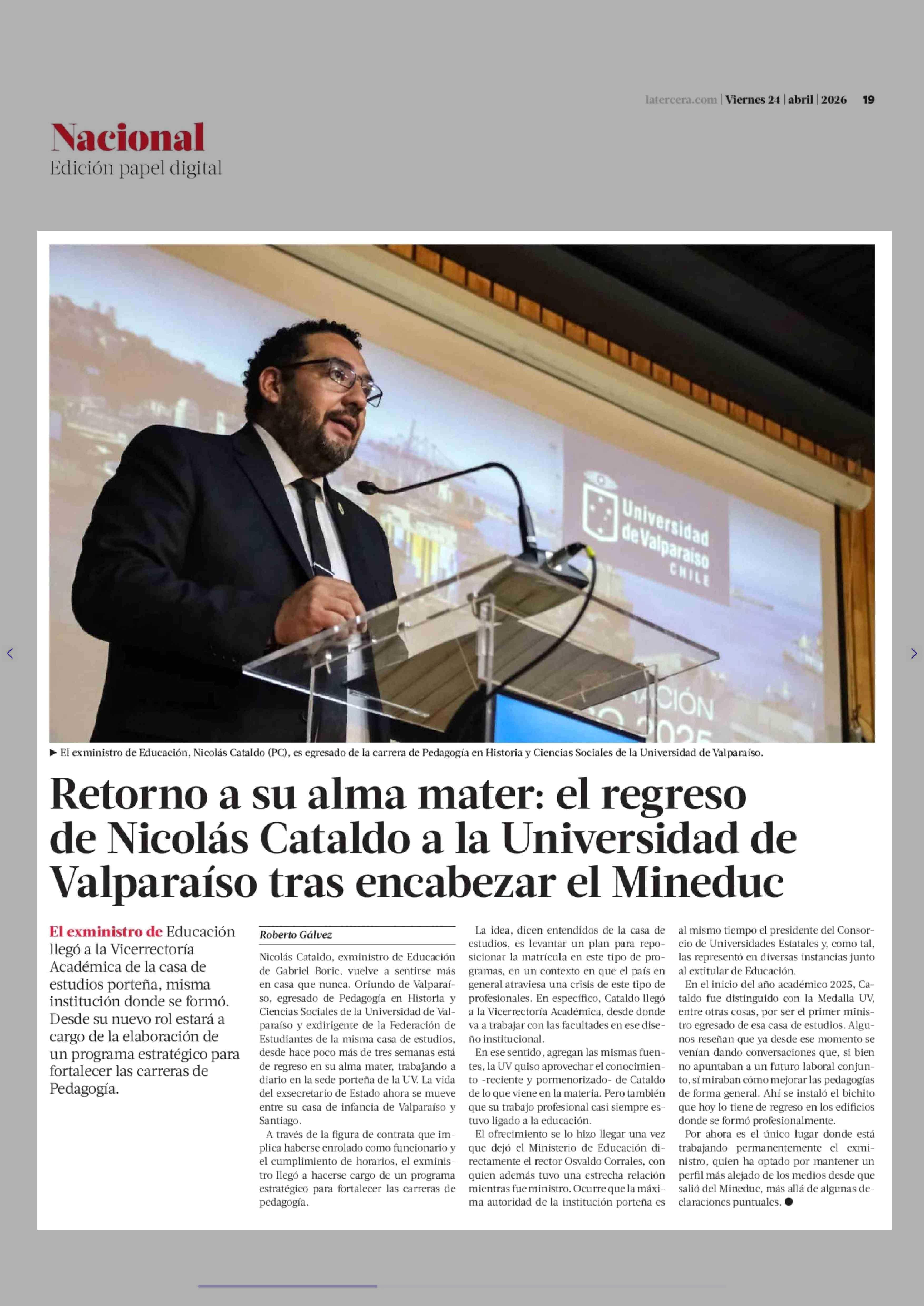 Título: Retorno a su alma mater: el regreso de Nicolás Cataldo a la Universidad de Valparaíso tras encabezar el Mineduc