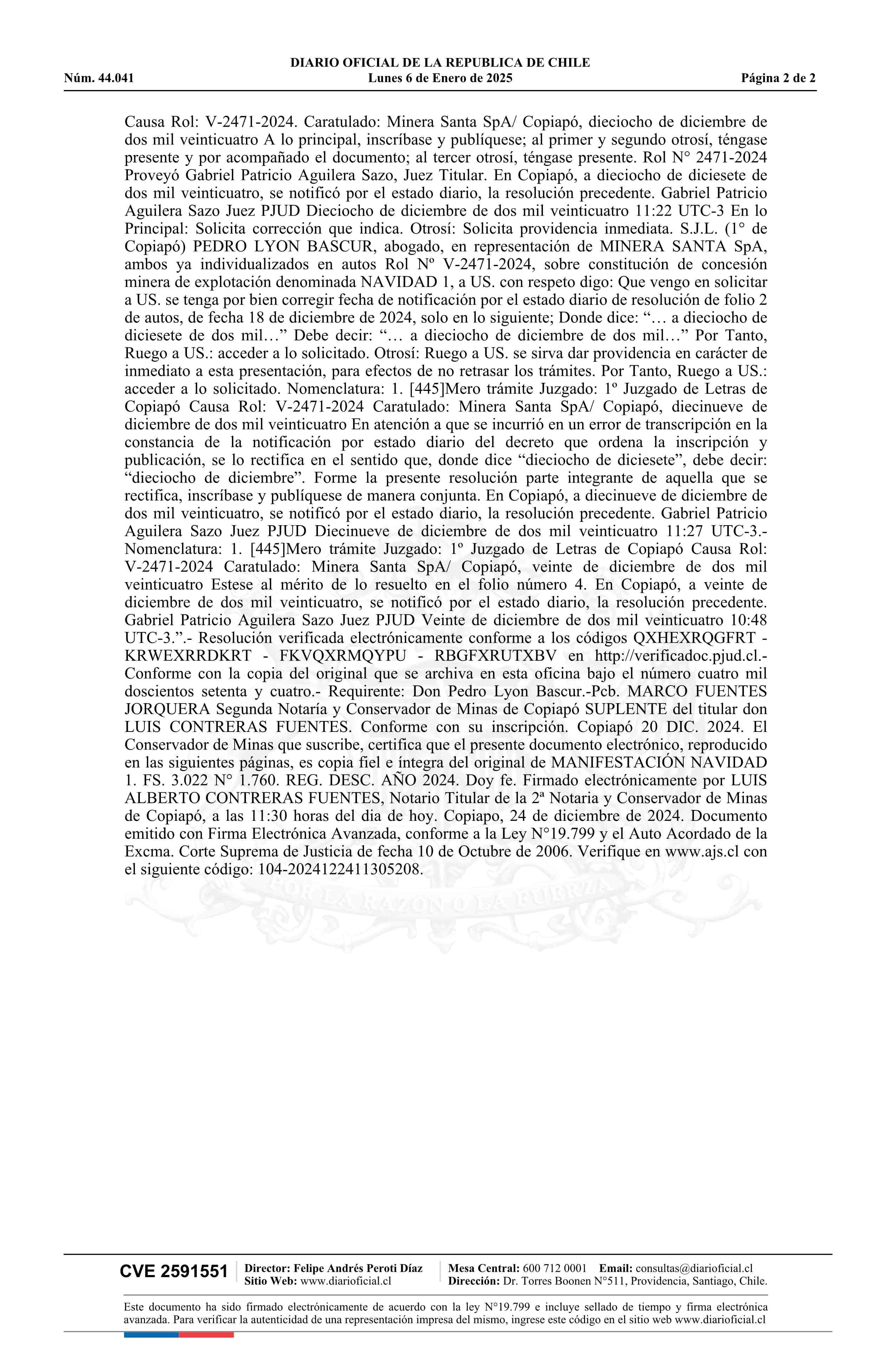 NAVIDAD 1 / Minera Santa SpA 06-01-2025 DIARIO OFICIAL CHILE - BOLETÍN OFICIAL DE MINERÍA |