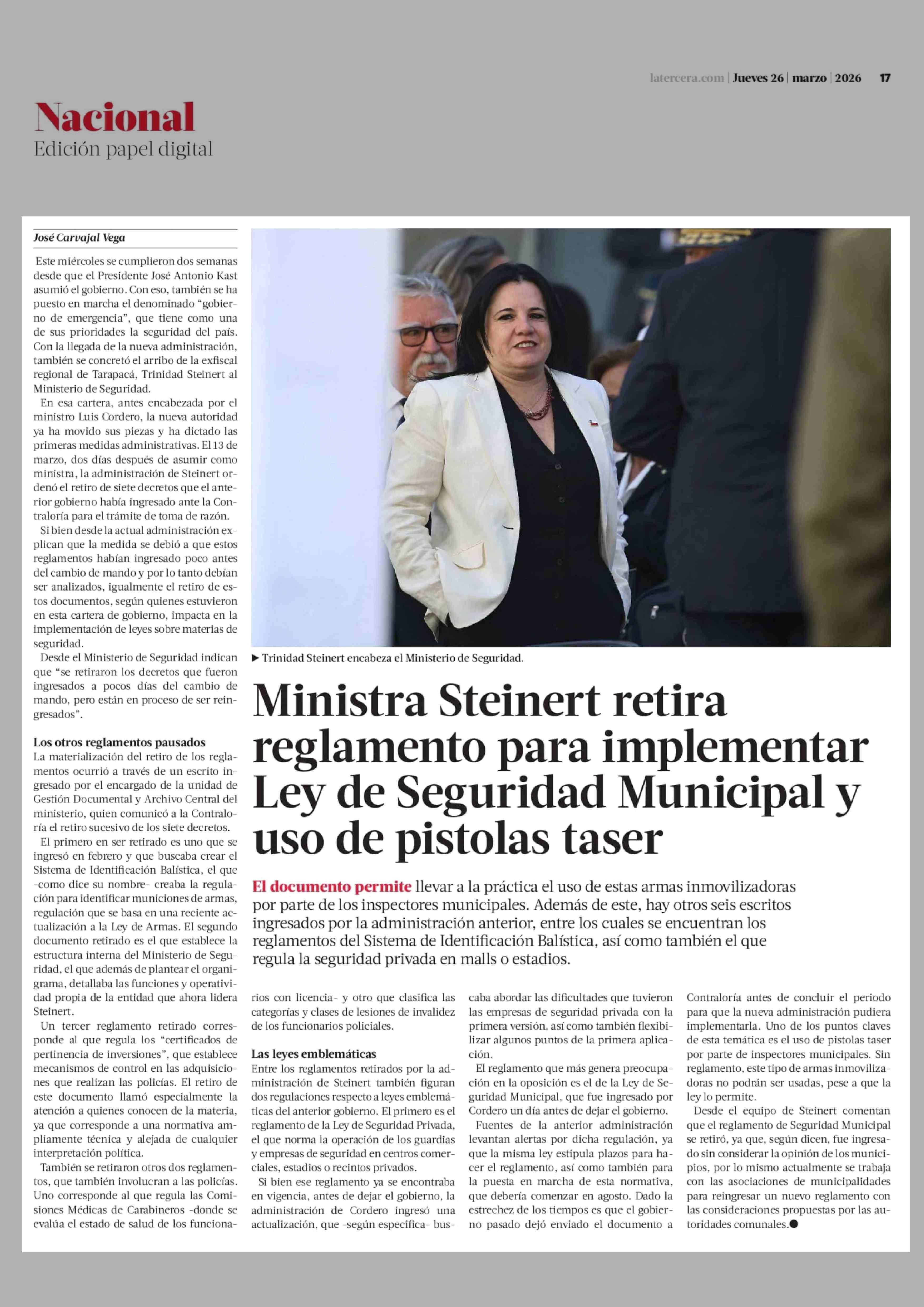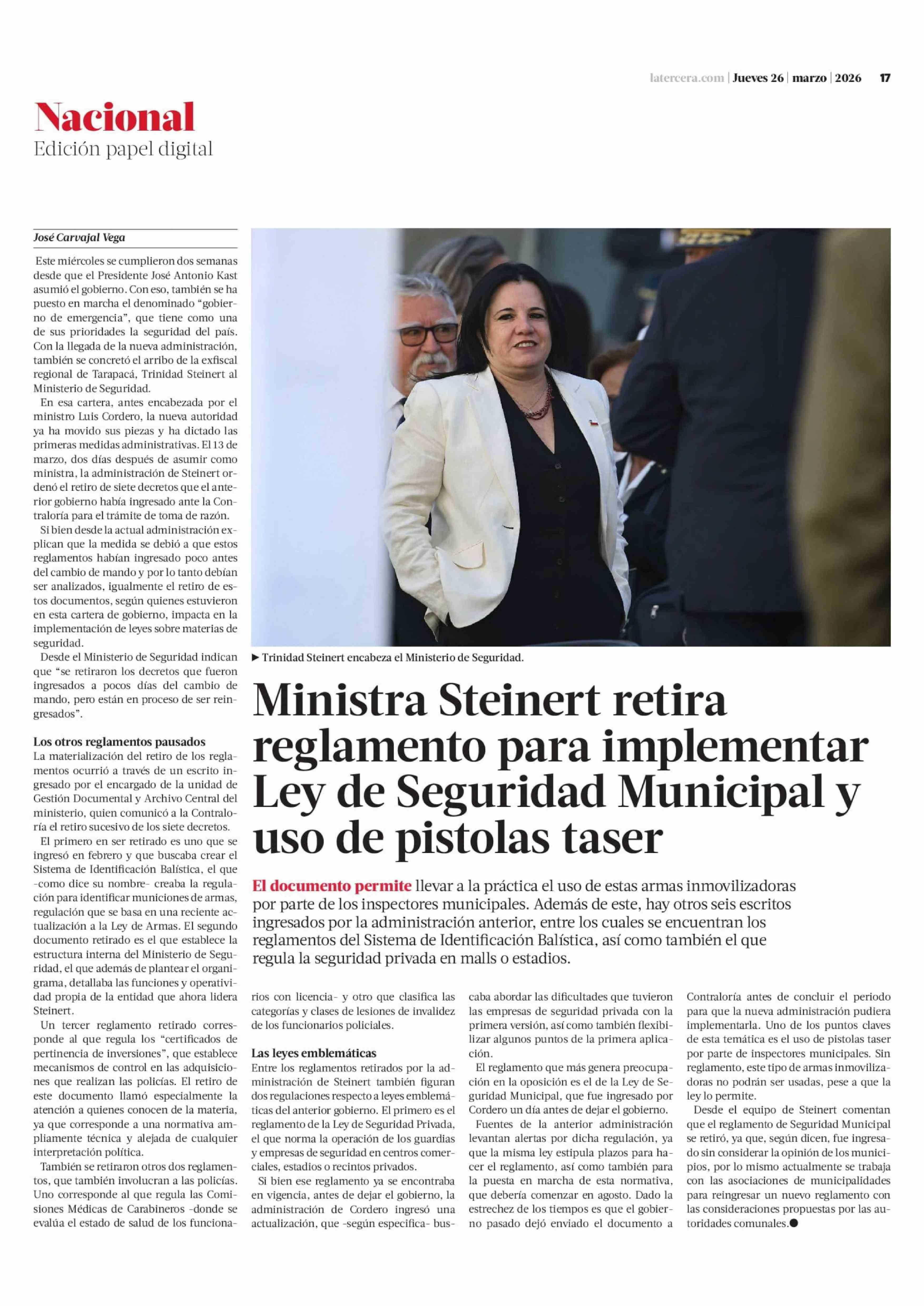 Ministra Steinert retira reglamento para implementar Ley de Seguridad Municipal y uso de pistolas taser 26-03-2026 La Tercera |