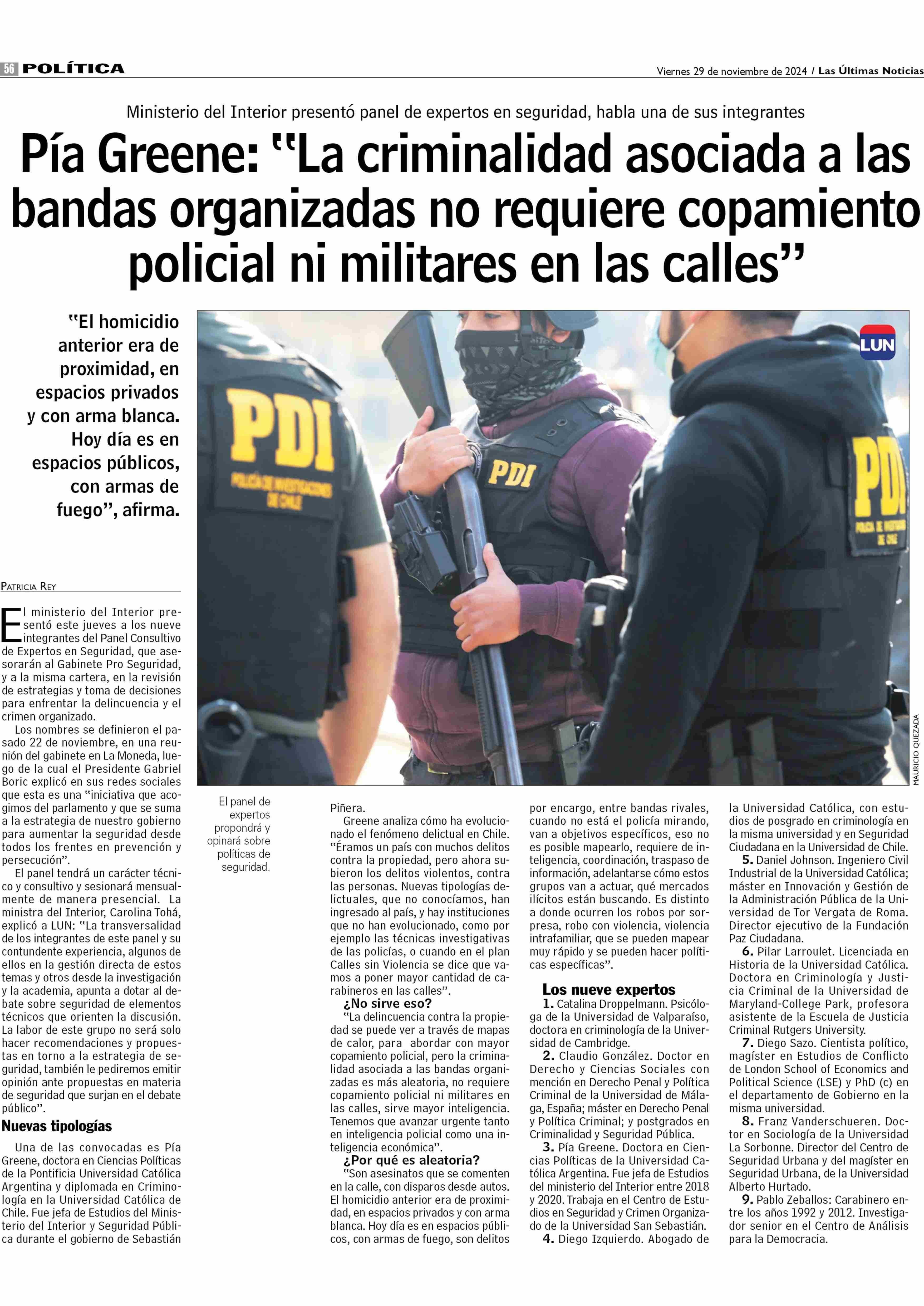 | Título: | Pía Greene: “La criminalidad asociada a las bandas organizadas no requiere copamiento policial ni militares en las calles” |