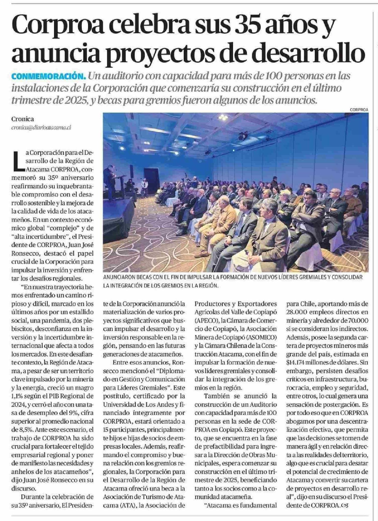 Corproa celebra sus 35 años y anuncia proyectos de desarrollo 18-06-2025 El Diario de Atacama |