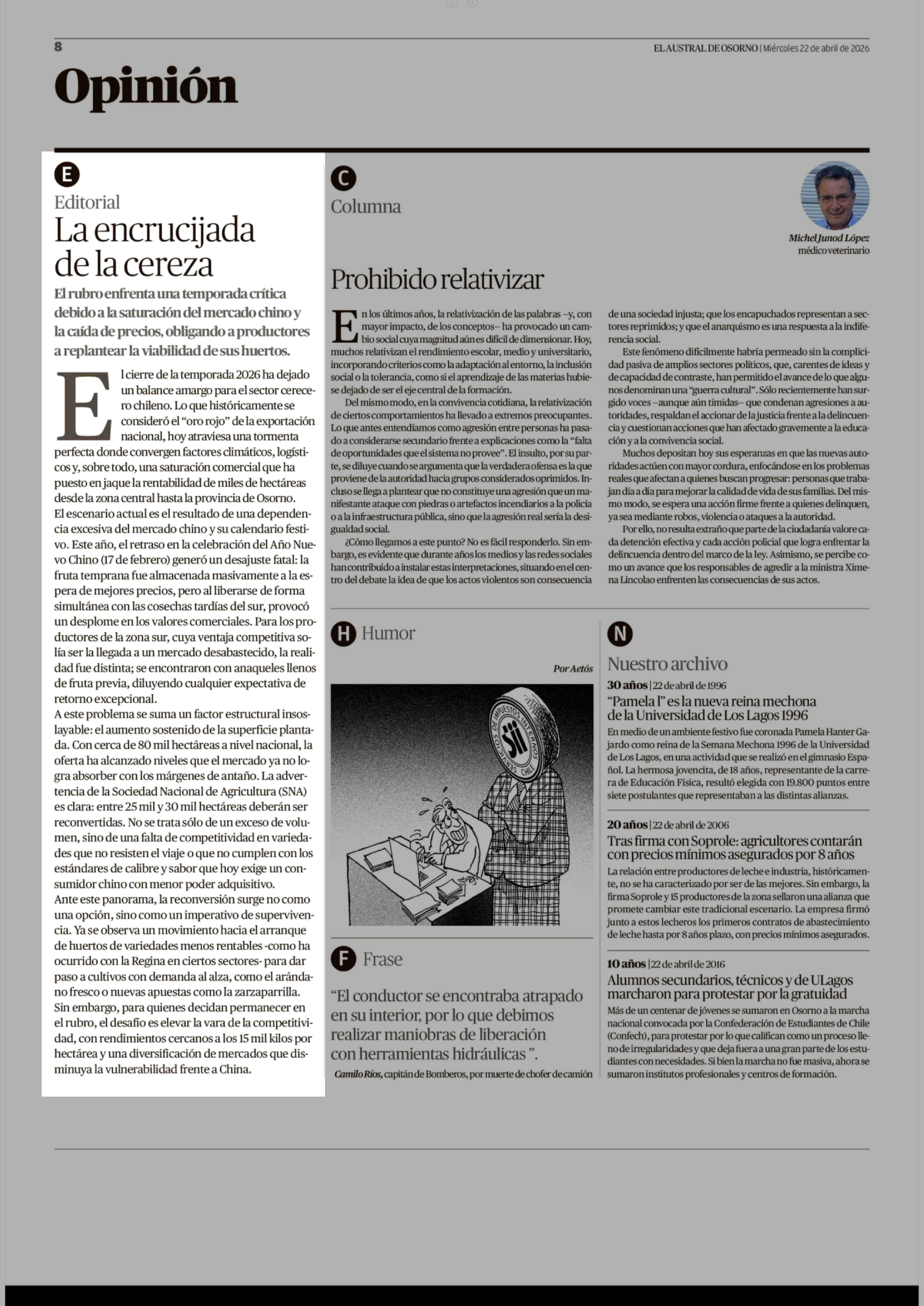 Editorial: La encrucijada de la cereza 22-04-2026 El Austral de Osorno |