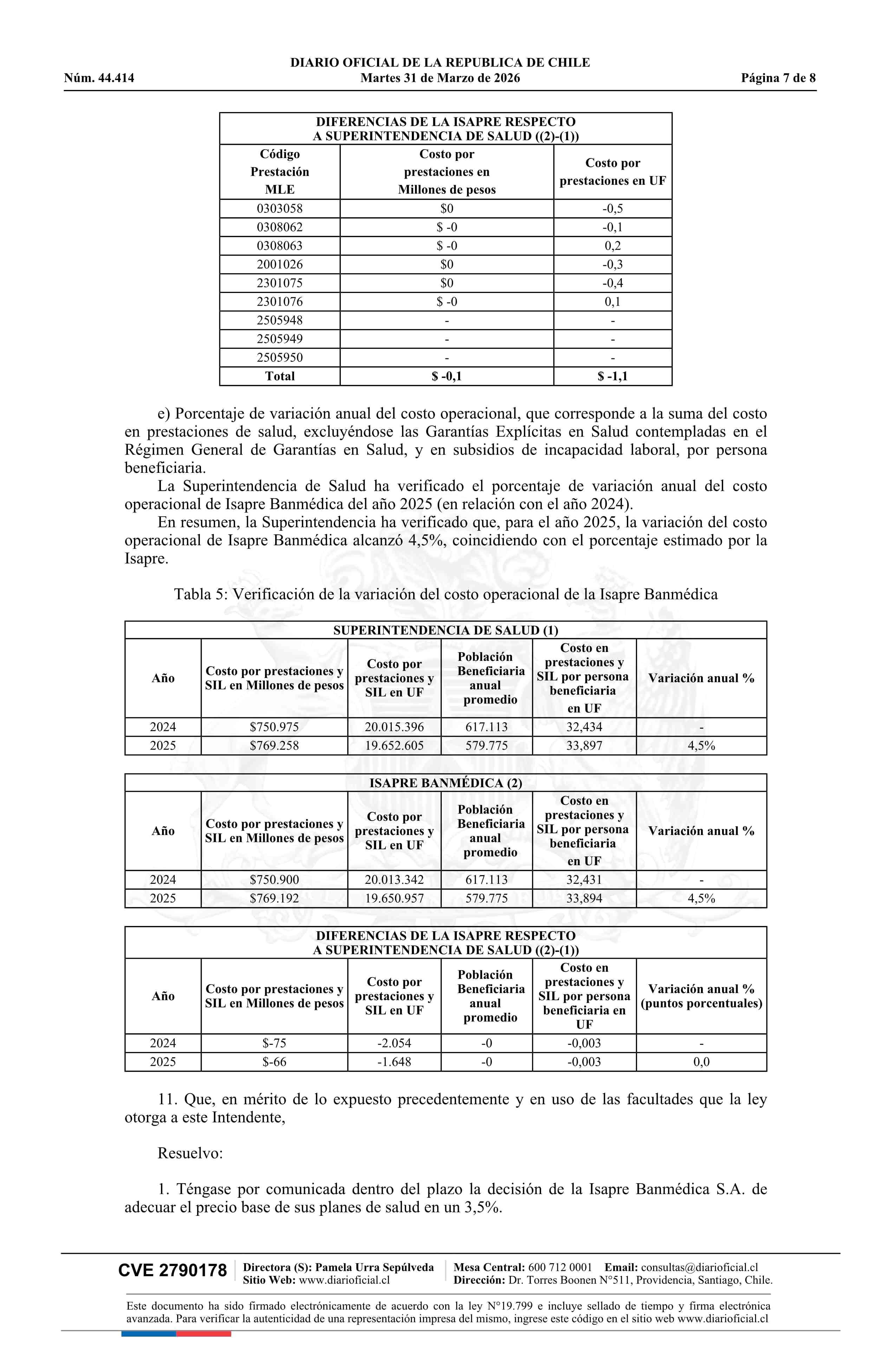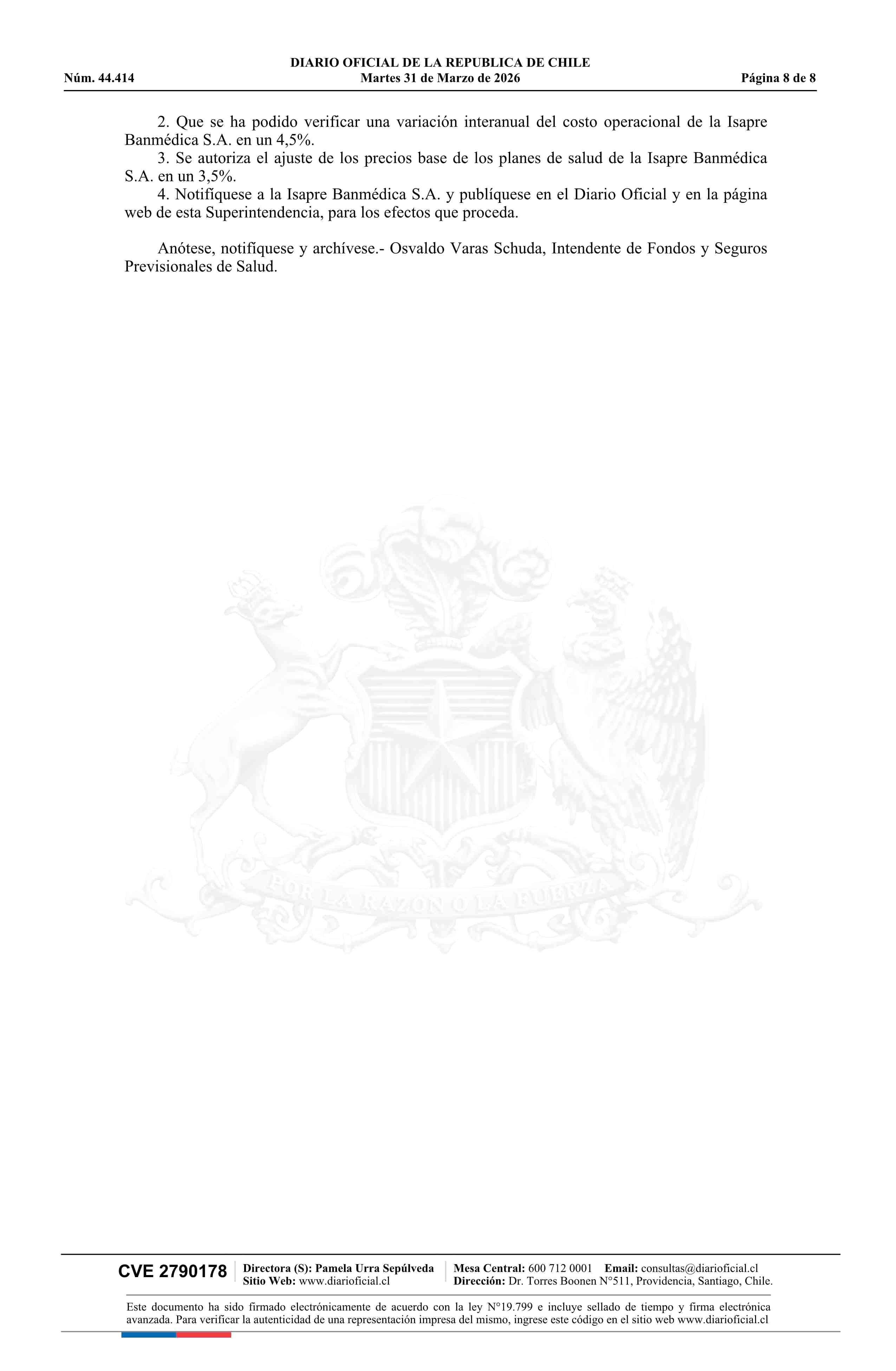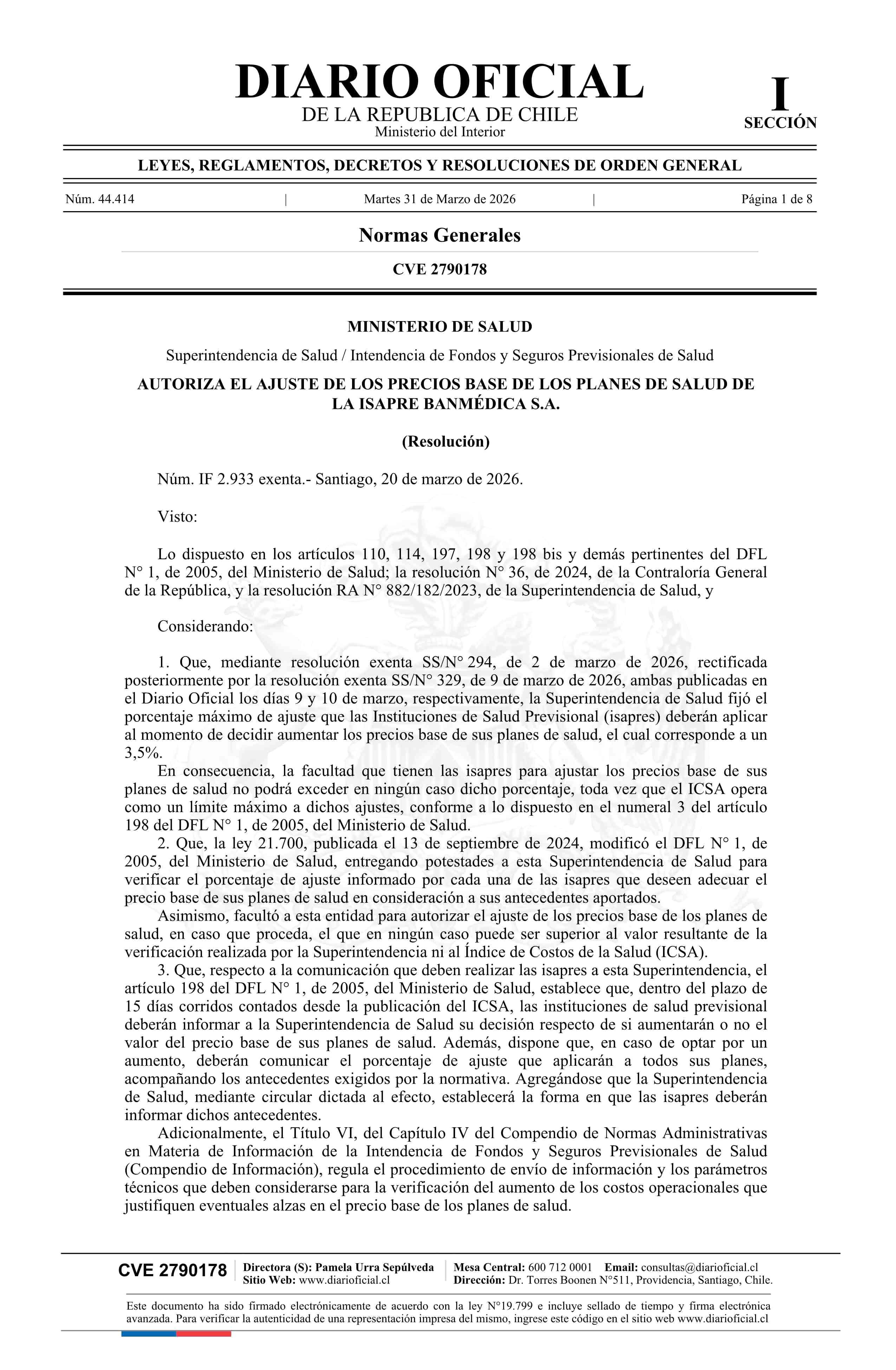 Resolución exenta número IF 2.933, de 2026.- Autoriza el ajuste de los precios base de los planes de salud de la Isapre Banmédica S.A. 31-03-2026 Diario Oficial Edición Electrónica |