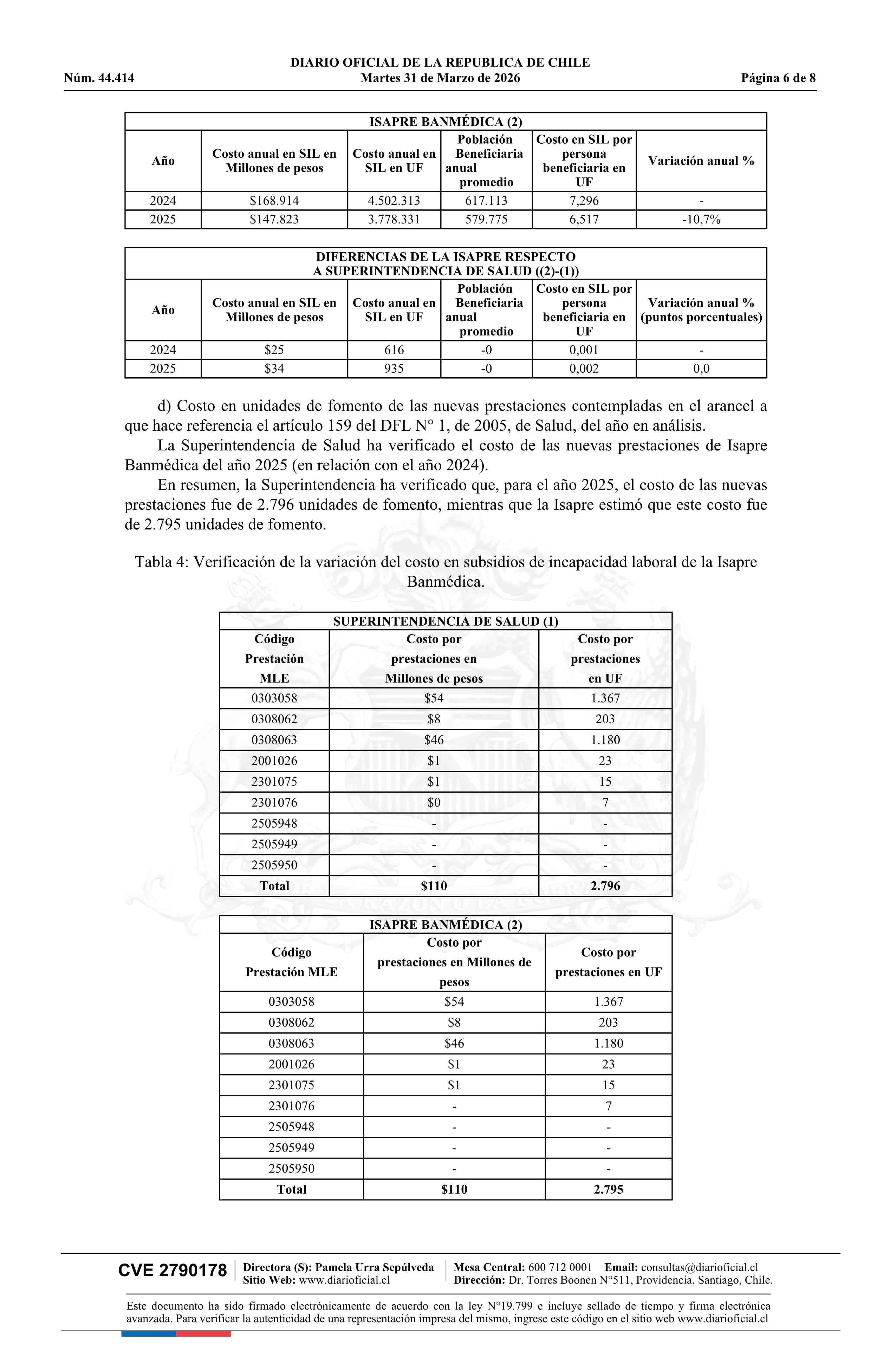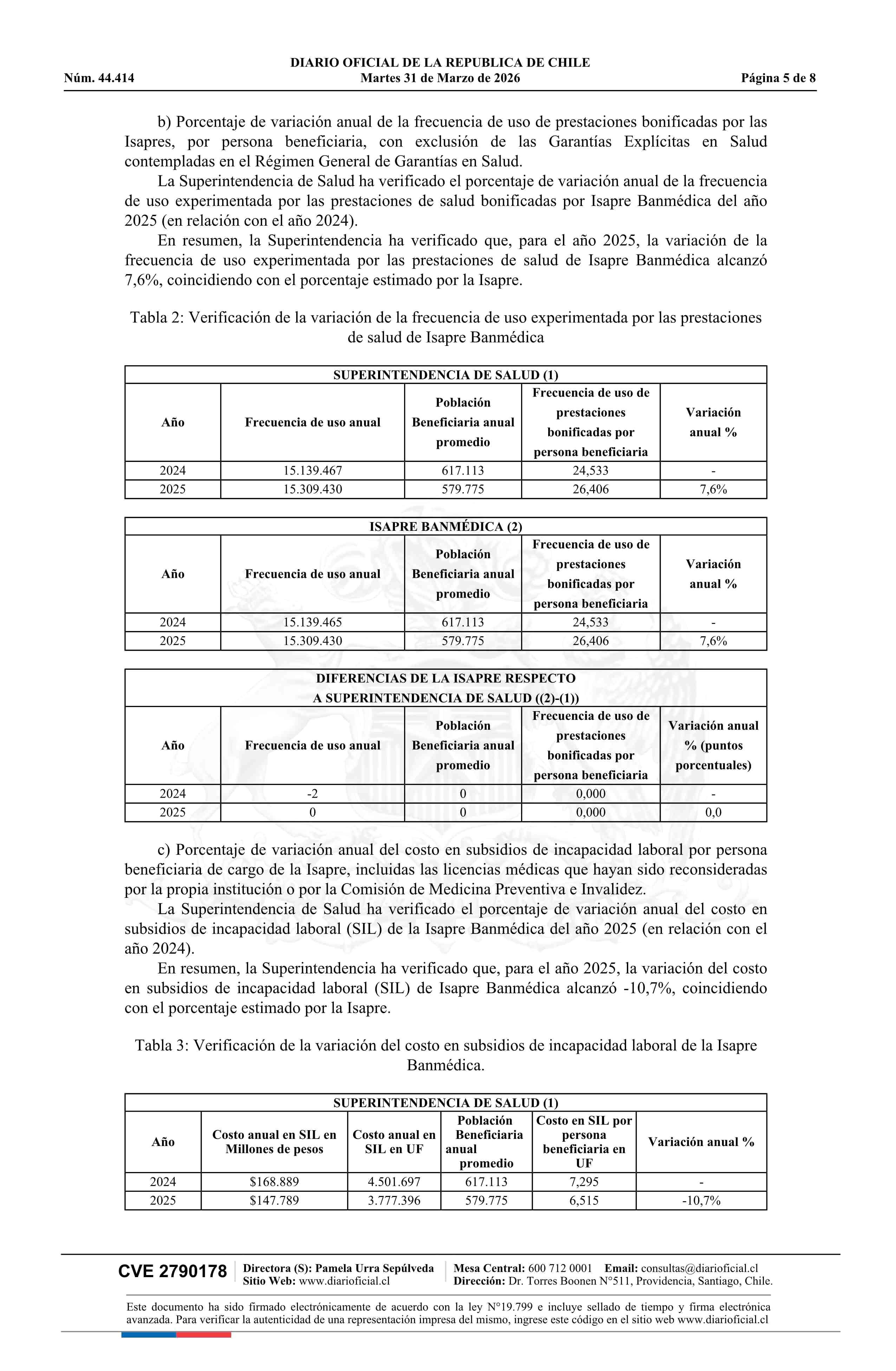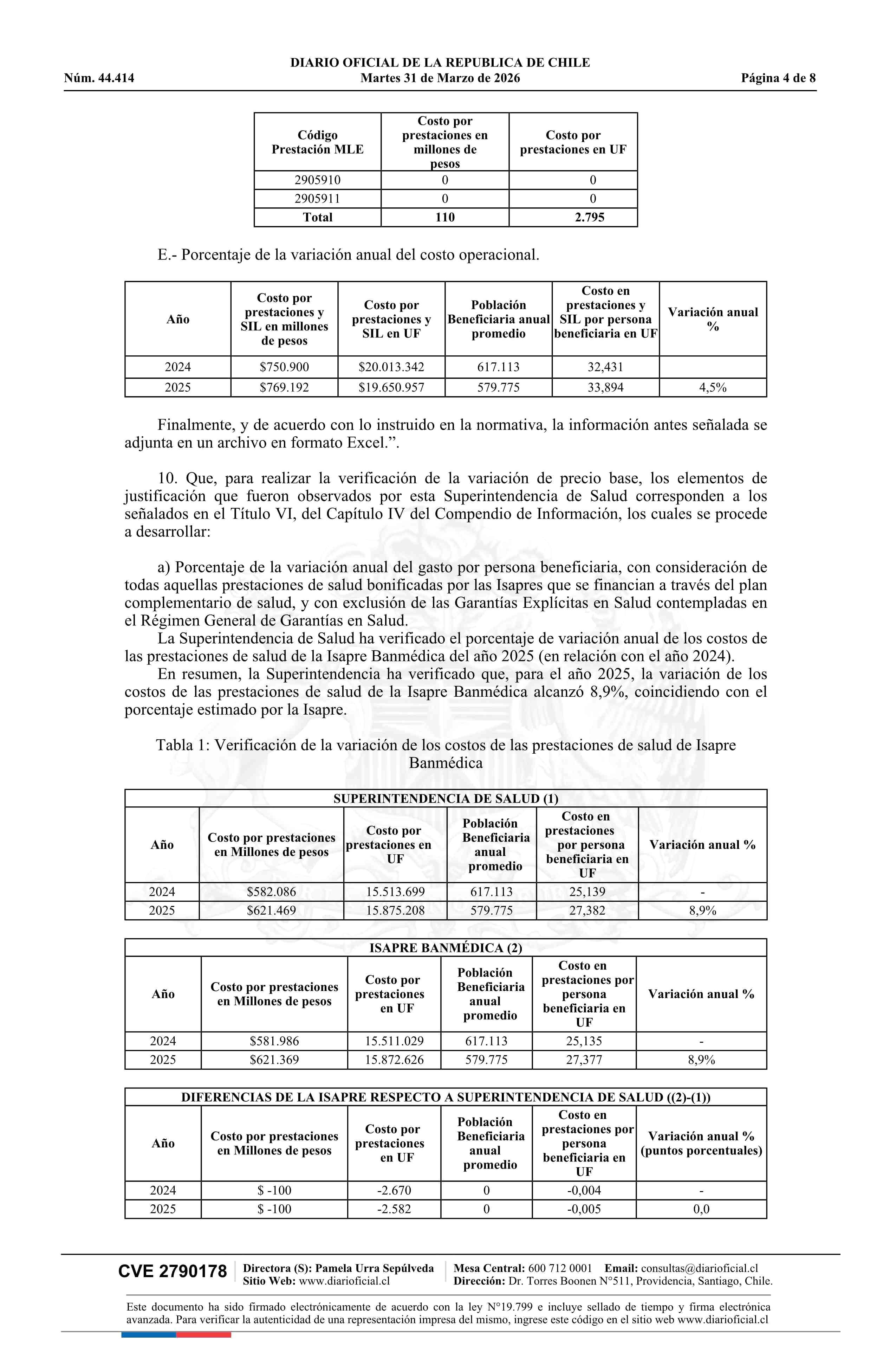 Resolución exenta número IF 2.933, de 2026.- Autoriza el ajuste de los precios base de los planes de salud de la Isapre Banmédica S.A. 31-03-2026 Diario Oficial Edición Electrónica |