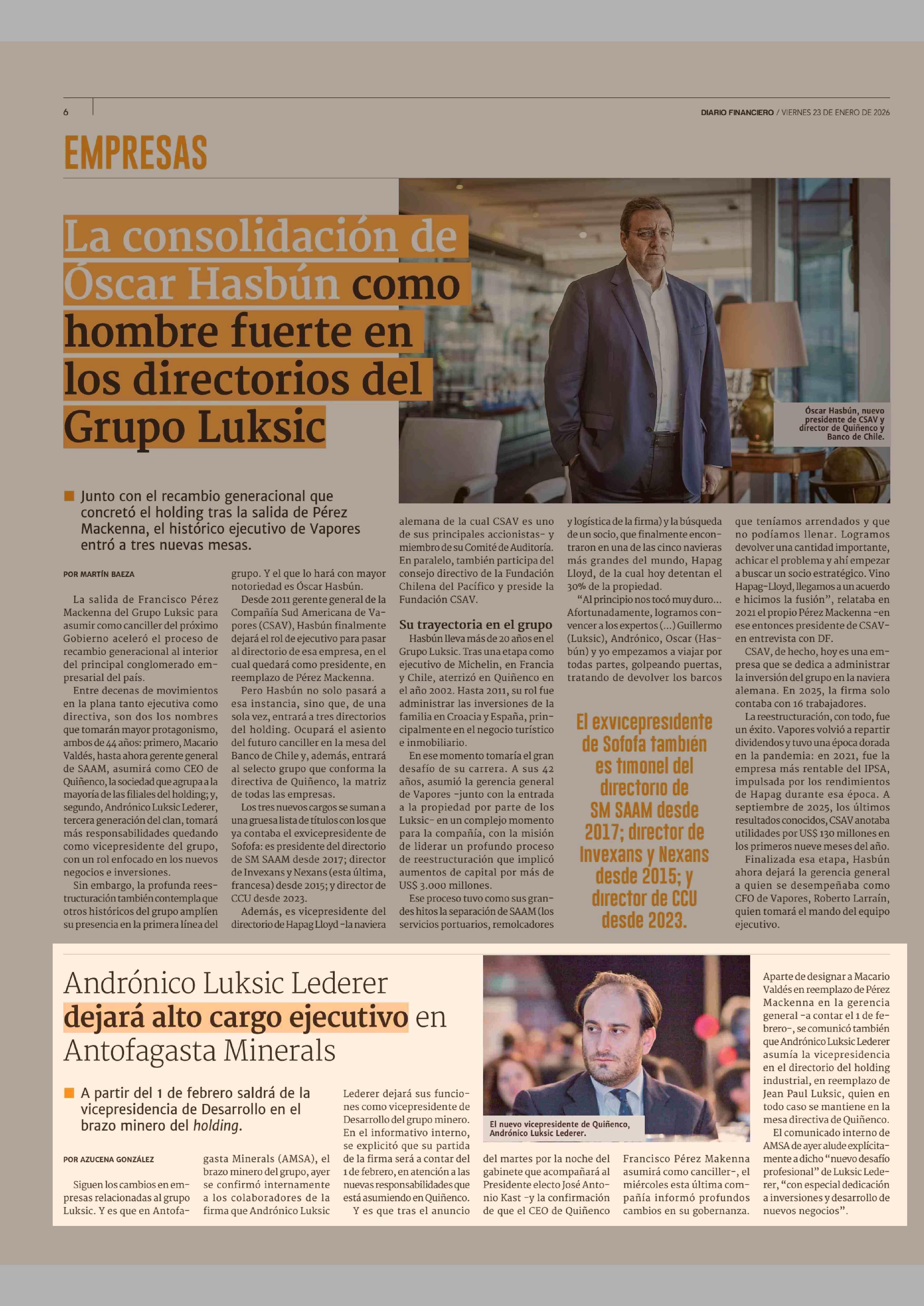 Andrónico Luksic Lederer dejará alto cargo ejecutivo en Antofagasta Minerals 23-01-2026 Diario Financiero |