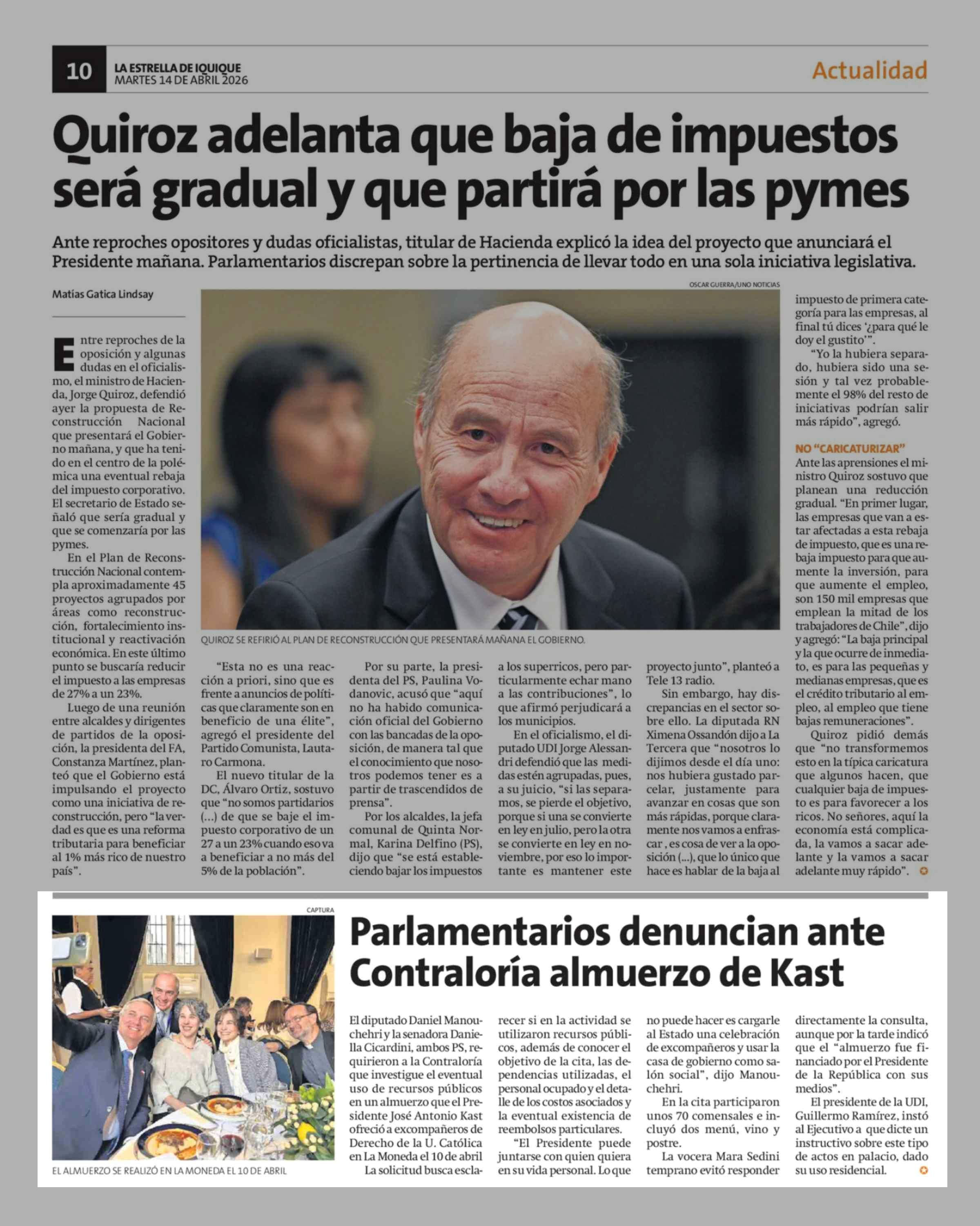 Parlamentarios denuncian ante Contraloría almuerzo de Kast 14-04-2026 La Estrella de Iquique |