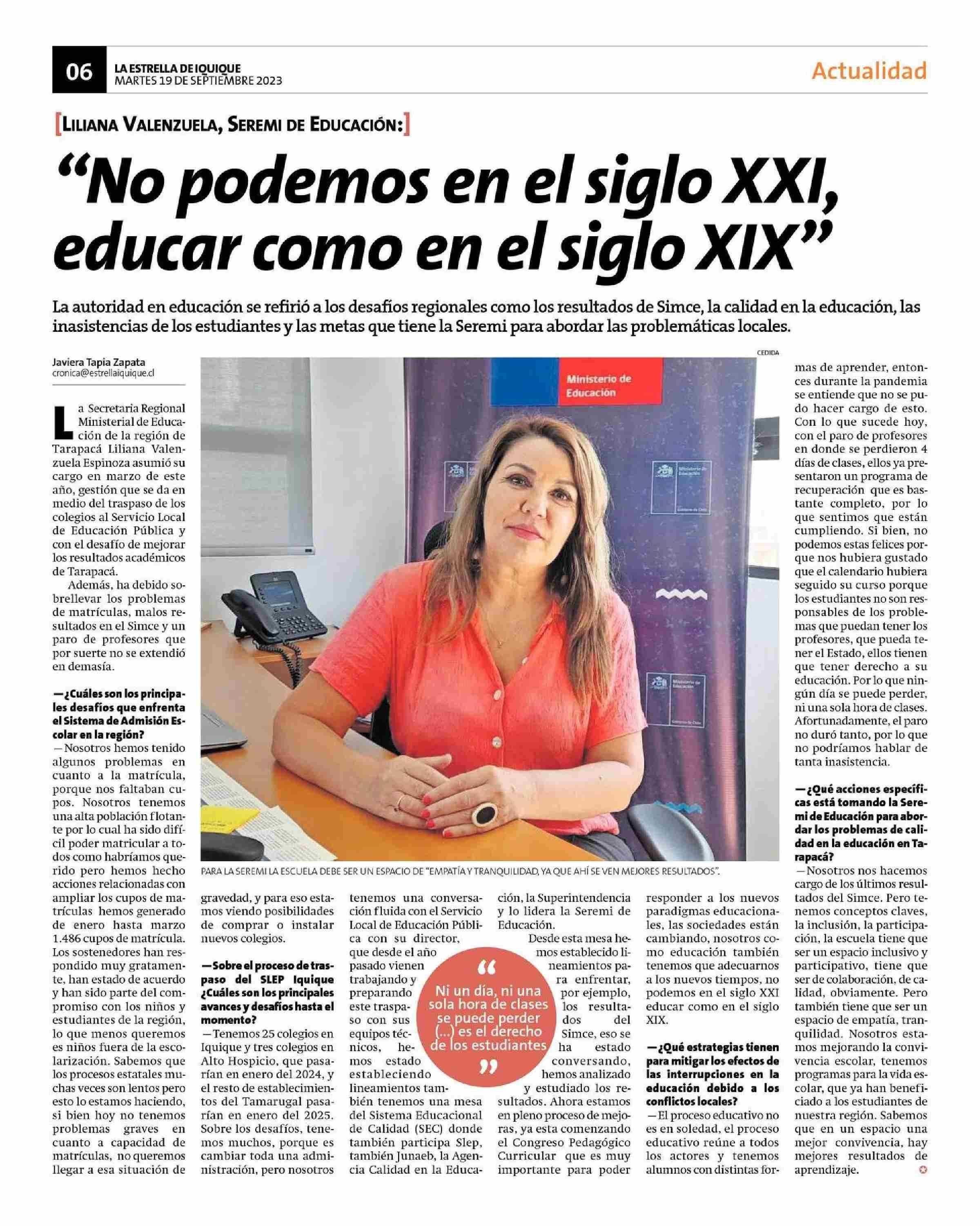 "No podemos en el siglo XXI, educar como en el siglo XIX" 19-09-2023 La Estrella de Iquique |