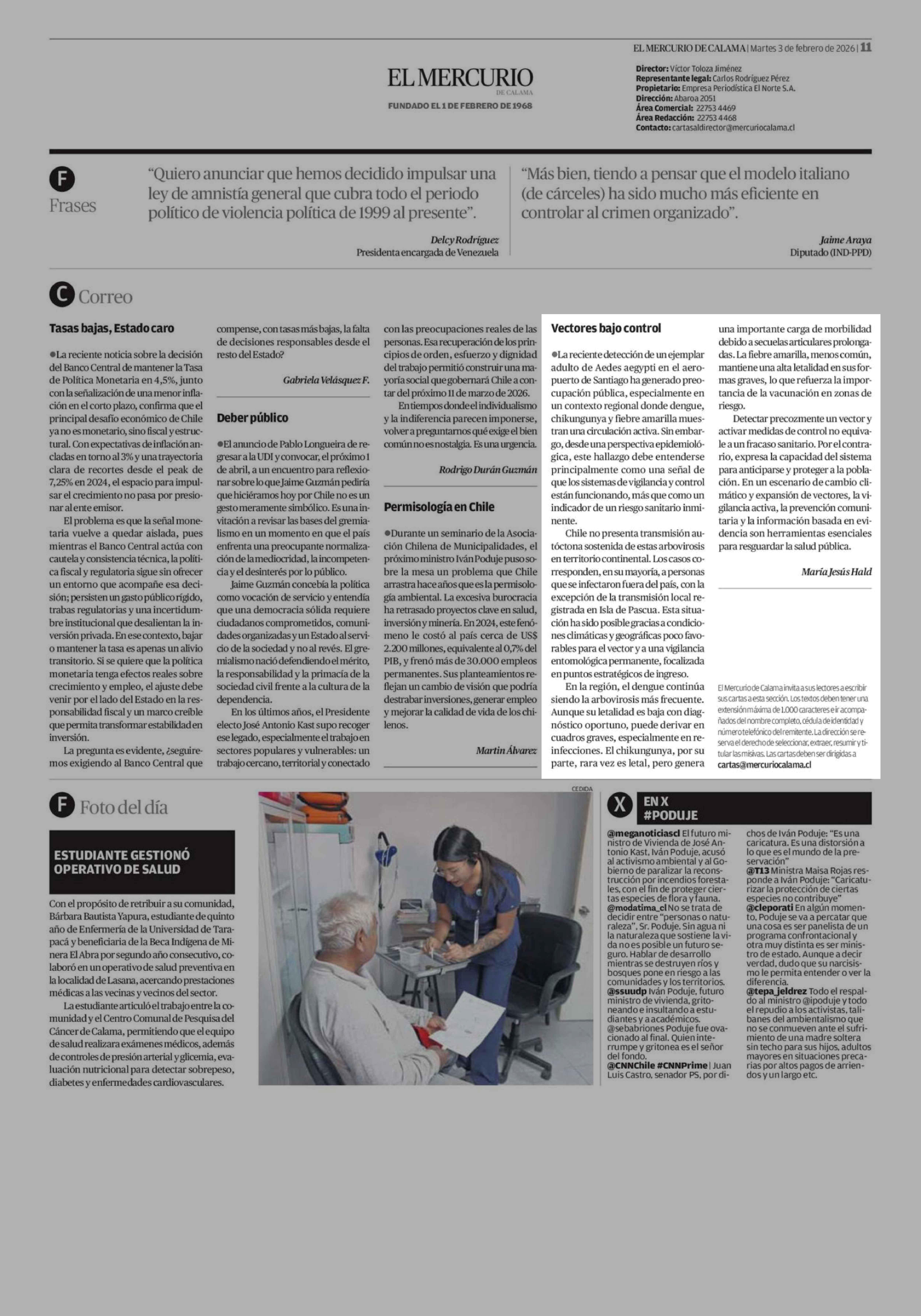 Cartas: Vectores bajo control 03-02-2026 El Mercurio de Calama |
