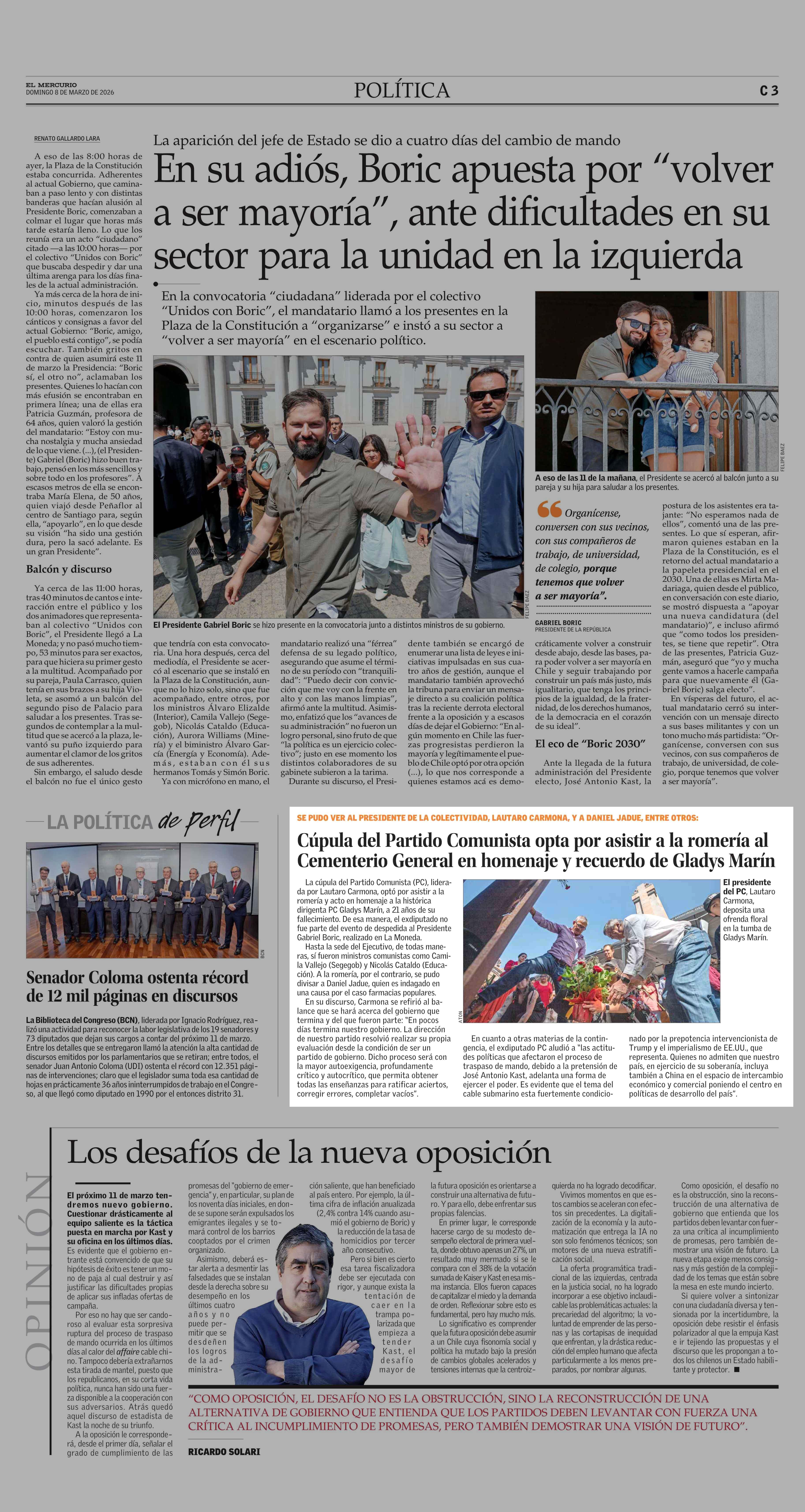 Cúpula del Partido Comunista opta por asistir a la romería al Cementerio General en homenaje y recuerdo de Gladys Marín 08-03-2026 El Mercurio |