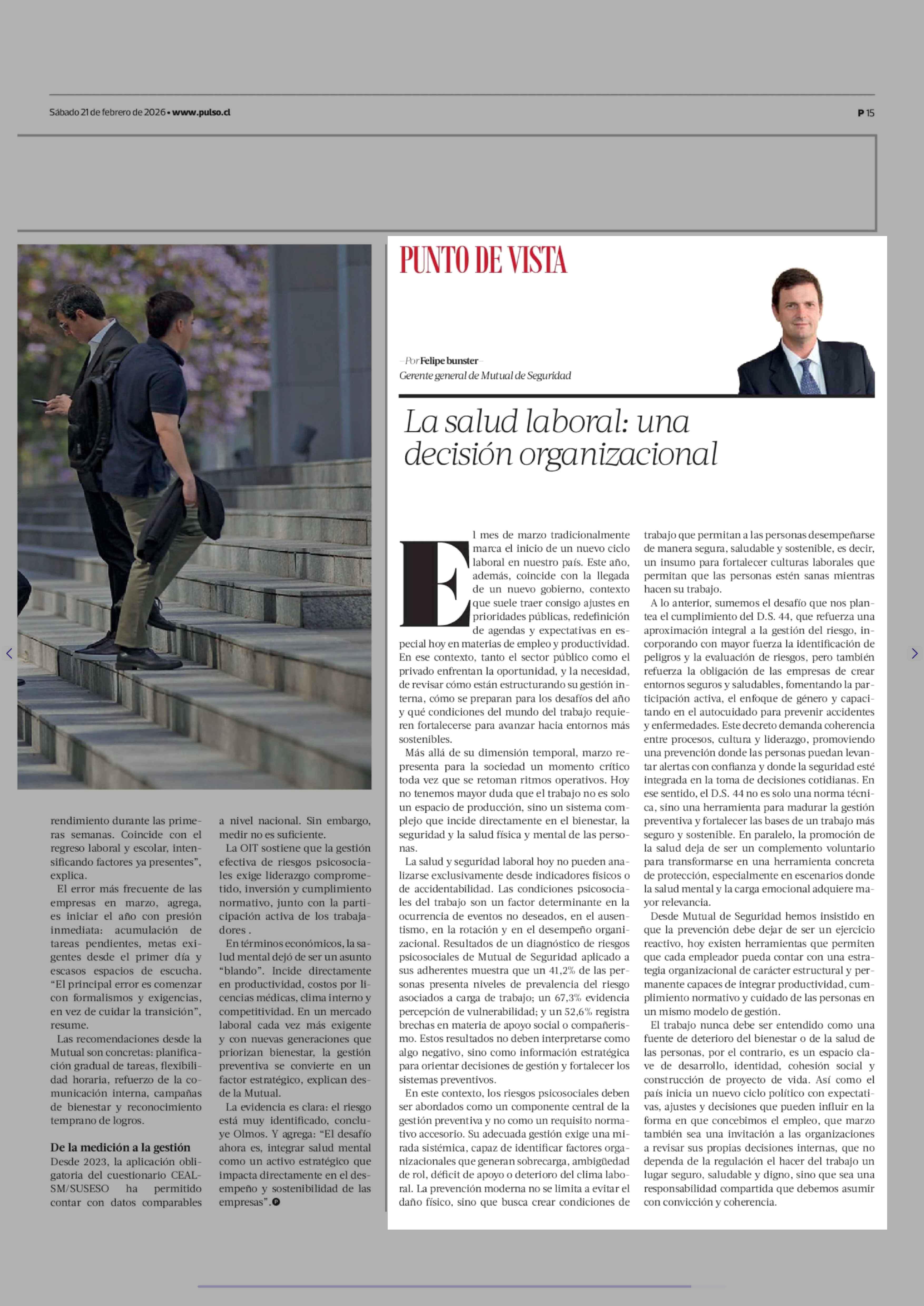 Columnas de Opinión: La salud laboral: una decisión organizacional 21-02-2026 La Tercera |
