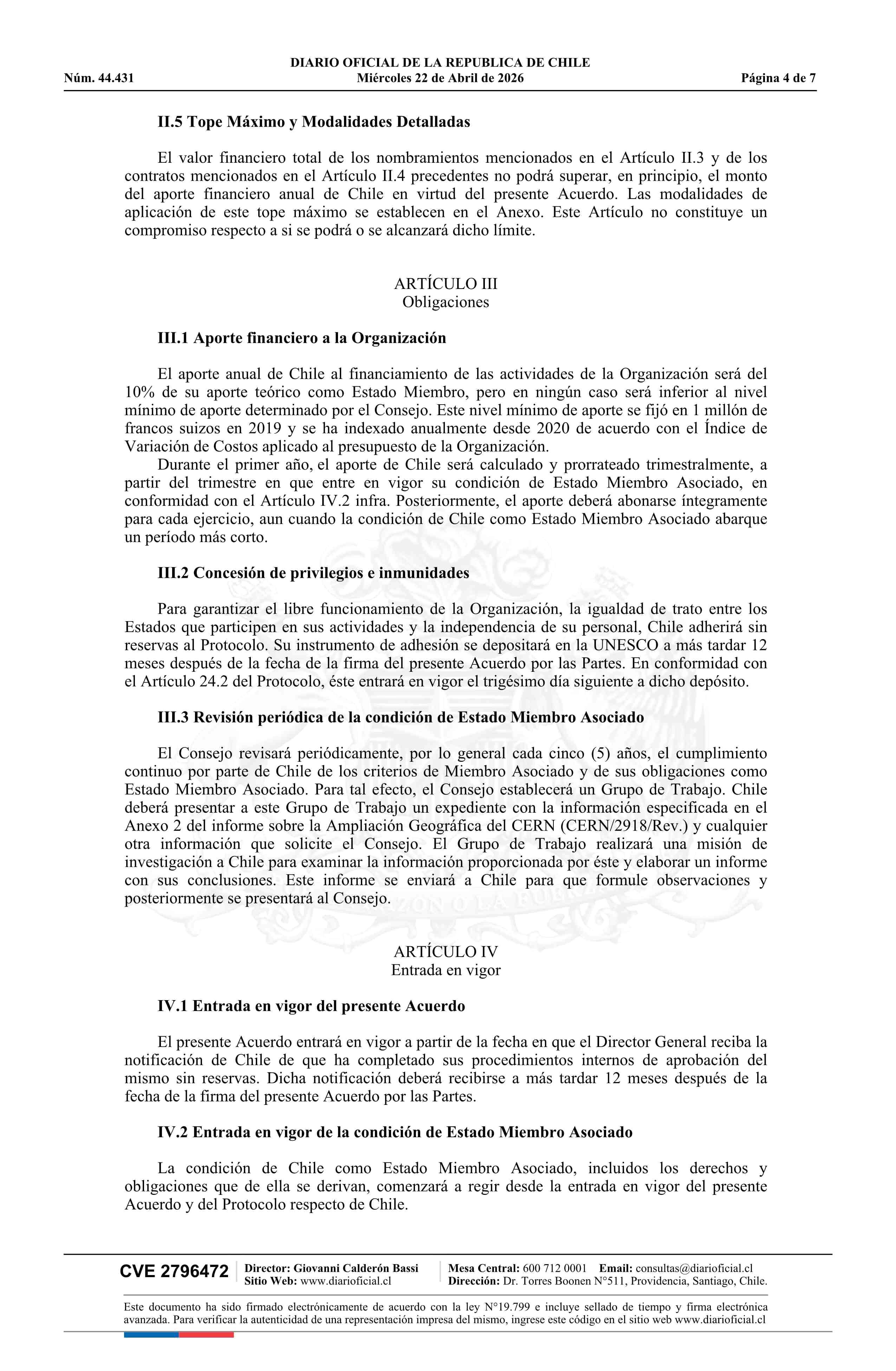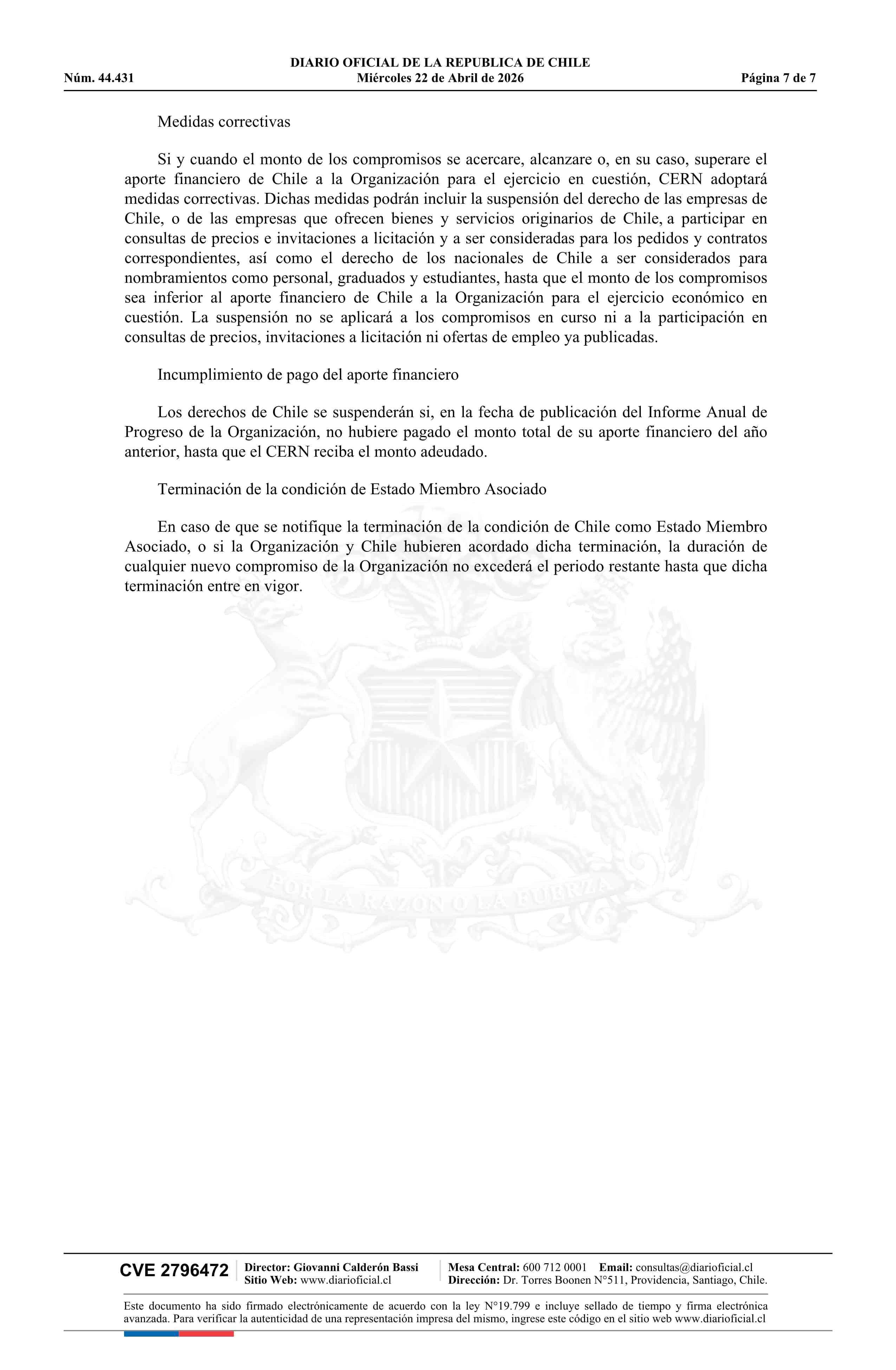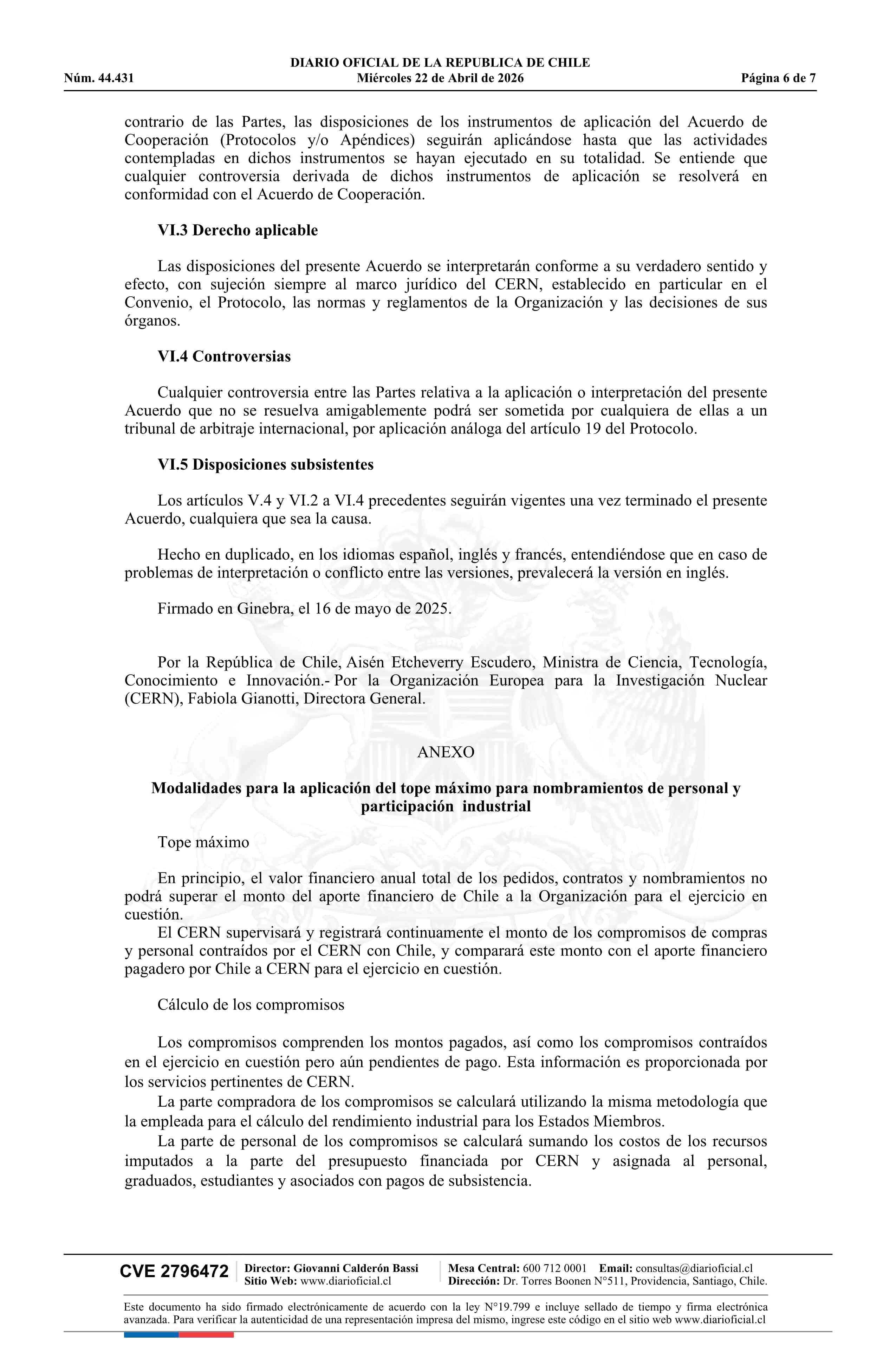 Título: Decreto número 60, de 2026.- Promulga el Acuerdo entre la República de Chile y la Organización Europea para la Investigación Nuclear (CERN) en relación con el otorgamiento de la Condición de Estado Miembro Asociado del CERN