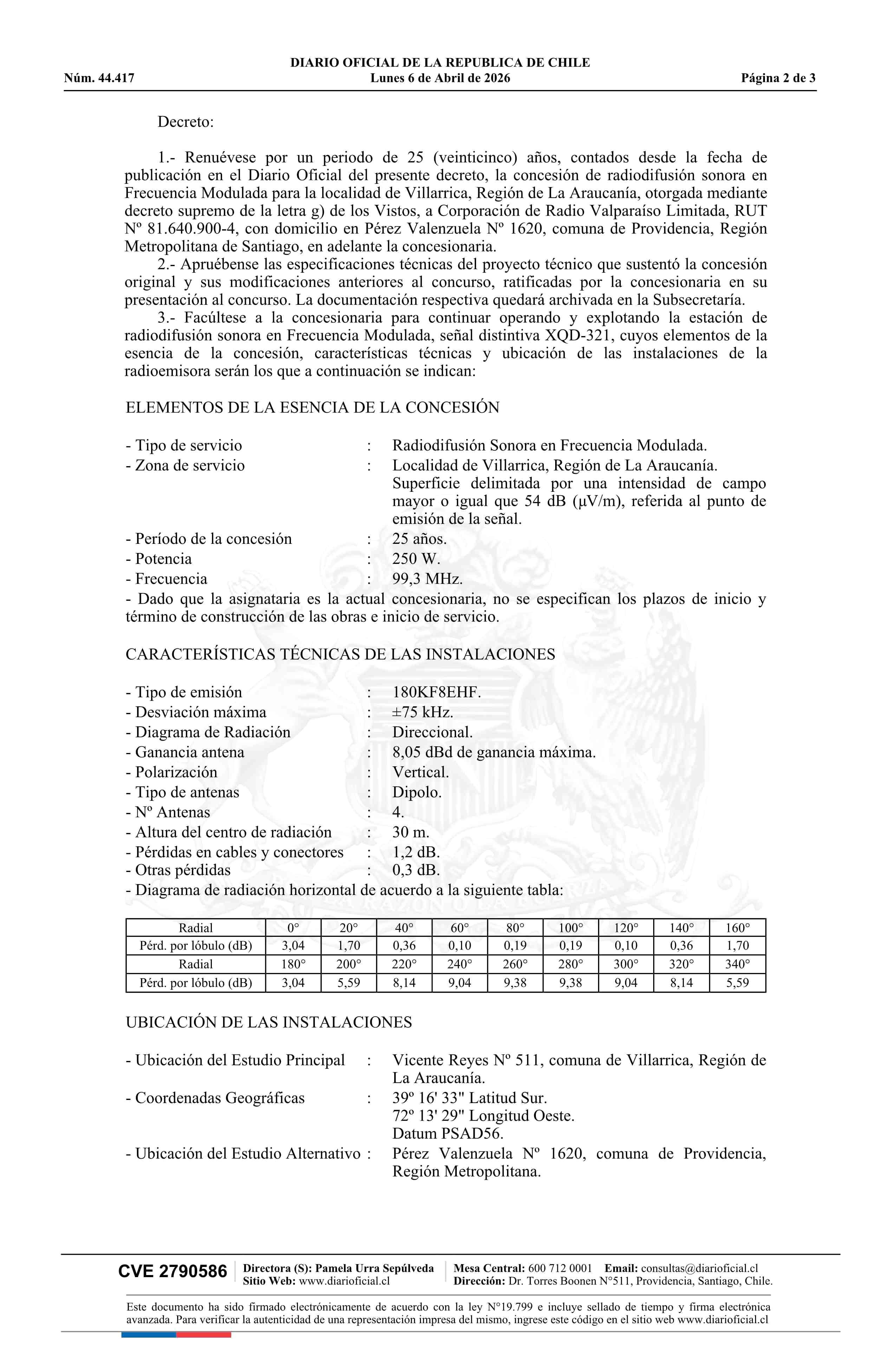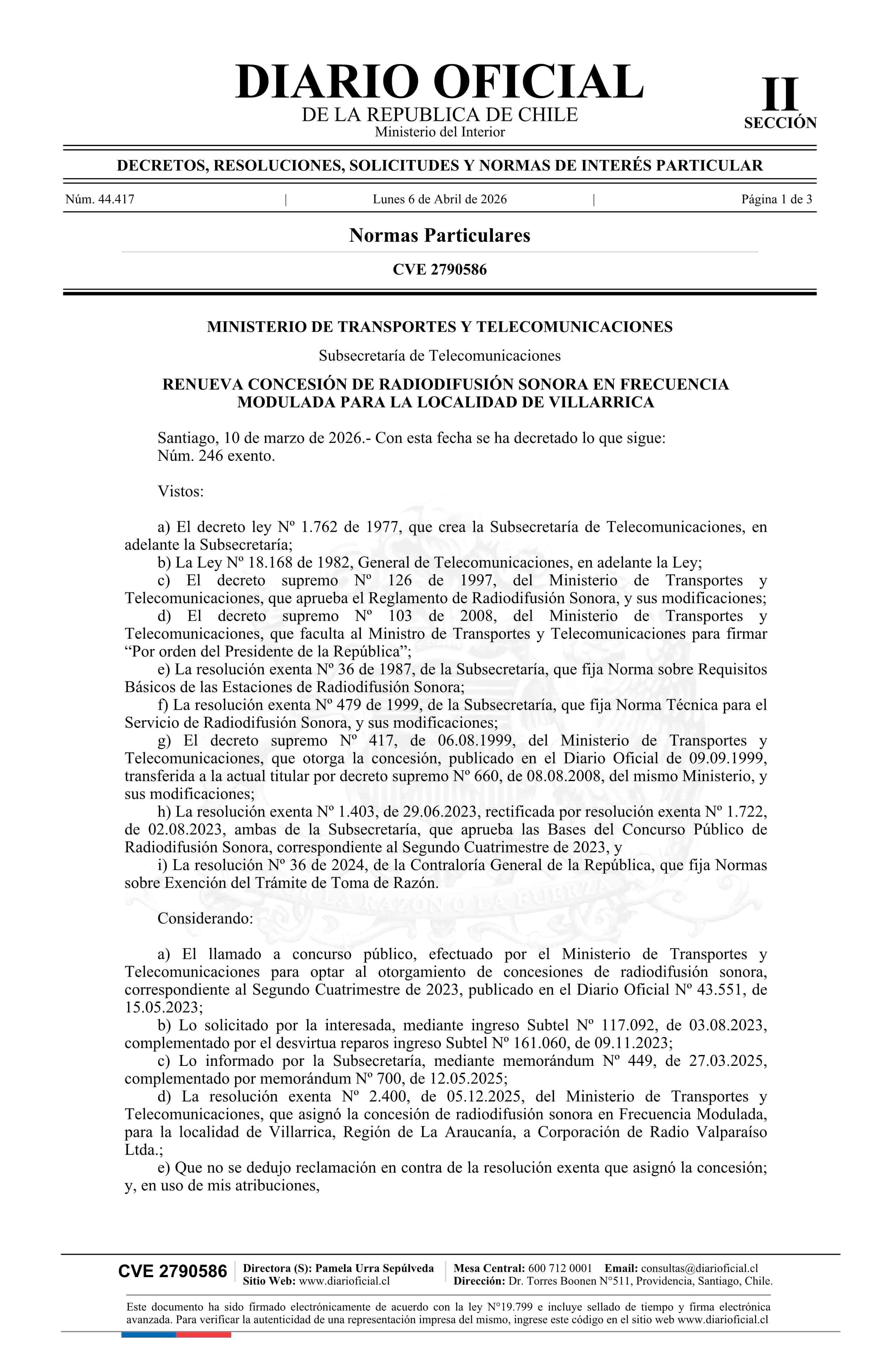 Decreto exento número 246, de 2026.- Renueva concesión de radiodifusión sonora en frecuencia modulada para la localidad de Villarrica 06-04-2026 Diario Oficial Edición Electrónica |
