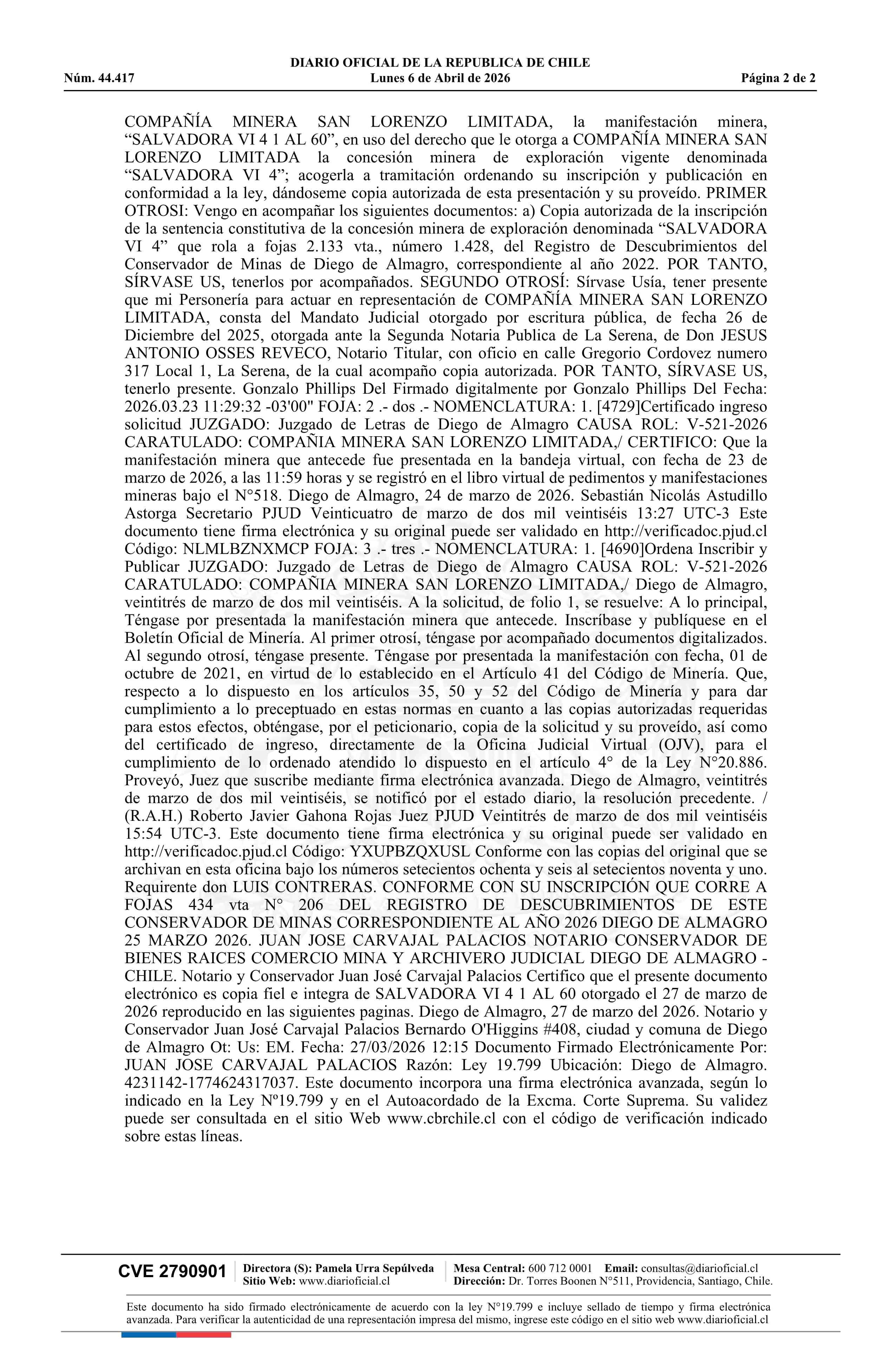 SALVADORA VI 4 1 AL 60 / Compañía Minera San Lorenzo Limitada 06-04-2026 DIARIO OFICIAL CHILE - BOLETÍN OFICIAL DE MINERÍA |