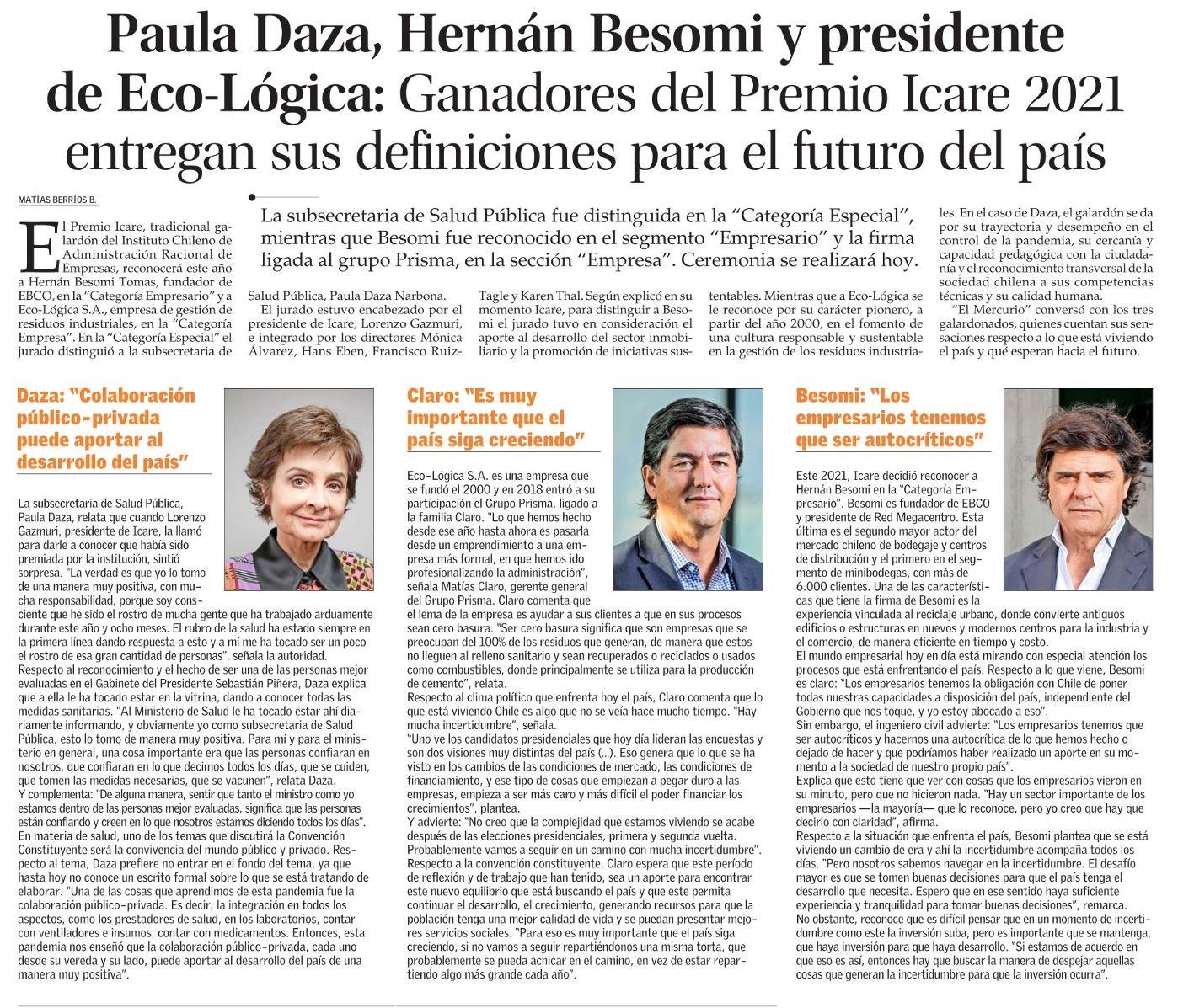 Paula Daza, Hernán Besomi y presidente de Eco-Lógica: Ganadores del Premio Icare 2021 entregan sus definiciones para el futuro del país 05-11-2021 El Mercurio |